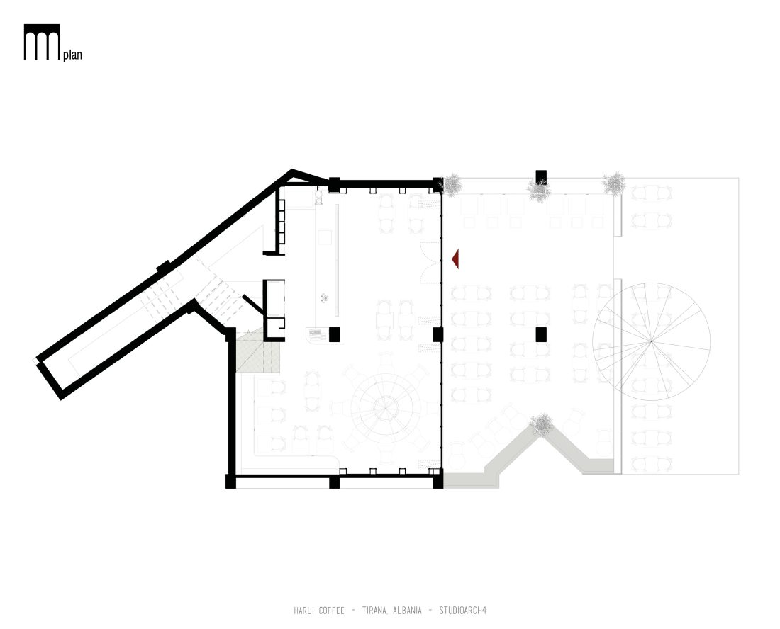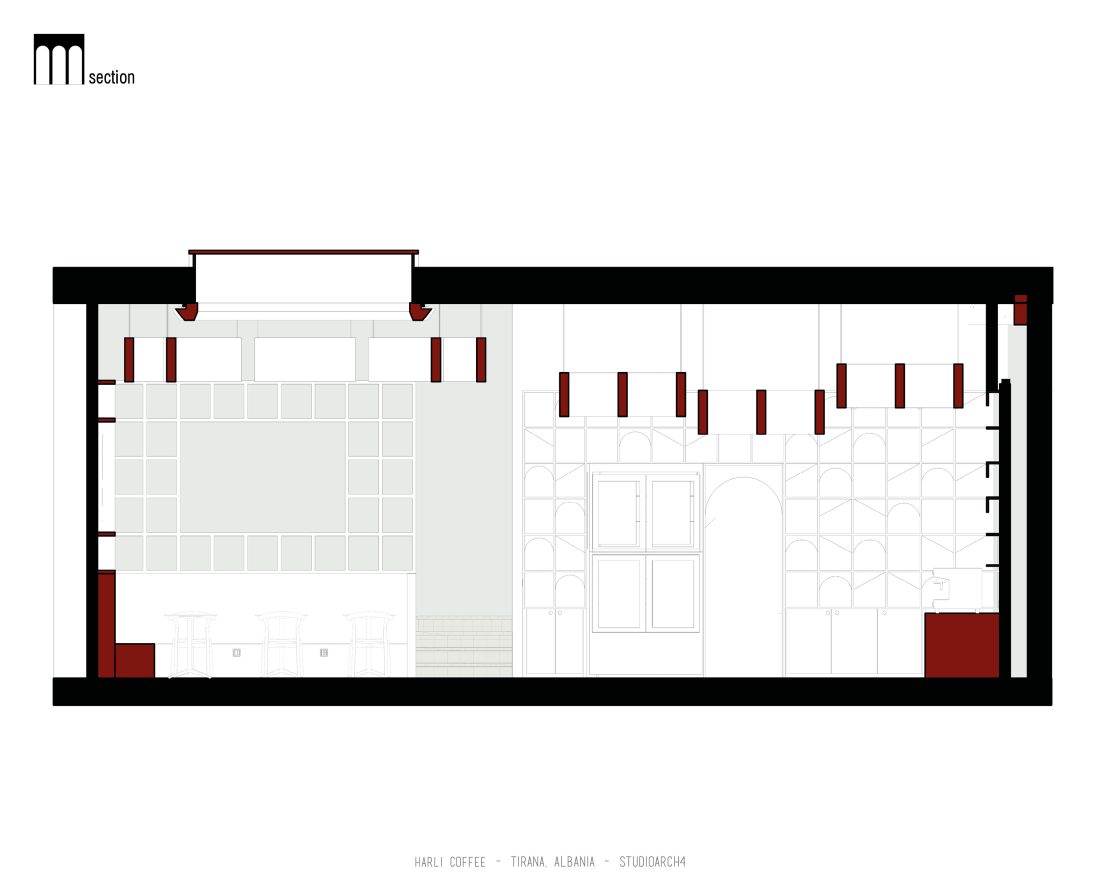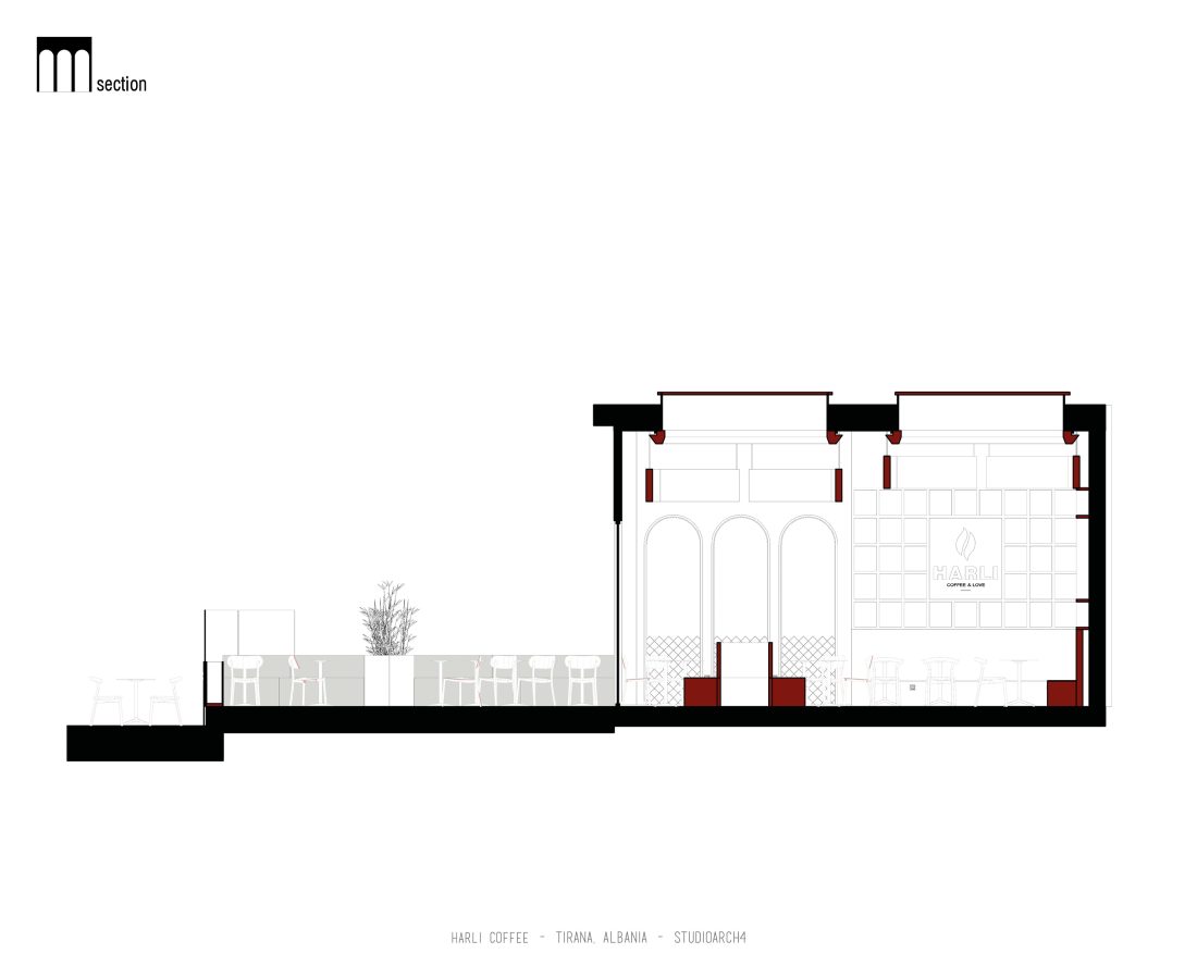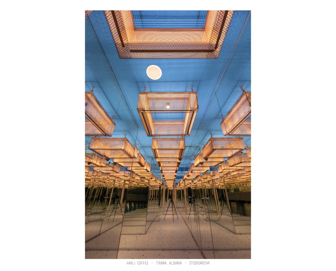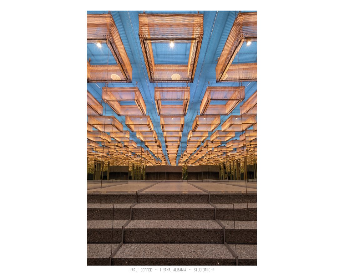 Harli Kafe është një zinxhir kafenesh i vendosur në nyje të ndryshme të qytetit të Tiranës. Ky lokacion specifik është në Rrugën e Barrikadave, e cila është një zonë me trafik shumë të lartë gjatë ditës dhe natës. Propozimi ynë për kafenë merr në konsideratë fluksin e lartë të klientëve gjatë llogaritjes së kapacitetit duke krijuar një shpërndarje të balancuar të hapsirave te stafit dhe shërbimeve ndaj klientit. Banaku ndodhet në fund të hapësirës, por perceptohet lehtësisht përmes fasadës prej xhami ne hyrje. Hapësira është e ndarë në tre zona kryesore që janë zona e brendshme, një zonë pjeserisht e jashtme e cila mund të shndërrohet lehtësisht në ambient të brendshem duke mbyllur elementët rrëshqitëse te fasadës, dhe një zonë e jashtme. Një element i fortë i arkitekturës së tij është tavani i varur i përbërë nga rrjetë 3D drejtkëndëshe me ngjyrë bakri, e cila theksohet nga dritat led poshtë saj, duke hedhur hijet e rrjetës në tavan. Paleta e ngjyrave është një kontrast i fortë midis rrjetës së tavanit me ngjyrë bakri, blusë së thellë të përdorur në mure dhe bar dhe një ngjyre të ngrohtë të verdhë dhe druri të përdorur në disa prej mobiljeve.