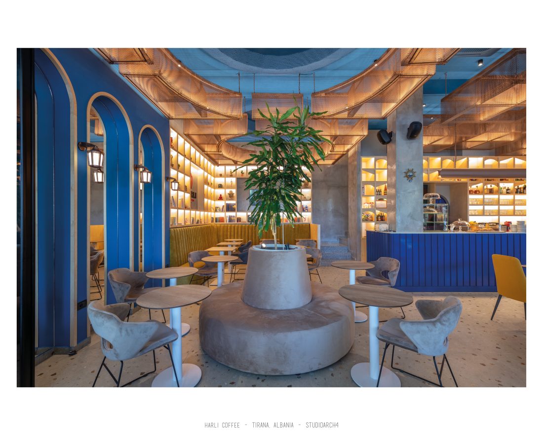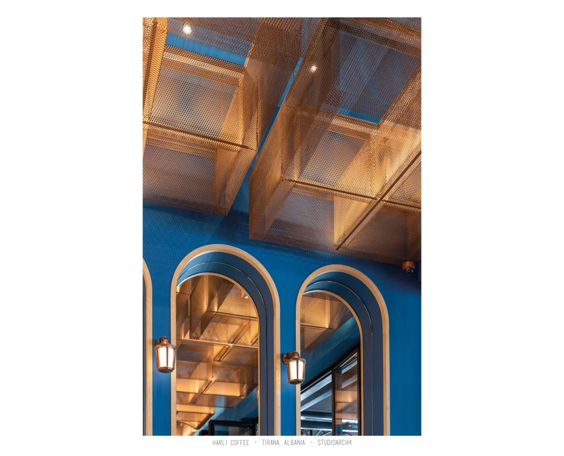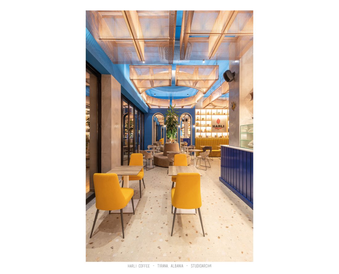 Harli Coffee is a coffeshop chain located in different junctions of the city of Tirana. This specific location is in “Rruga e Barrikadave”, which is a very high traffic area, remaning busy during the day and night time. Our proposal for the coffeshop takes the high influx of clients in consideration when calculating the capacity for the coffeshop by creating a balanced distribution of the staff and client services. The service bar is located at the end of the space, but is easily percieved before you enter the coffeeshop through its glass facade. The space is divided in three main areas which are the indoor area, a partial outdoor area which can easily turn into indoors by closing the sliding facade elements, and an outdoor area. A strong element of it’s architecture is the pentant ceiling comprised of 3D rectangular copper-coloured mesh, which is highlighted by the led lights beneath it, resulting in shadows of the mesh to relfect on the ceiling. The colour palate is a strong contrast of colours between the copper-coloured ceileing mesh, the deep blue used in walls and bar, and a warm yellow and wooden colour used in some of the furniture. We also incorporated trees and plants in the interior design of the space.
