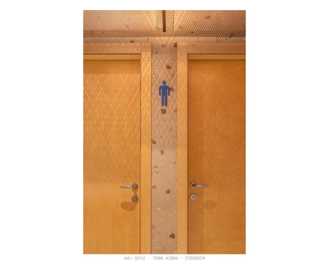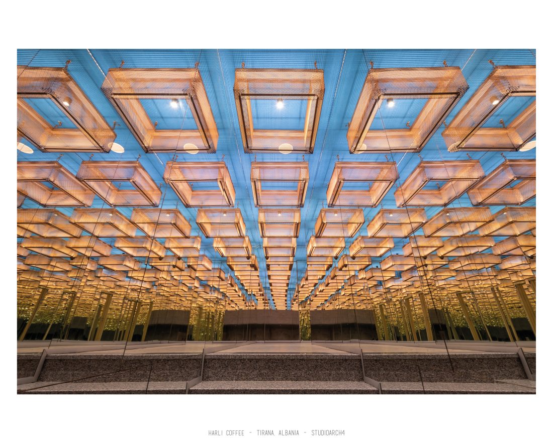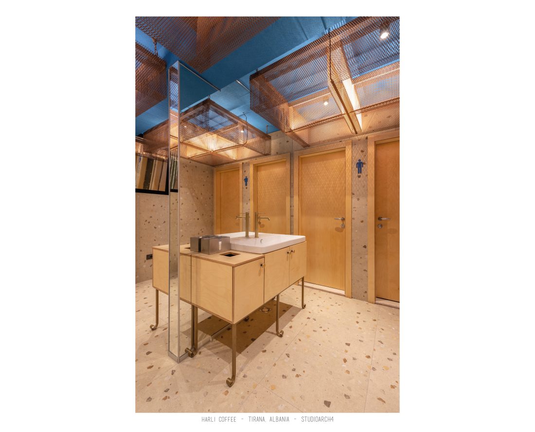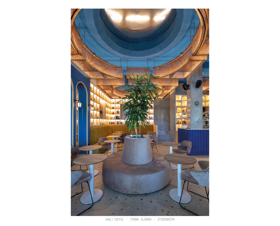 Harli Coffee is a coffeshop chain located in different junctions of the city of Tirana. This specific location is in “Rruga e Barrikadave”, which is a very high traffic area, remaning busy during the day and night time. Our proposal for the coffeshop takes the high influx of clients in consideration when calculating the capacity for the coffeshop by creating a balanced distribution of the staff and client services. The service bar is located at the end of the space, but is easily percieved before you enter the coffeeshop through its glass facade. The space is divided in three main areas which are the indoor area, a partial outdoor area which can easily turn into indoors by closing the sliding facade elements, and an outdoor area. A strong element of it’s architecture is the pentant ceiling comprised of 3D rectangular copper-coloured mesh, which is highlighted by the led lights beneath it, resulting in shadows of the mesh to relfect on the ceiling. The colour palate is a strong contrast of colours between the copper-coloured ceileing mesh, the deep blue used in walls and bar, and a warm yellow and wooden colour used in some of the furniture. We also incorporated trees and plants in the interior design of the space.