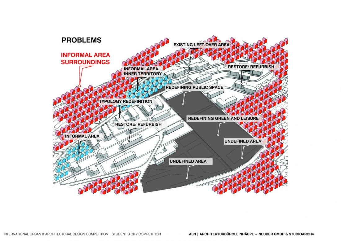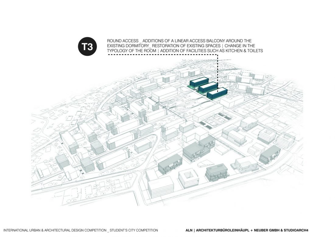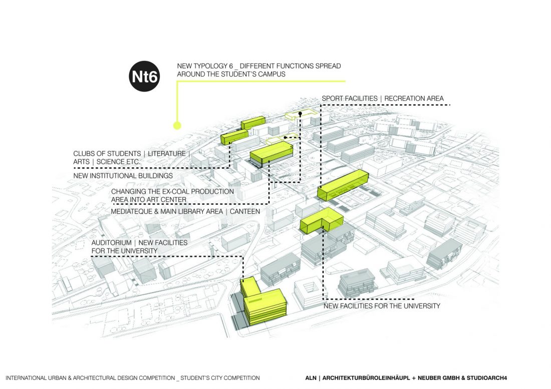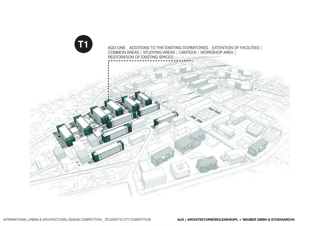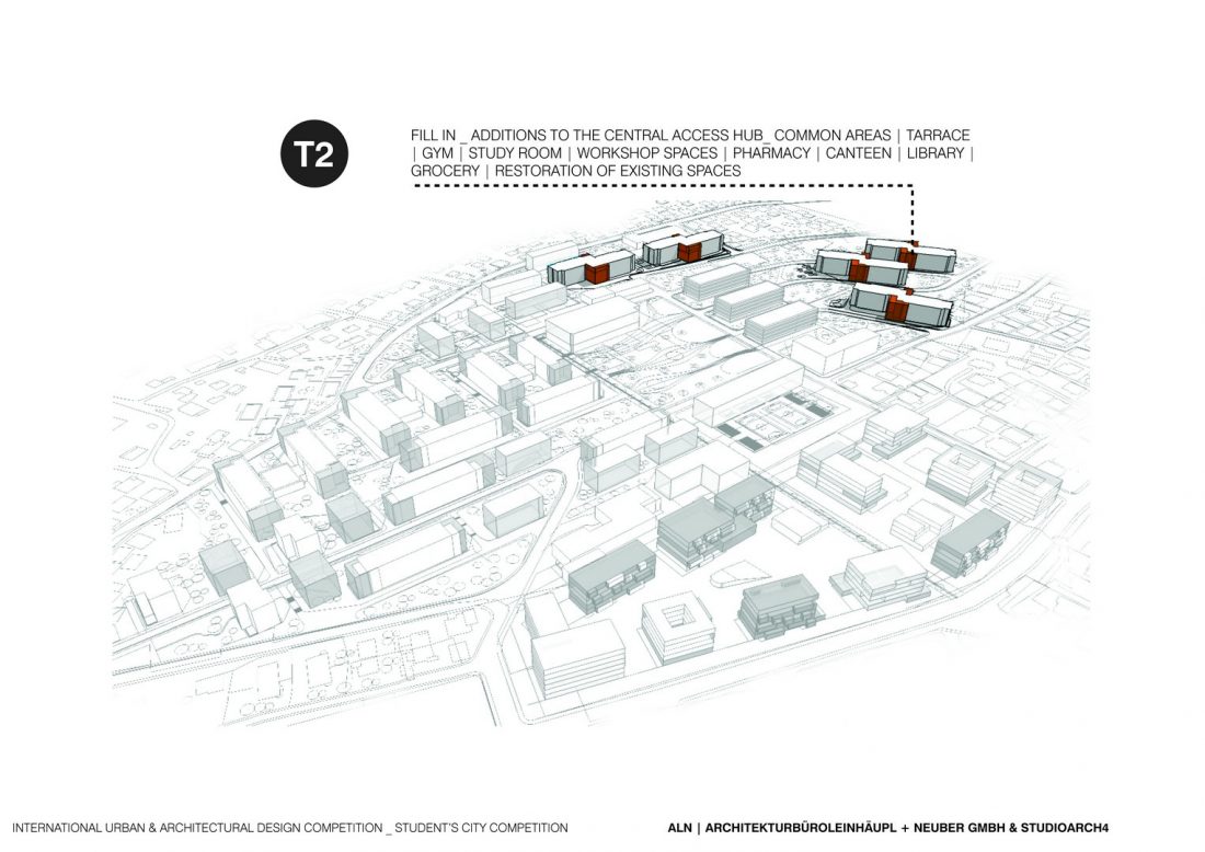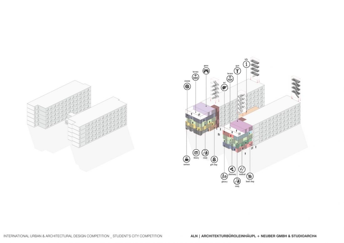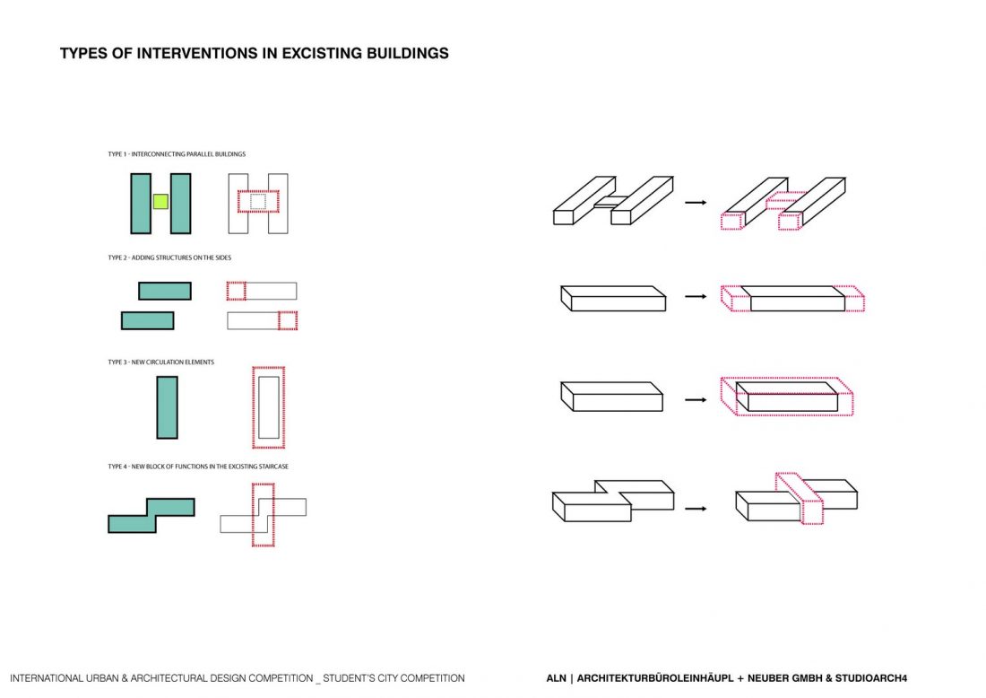Our proposal for the Student’s City Campus consists on the hybridization strategy, which is a redefinition of all the functions of the campus. The hybridization strategy will contribute on the addition of new necessary programs and the creation of mix typologies that will enrich the quality of life and spatial conditions. Having a hybrid building means to offer a typology that can host students and the locals that occupy all the surroundings of the city of students. In such a way we create a city within a city, where locals and students create the community and where students characterize the new society. The principal challenge of the master plan is to redefine undeveloped areas, to structure the existing spatial conditions, to propose new dormitory areas and such a way augmenting the number of students during one academic year. Reactivating bypassed areas and contributing with a complex of functions, are two important challenges we tackle. We aimed on creating a campus where students will find every necessity they need and in relation to their financial conditions. We believe in the potential that mixed used buildings have on the better development of social life. In terms of restoration and re-qualification, the challenge was to deal with a very old degraded construction, and with the partial change of some typologies.