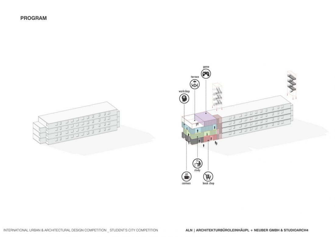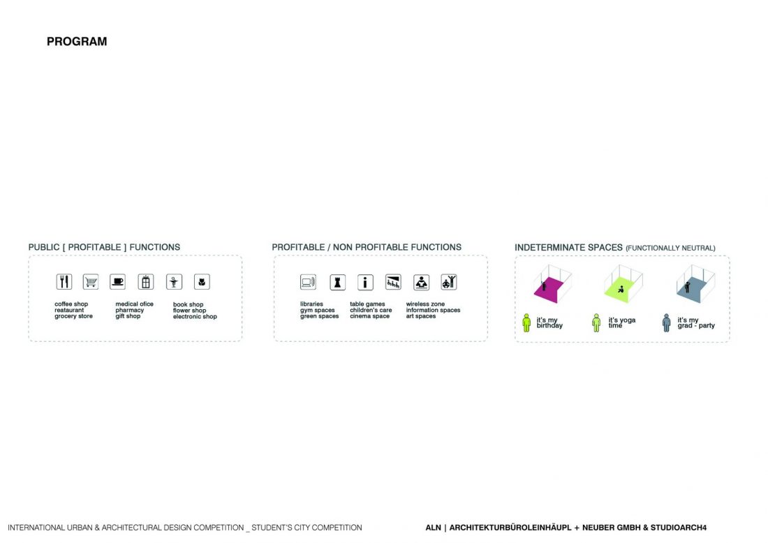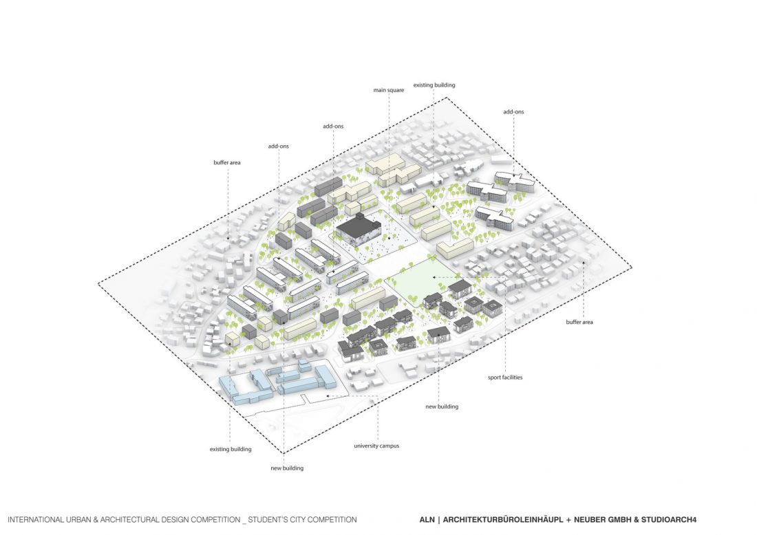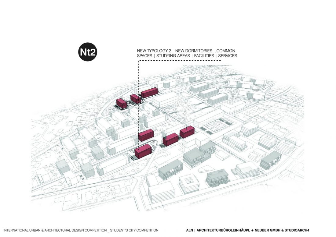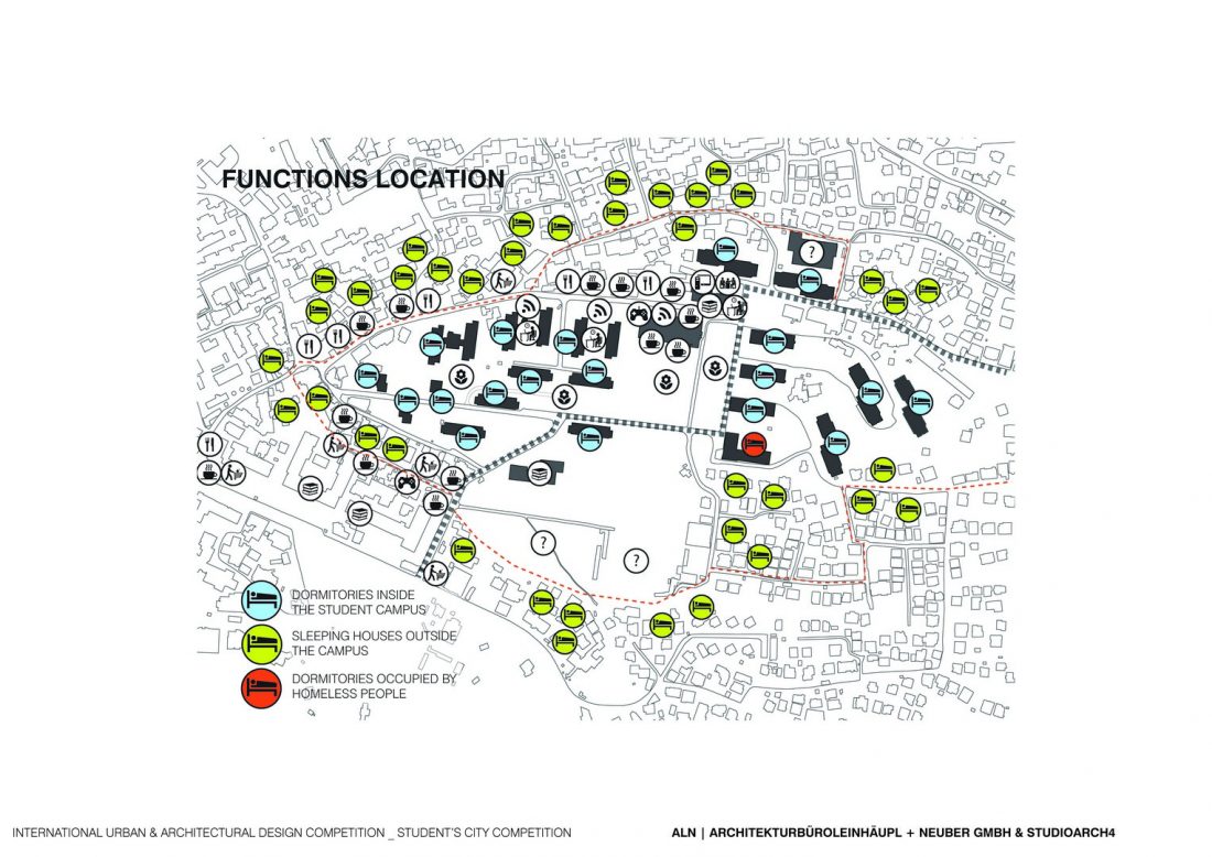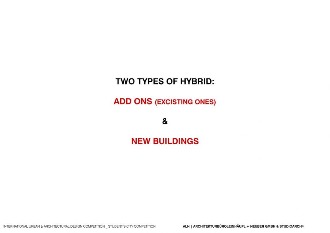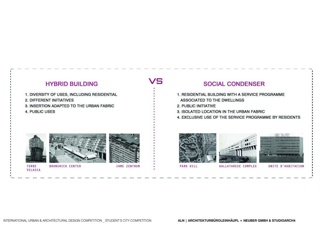 Our proposal for the Student’s City Campus consists on the hybridization strategy, which is a redefinition of all the functions of the campus. The hybridization strategy will contribute on the addition of new necessary programs and the creation of mix typologies that will enrich the quality of life and spatial conditions. Having a hybrid building means to offer a typology that can host students and the locals that occupy all the surroundings of the city of students. In such a way we create a city within a city, where locals and students create the community and where students characterize the new society. The principal challenge of the master plan is to redefine undeveloped areas, to structure the existing spatial conditions, to propose new dormitory areas and such a way augmenting the number of students during one academic year. Reactivating bypassed areas and contributing with a complex of functions, are two important challenges we tackle. We aimed on creating a campus where students will find every necessity they need and in relation to their financial conditions. We believe in the potential that mixed used buildings have on the better development of social life. In terms of restoration and re-qualification, the challenge was to deal with a very old degraded construction, and with the partial change of some typologies.