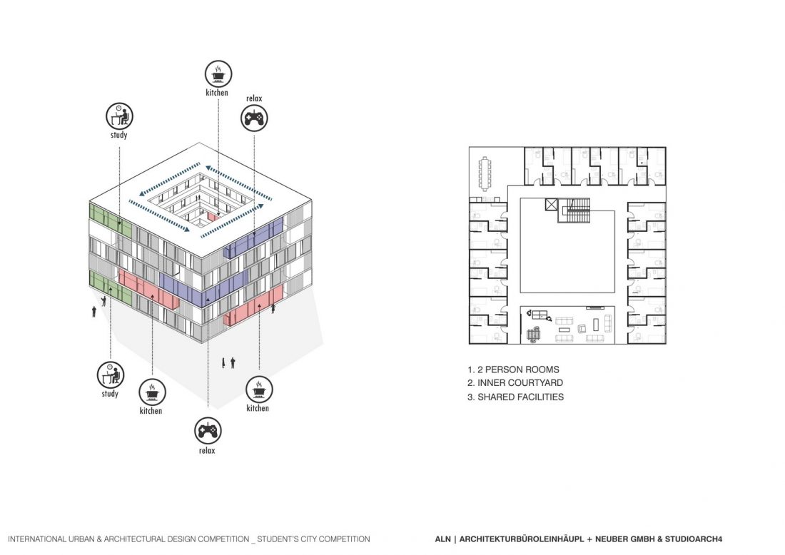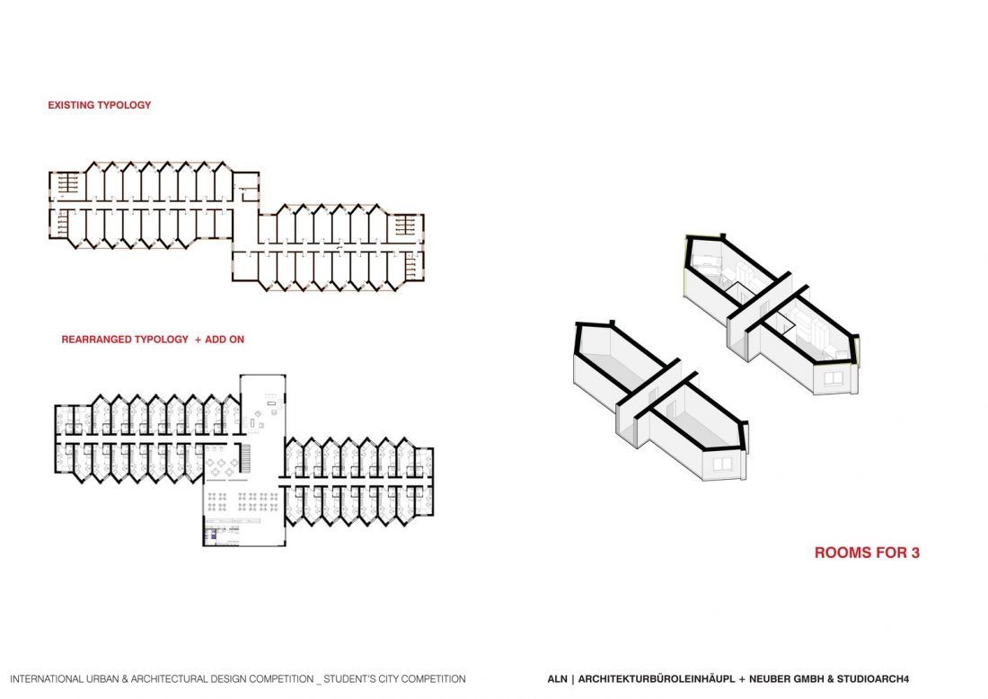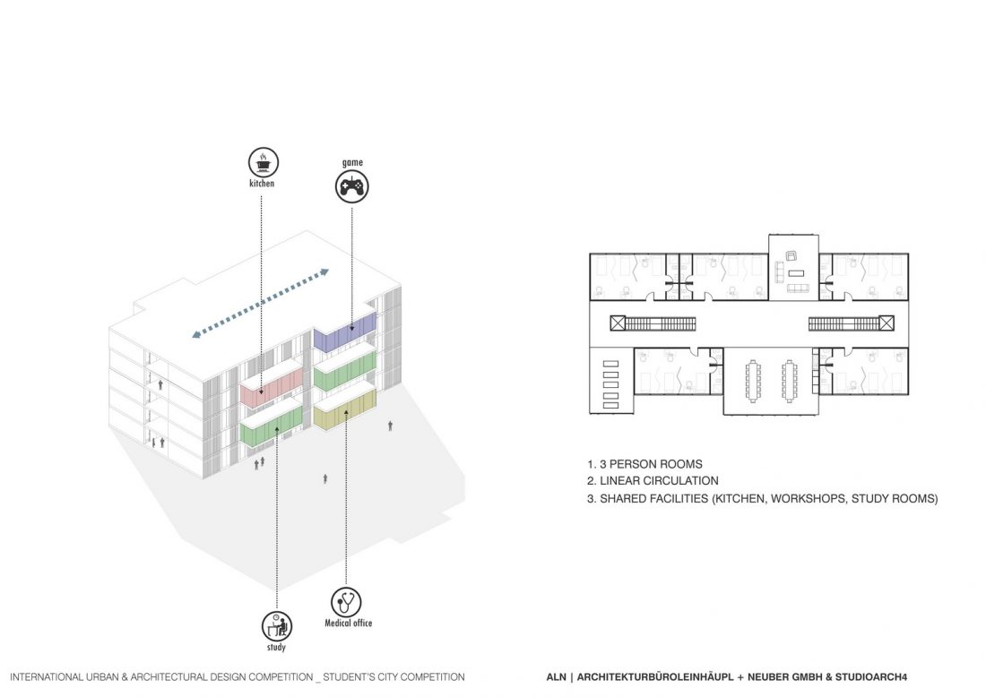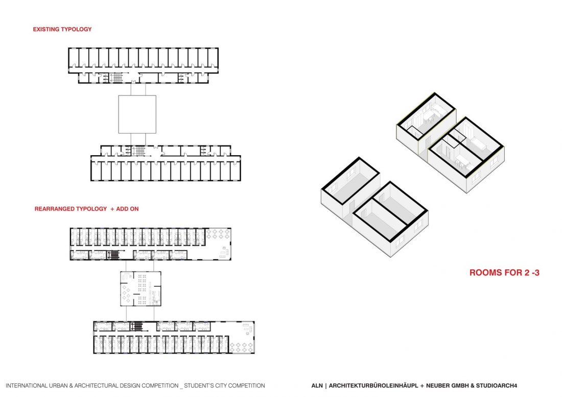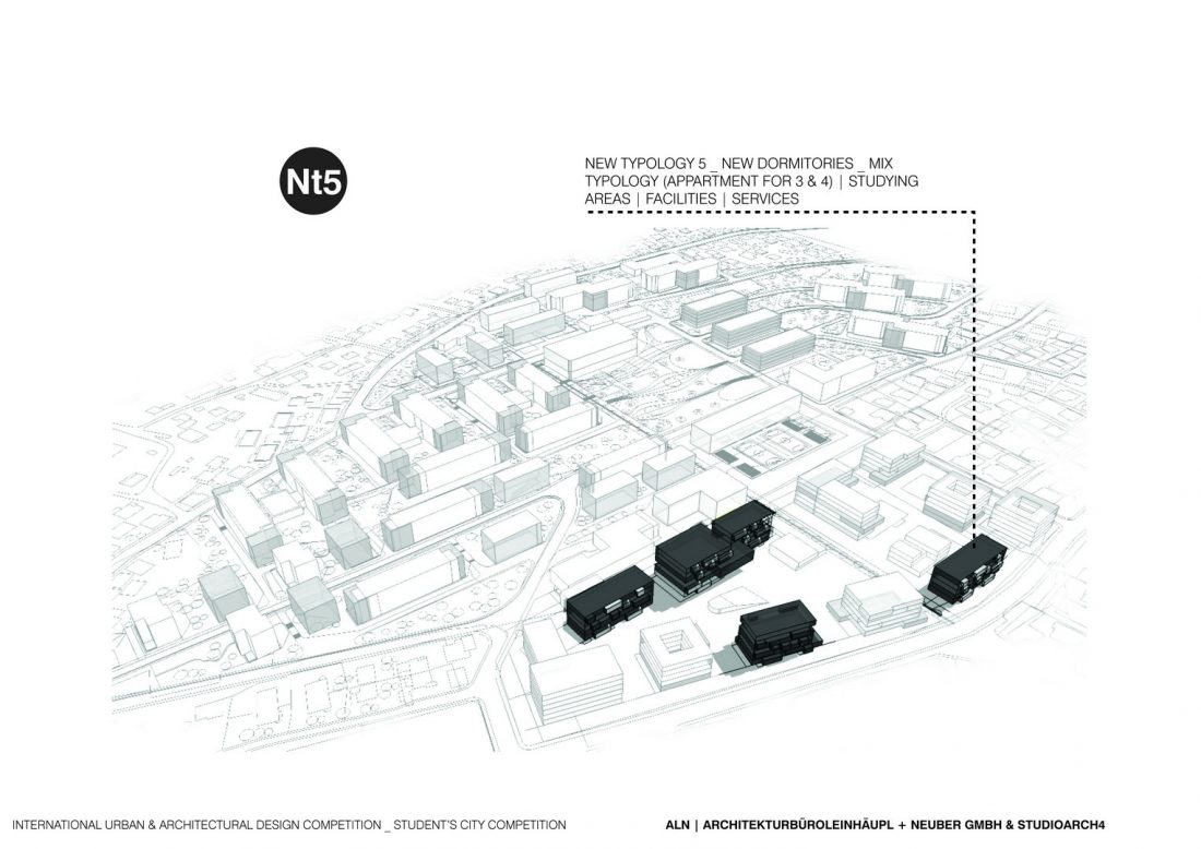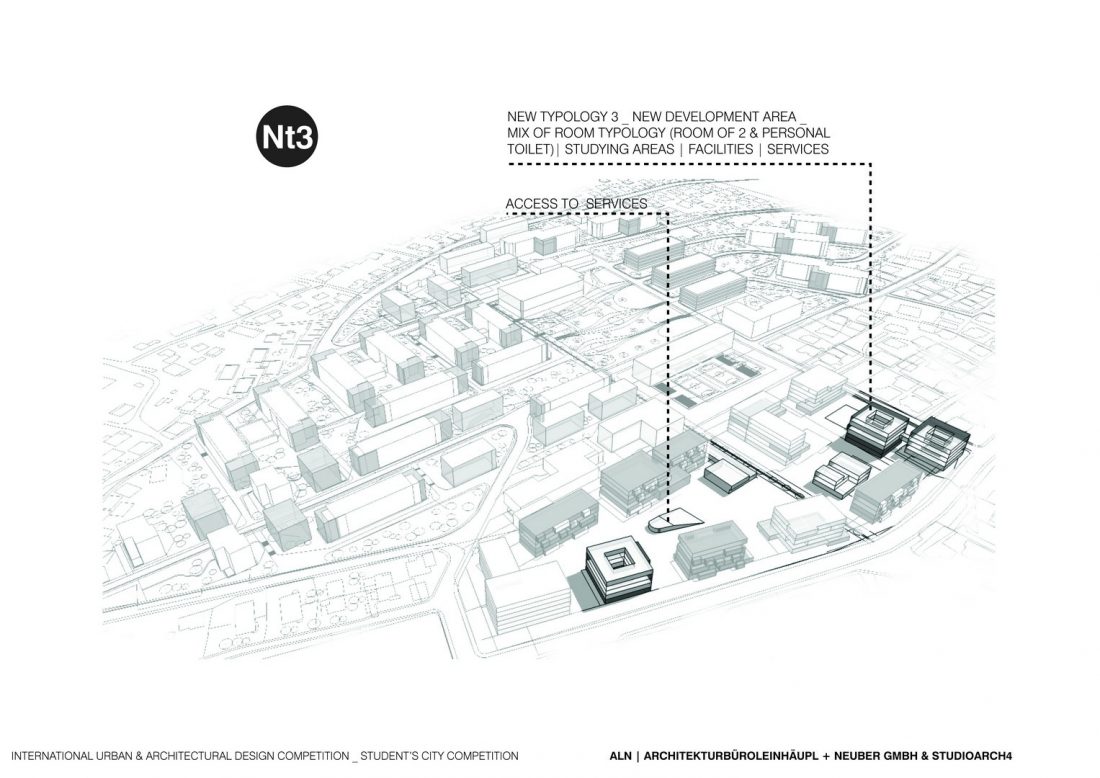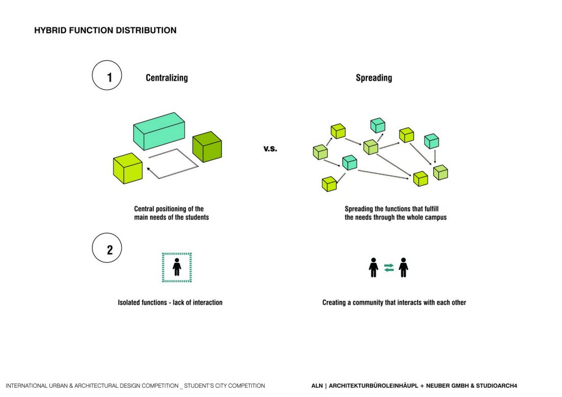 Our proposal for the Student’s City Campus consists on the hybridization strategy, which is a redefinition of all the functions of the campus. The hybridization strategy will contribute on the addition of new necessary programs and the creation of mix typologies that will enrich the quality of life and spatial conditions. Having a hybrid building means to offer a typology that can host students and the locals that occupy all the surroundings of the city of students. In such a way we create a city within a city, where locals and students create the community and where students characterize the new society. The principal challenge of the master plan is to redefine undeveloped areas, to structure the existing spatial conditions, to propose new dormitory areas and such a way augmenting the number of students during one academic year. Reactivating bypassed areas and contributing with a complex of functions, are two important challenges we tackle. We aimed on creating a campus where students will find every necessity they need and in relation to their financial conditions. We believe in the potential that mixed used buildings have on the better development of social life. In terms of restoration and re-qualification, the challenge was to deal with a very old degraded construction, and with the partial change of some typologies.