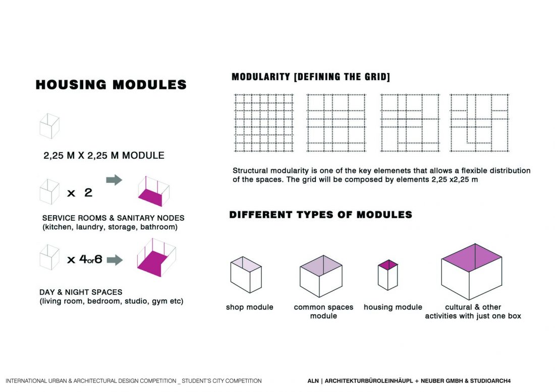 Modules 2,25m x 2,25m, good dimensions for different functions, compose the entire building. We can use half module for corridors, services etc. and double it or multiply it for rooms, public functions, open spaces etc.