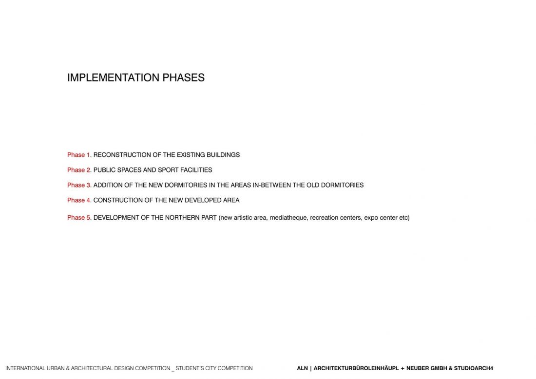 This fifth phase will include the new development of the northern part of Student’s City. It will be dedicated to the construction of three new other hybrid dormitories and the development of a new artistic area, mediatheque, recreation centers, expo center that will elaborate in relation to the central library and art center.