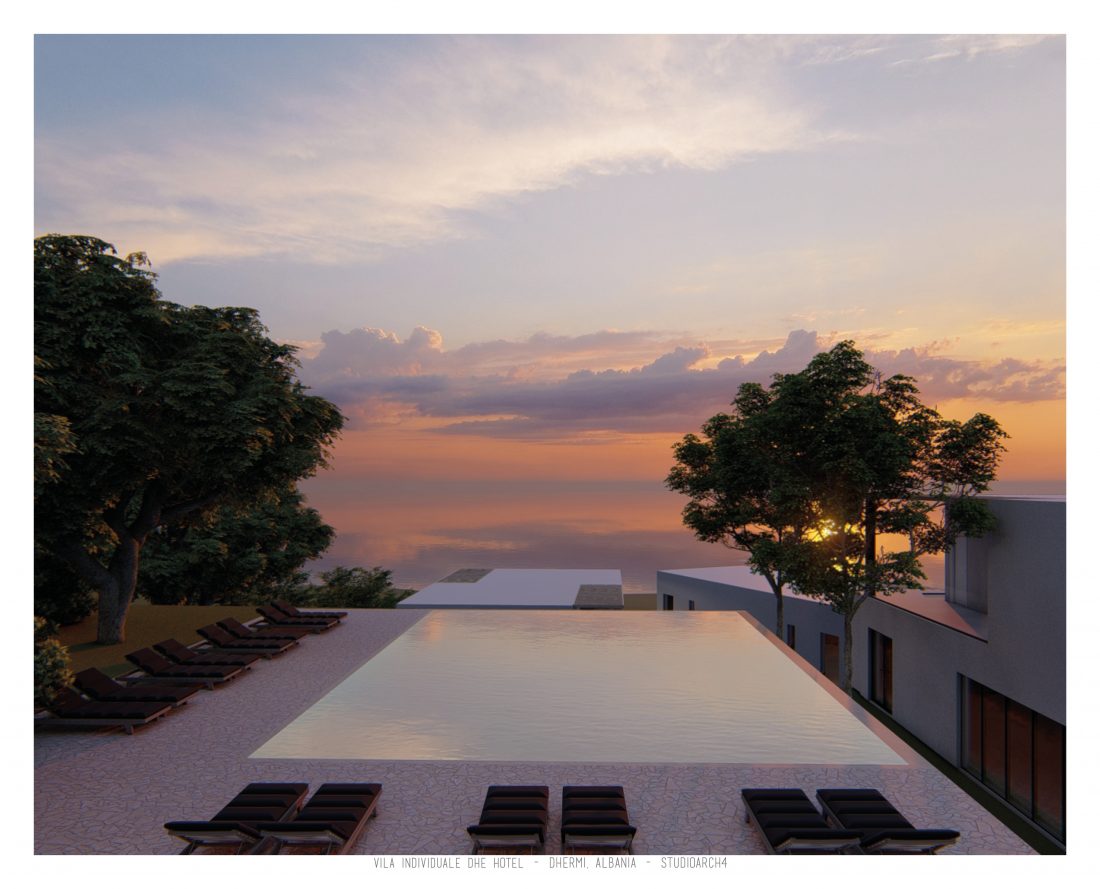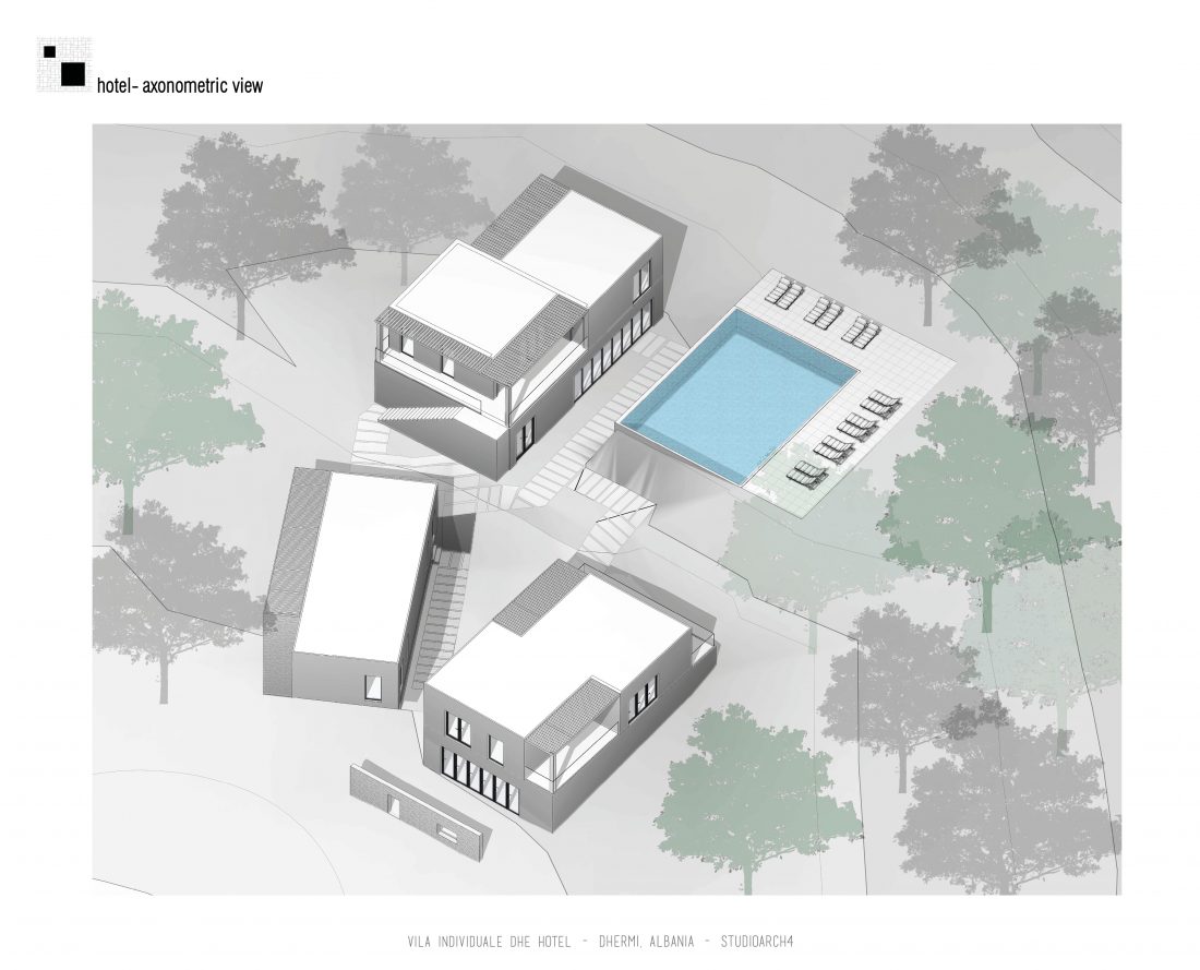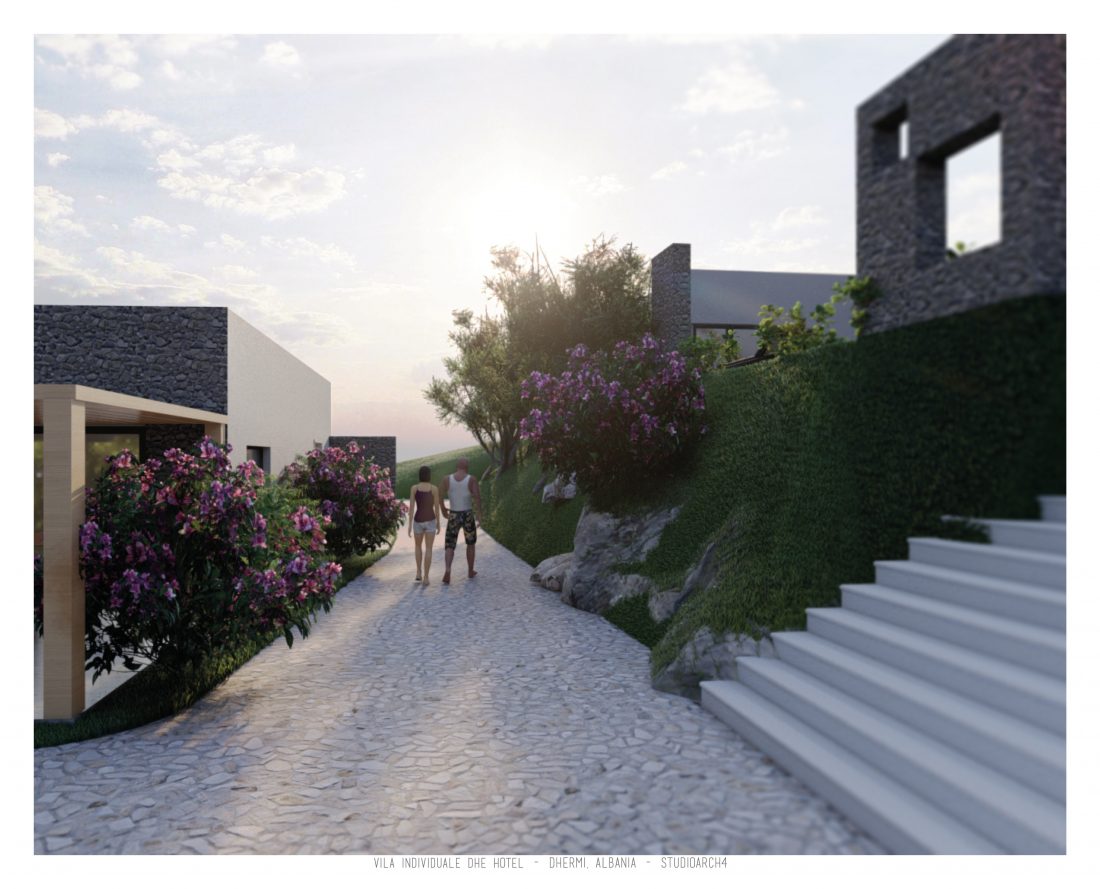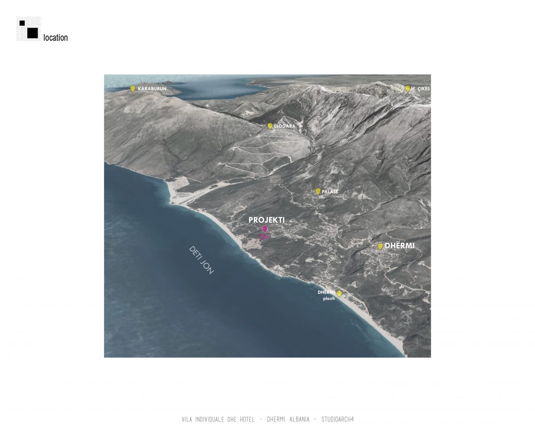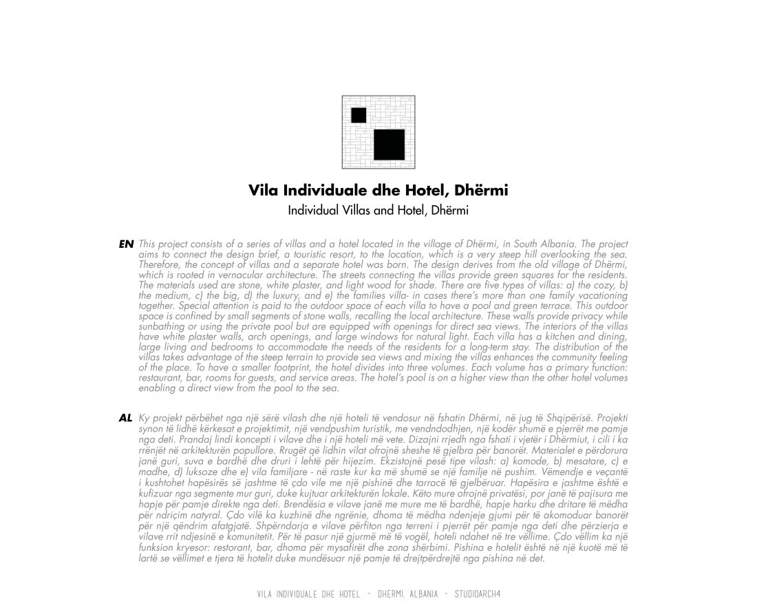 Ky projekt përbëhet nga një sërë vilash dhe një hoteli të vendosur në fshatin Dhërmi, në jug të Shqipërisë. Projekti synon të lidhë kërkesat e projektimit, një vendpushim turistik, me vendndodhjen, një kodër shumë e pjerrët me pamje nga deti. Prandaj lindi koncepti i vilave dhe i një hoteli më vete. Dizajni rrjedh nga fshati i vjetër i Dhërmiut, i cili i ka rrënjët në arkitekturën popullore. Rrugët që lidhin vilat ofrojnë sheshe të gjelbra për banorët. Materialet e përdorura janë guri, suva e bardhë dhe druri i lehtë për hijezim. Ekzistojnë pesë tipe vilash: a) komode, b) mesatare, c) e madhe, d) luksoze dhe e) vila familjare – në raste kur ka më shumë se një familje në pushim. Vëmendje e veçantë i kushtohet hapësirës së jashtme të çdo vile me një pishinë dhe tarracë të gjelbëruar. Hapësira e jashtme është e kufizuar nga segmente mur guri, duke kujtuar arkitekturën lokale. Këto mure ofrojnë privatësi, por janë të pajisura me hapje për pamje direkte nga deti. Brendësia e vilave janë me mure me të bardhë, hapje harku dhe dritare të mëdha për ndriçim natyral. Çdo vilë ka kuzhinë dhe ngrënie, dhoma të mëdha ndenjeje gjumi për të akomoduar banorët për një qëndrim afatgjatë. Shpërndarja e vilave përfiton nga terreni i pjerrët për pamje nga deti dhe përzierja e vilave rrit ndjesinë e komunitetit. Për të pasur një gjurmë më të vogël, hoteli ndahet në tre vëllime. Çdo vëllim ka një funksion kryesor: restorant, bar, dhoma për mysafirët dhe zona shërbimi. Pishina e hotelit është në një kuotë më të lartë se vëllimet e tjera të hotelit duke mundësuar një pamje të drejtpërdrejtë nga pishina në det.