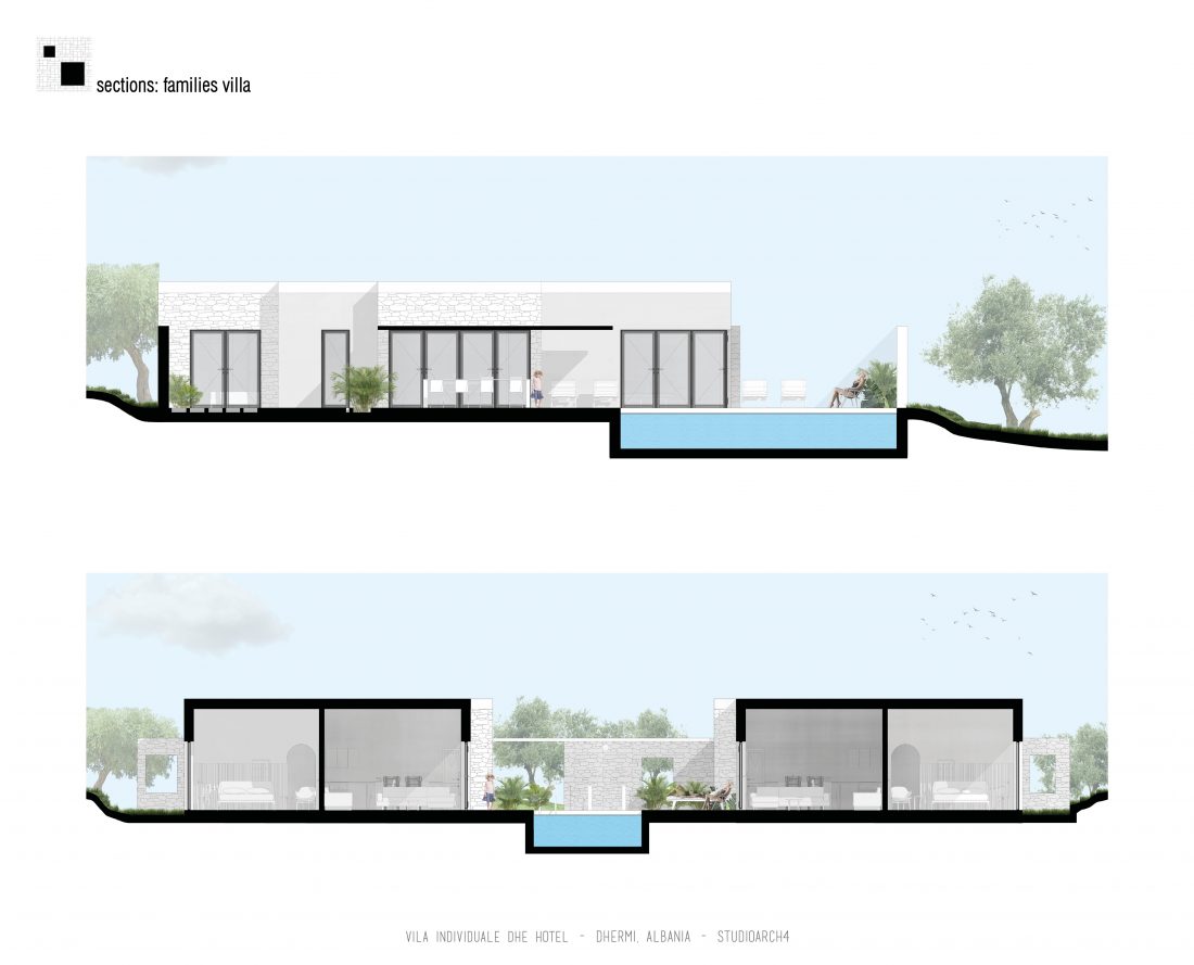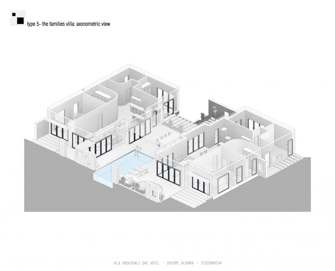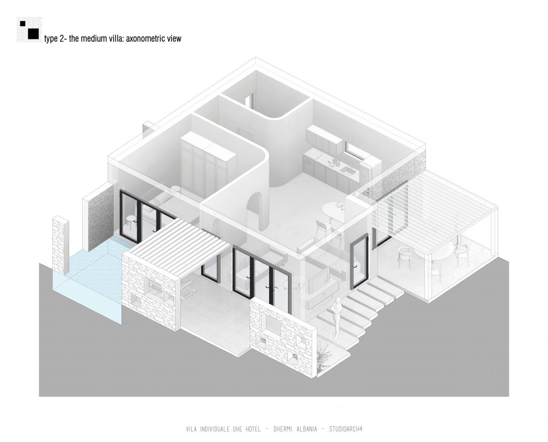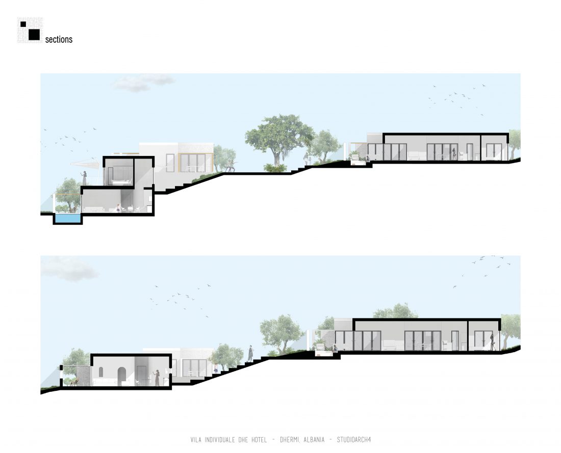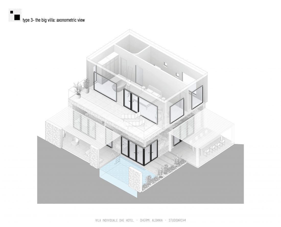 Ky projekt përbëhet nga një sërë vilash dhe një hoteli të vendosur në fshatin Dhërmi, në jug të Shqipërisë. Projekti synon të lidhë kërkesat e projektimit, një vendpushim turistik, me vendndodhjen, një kodër shumë e pjerrët me pamje nga deti. Prandaj lindi koncepti i vilave dhe i një hoteli më vete. Dizajni rrjedh nga fshati i vjetër i Dhërmiut, i cili i ka rrënjët në arkitekturën popullore. Rrugët që lidhin vilat ofrojnë sheshe të gjelbra për banorët. Materialet e përdorura janë guri, suva e bardhë dhe druri i lehtë për hijezim. Ekzistojnë pesë tipe vilash: a) komode, b) mesatare, c) e madhe, d) luksoze dhe e) vila familjare – në raste kur ka më shumë se një familje në pushim. Vëmendje e veçantë i kushtohet hapësirës së jashtme të çdo vile me një pishinë dhe tarracë të gjelbëruar. Hapësira e jashtme është e kufizuar nga segmente mur guri, duke kujtuar arkitekturën lokale. Këto mure ofrojnë privatësi, por janë të pajisura me hapje për pamje direkte nga deti. Brendësia e vilave janë me mure me të bardhë, hapje harku dhe dritare të mëdha për ndriçim natyral. Çdo vilë ka kuzhinë dhe ngrënie, dhoma të mëdha ndenjeje gjumi për të akomoduar banorët për një qëndrim afatgjatë. Shpërndarja e vilave përfiton nga terreni i pjerrët për pamje nga deti dhe përzierja e vilave rrit ndjesinë e komunitetit. Për të pasur një gjurmë më të vogël, hoteli ndahet në tre vëllime. Çdo vëllim ka një funksion kryesor: restorant, bar, dhoma për mysafirët dhe zona shërbimi. Pishina e hotelit është në një kuotë më të lartë se vëllimet e tjera të hotelit duke mundësuar një pamje të drejtpërdrejtë nga pishina në det.