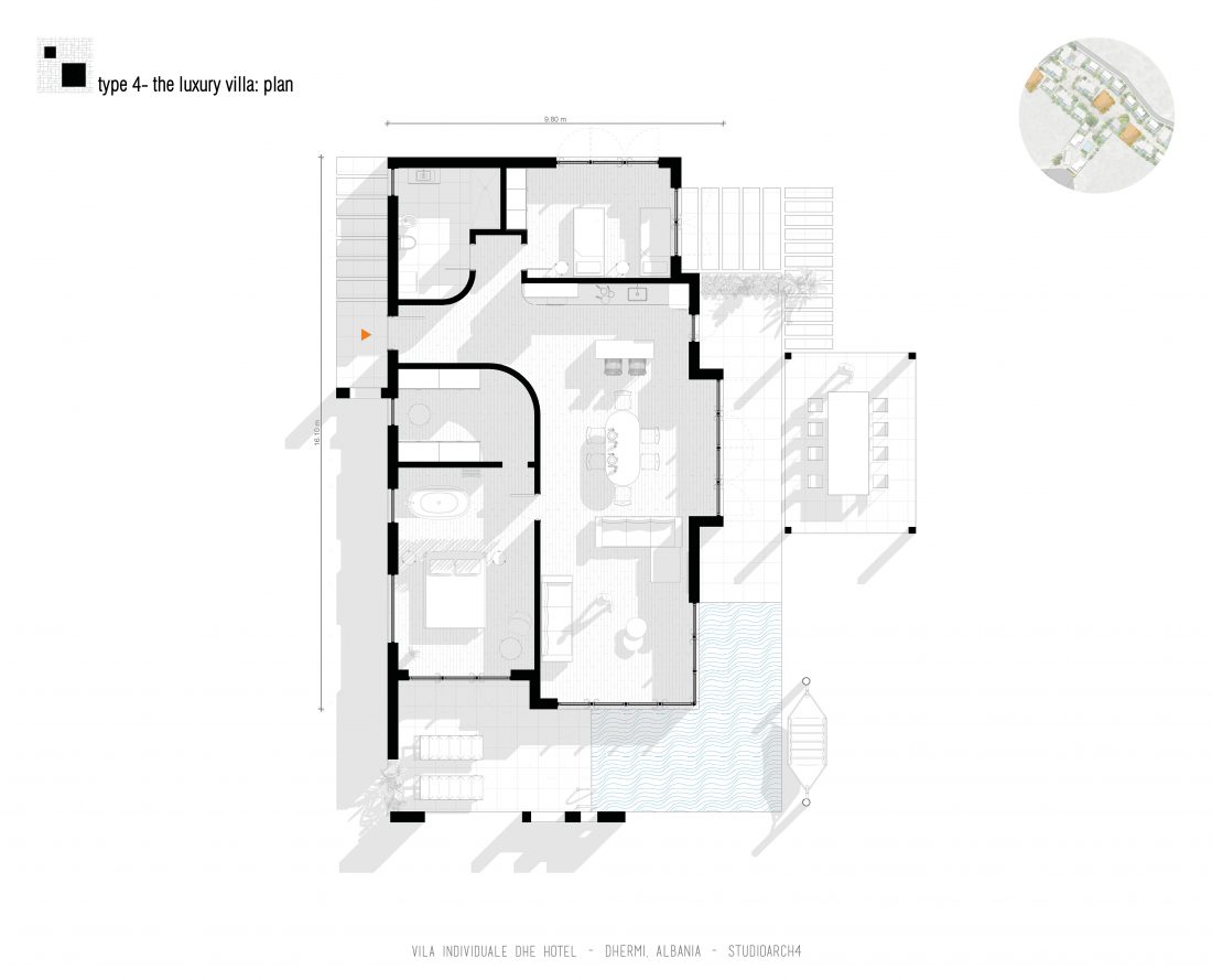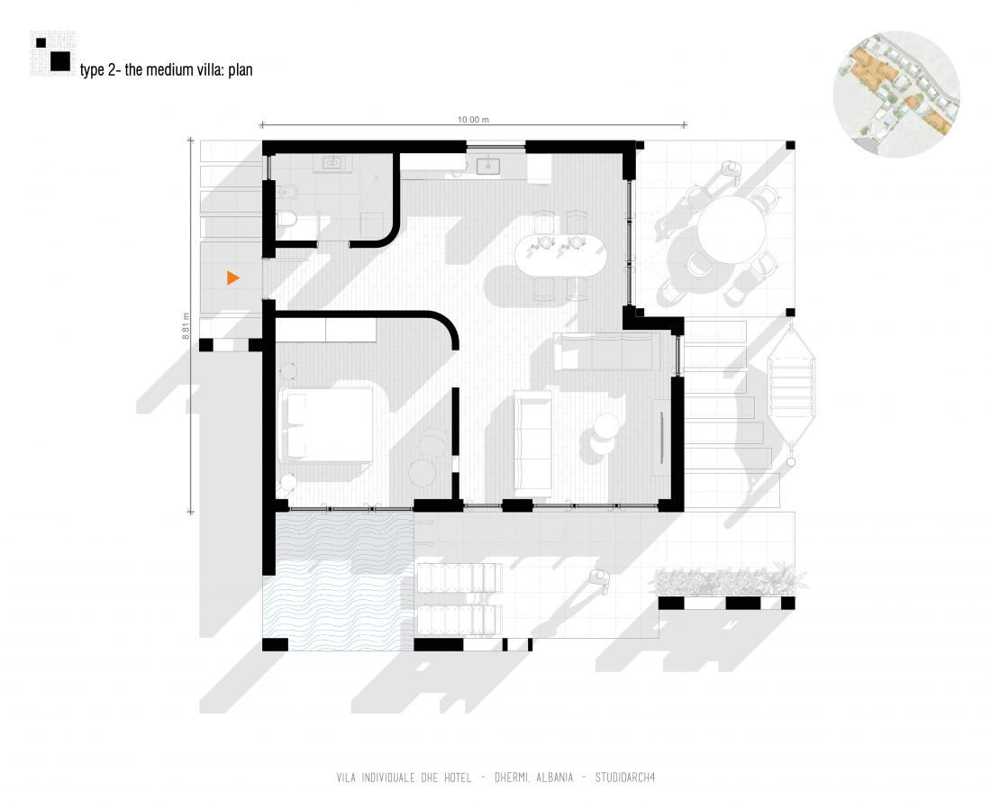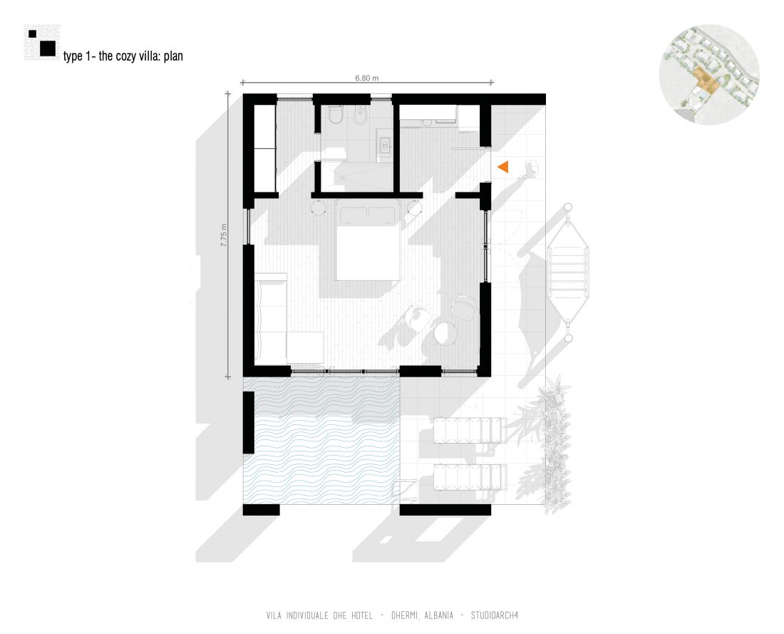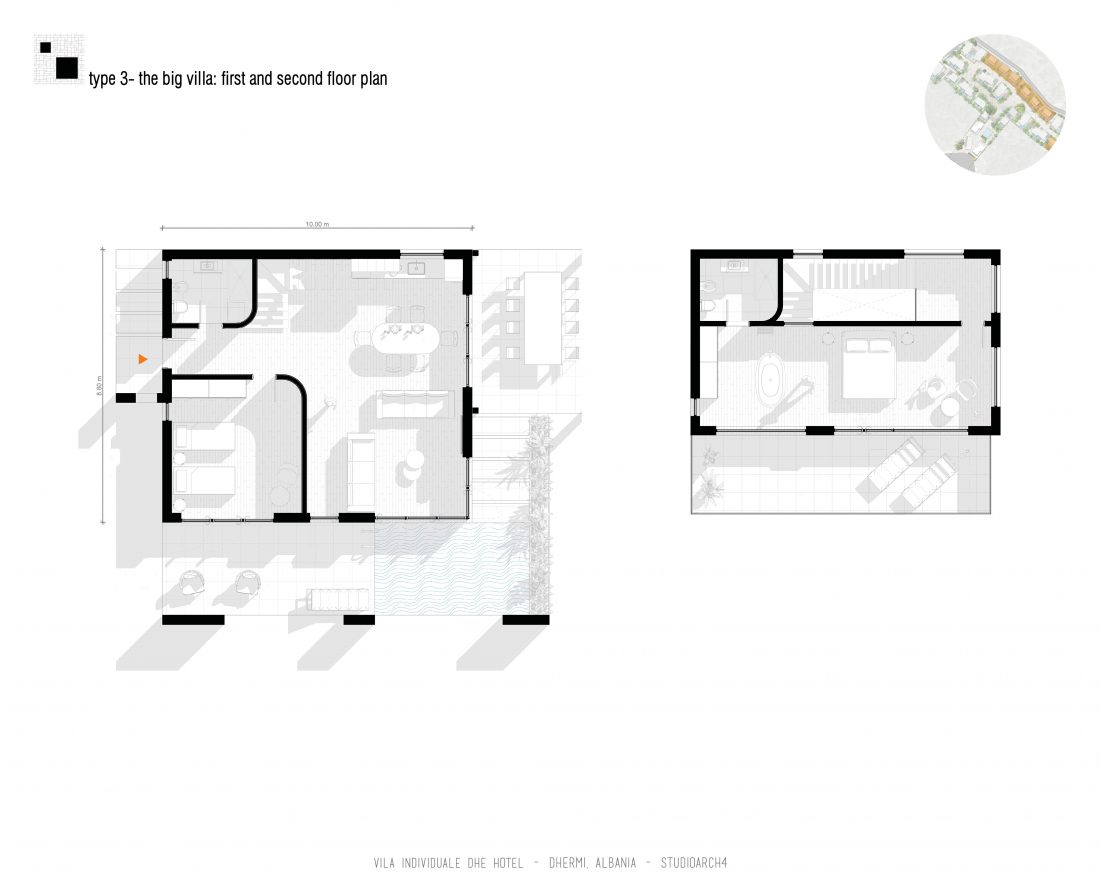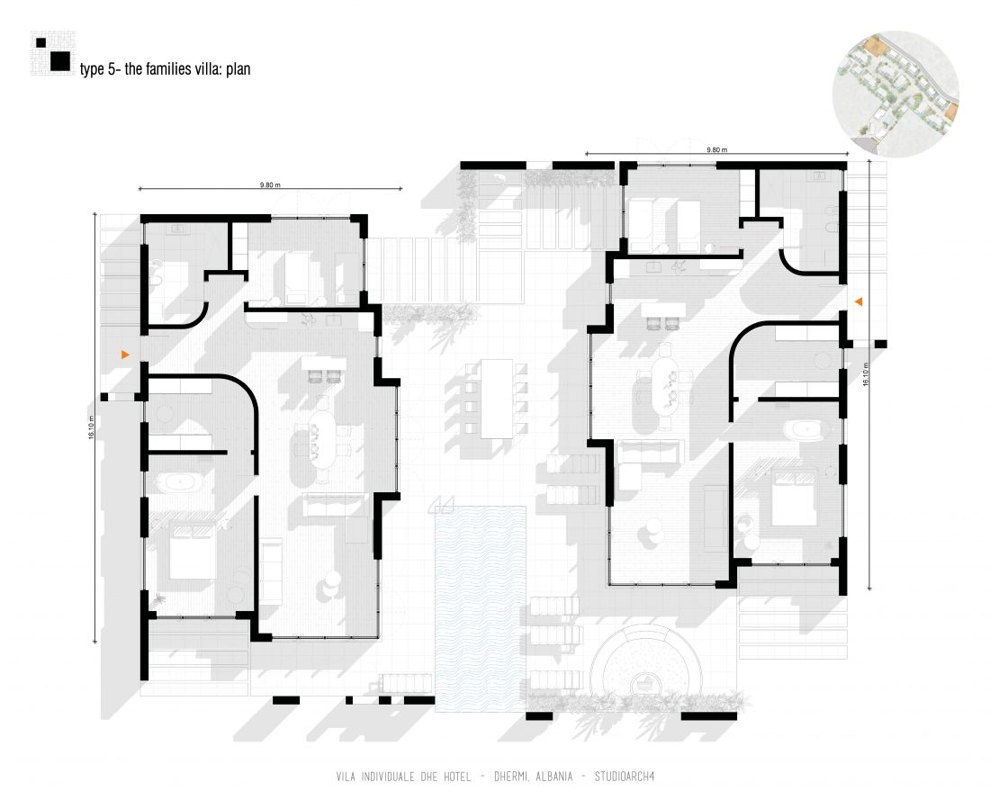 Ky projekt përbëhet nga një sërë vilash dhe një hoteli të vendosur në fshatin Dhërmi, në jug të Shqipërisë. Projekti synon të lidhë kërkesat e projektimit, një vendpushim turistik, me vendndodhjen, një kodër shumë e pjerrët me pamje nga deti. Prandaj lindi koncepti i vilave dhe i një hoteli më vete. Dizajni rrjedh nga fshati i vjetër i Dhërmiut, i cili i ka rrënjët në arkitekturën popullore. Rrugët që lidhin vilat ofrojnë sheshe të gjelbra për banorët. Materialet e përdorura janë guri, suva e bardhë dhe druri i lehtë për hijezim. Ekzistojnë pesë tipe vilash: a) komode, b) mesatare, c) e madhe, d) luksoze dhe e) vila familjare – në raste kur ka më shumë se një familje në pushim. Vëmendje e veçantë i kushtohet hapësirës së jashtme të çdo vile me një pishinë dhe tarracë të gjelbëruar. Hapësira e jashtme është e kufizuar nga segmente mur guri, duke kujtuar arkitekturën lokale. Këto mure ofrojnë privatësi, por janë të pajisura me hapje për pamje direkte nga deti. Brendësia e vilave janë me mure me të bardhë, hapje harku dhe dritare të mëdha për ndriçim natyral. Çdo vilë ka kuzhinë dhe ngrënie, dhoma të mëdha ndenjeje gjumi për të akomoduar banorët për një qëndrim afatgjatë. Shpërndarja e vilave përfiton nga terreni i pjerrët për pamje nga deti dhe përzierja e vilave rrit ndjesinë e komunitetit. Për të pasur një gjurmë më të vogël, hoteli ndahet në tre vëllime. Çdo vëllim ka një funksion kryesor: restorant, bar, dhoma për mysafirët dhe zona shërbimi. Pishina e hotelit është në një kuotë më të lartë se vëllimet e tjera të hotelit duke mundësuar një pamje të drejtpërdrejtë nga pishina në det.