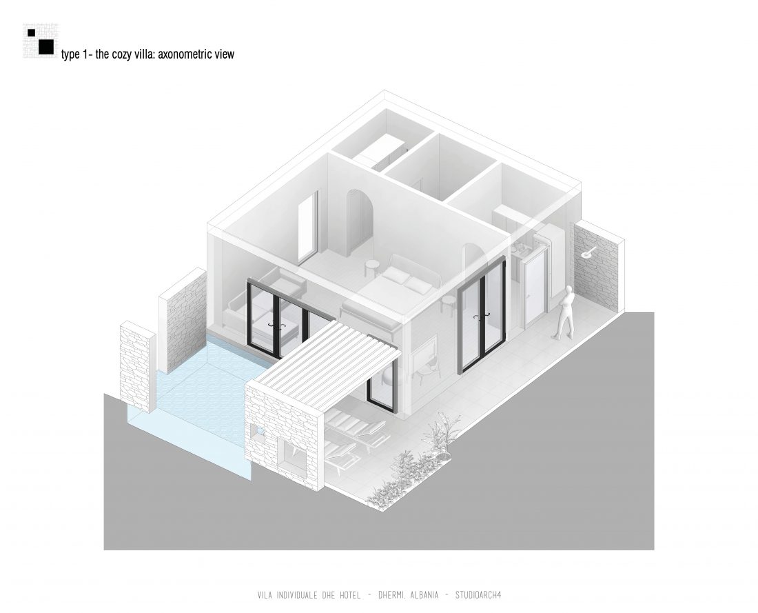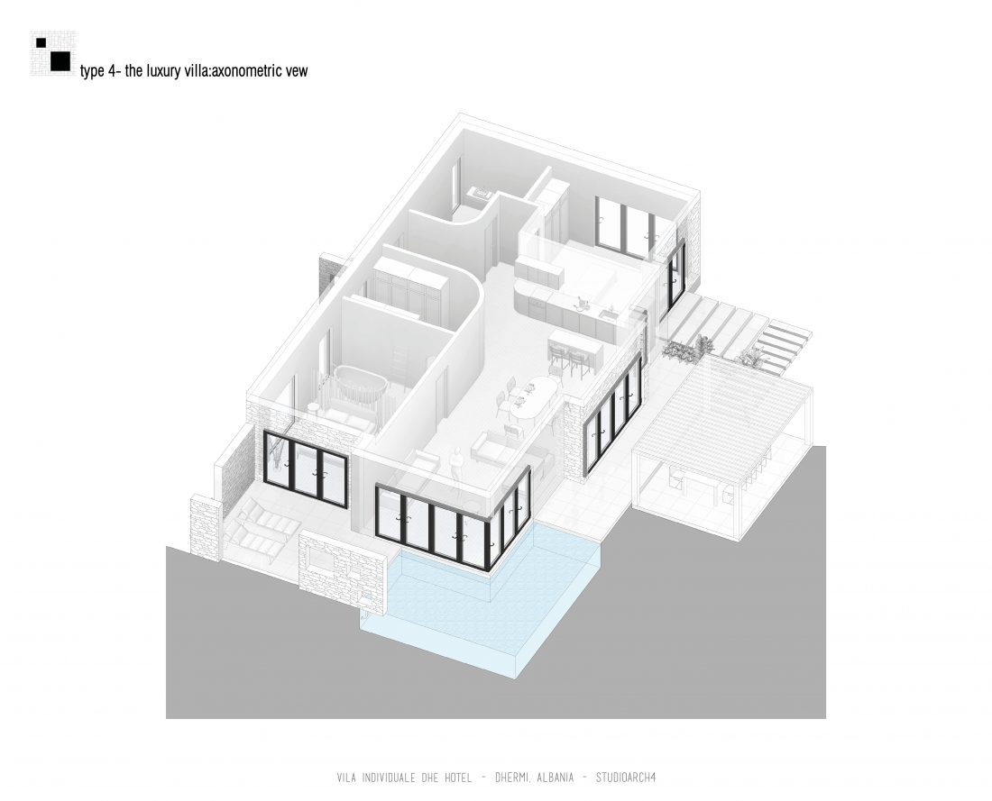 This project consists of a series of villas and a hotel located in the village of Dhërmi, in South Albania. The project aims to connect the design brief, a touristic resort, to the location, which is a very steep hill overlooking the sea. Therefore, the concept of villas and a separate hotel was born. The design derives from the old village of Dhërmi, which is rooted in vernacular architecture. The streets connecting the villas provide green squares for the residents. The materials used are stone, white plaster, and light wood for shade. There are five types of villas: a) the cozy, b)the medium, c) the big, d) the luxury, and e) the families villa- in cases there’s more than one family vacationing together. Special attention is paid to the outdoor space of each villa to have a pool and green terrace. This outdoor space is confined by small segments of stone walls, recalling the local architecture. These walls provide privacy while sunbathing or using the private pool but are equipped with openings for direct sea views. The interiors of the villas have white plaster walls, arch openings, and large windows for natural light. Each villa has a kitchen and dining, large living and bedrooms to accommodate the needs of the residents for a long-term stay. The distribution of the villas takes advantage of the steep terrain to provide sea views and mixing the villas enhances the community feeling of the place. To have a smaller footprint, the hotel divides into three volumes. Each volume has a primary function: restaurant, bar, rooms for guests, and service areas. The hotel’s pool is on a higher view than the other hotel volumes enabling a direct view from the pool to the sea.
