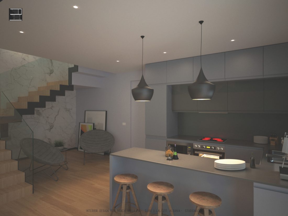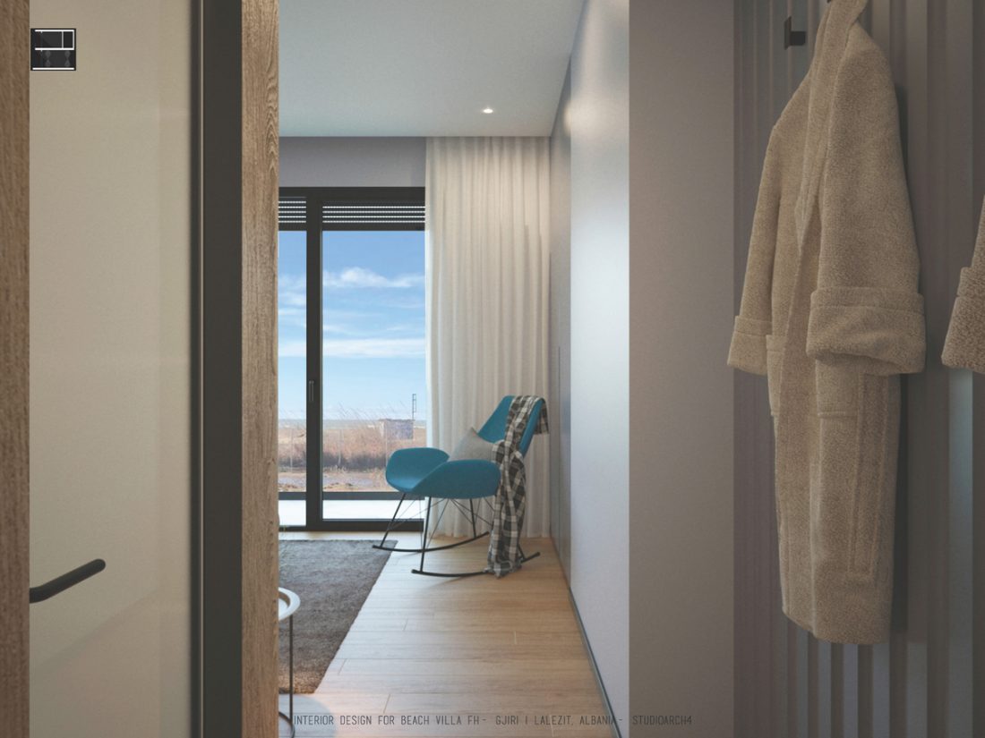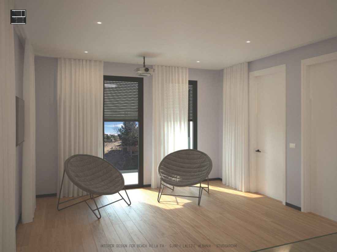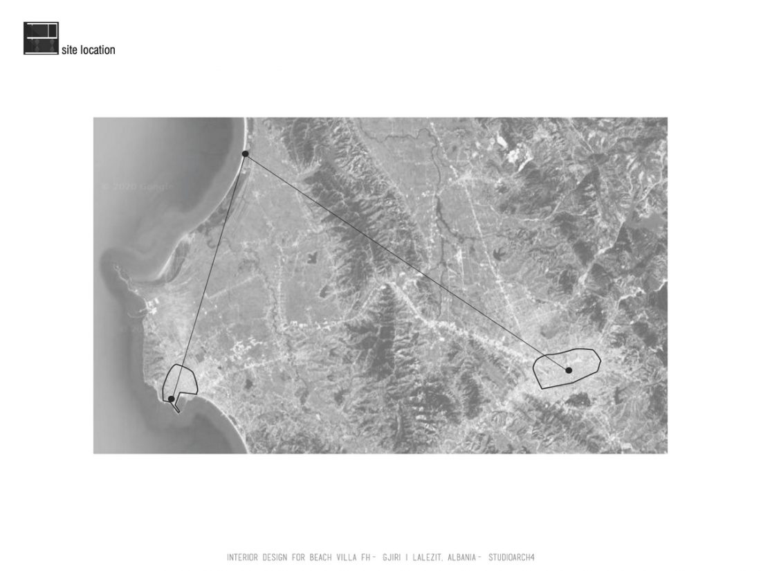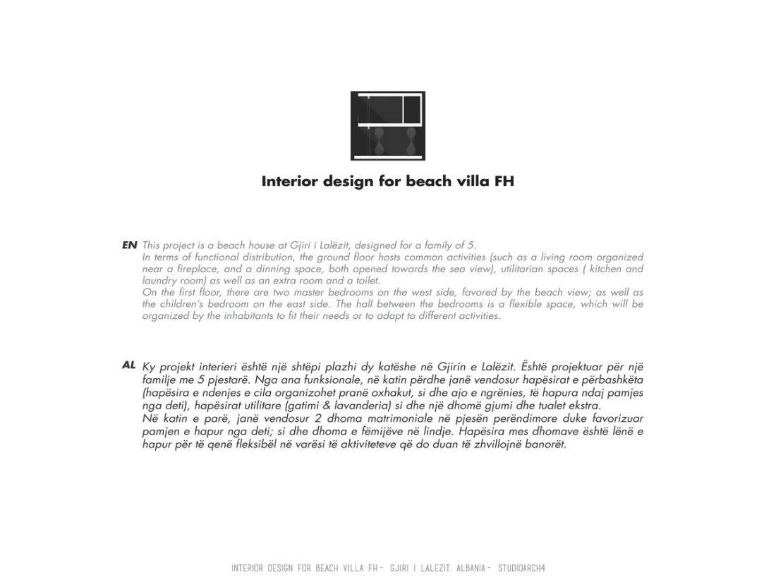 EN_This project is a beach house at Gjiri i Lalëzit, designed for a family of 5. In terms of functional distribution, the ground floor hosts common activities (such as a living room organized near a fireplace, and a dinning space, both opened towards the sea view), utilitarian spaces ( kitchen and laundry room) as well as an extra room and a toilet. On the first floor, there are two master bedrooms on the west side, favored by the beach view; as well as the children’s bedroom on the east side. The hall between the bedrooms is a flexible space, which will be organized by the inhabitants to fit their needs or to adapt to different activities.