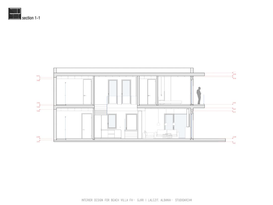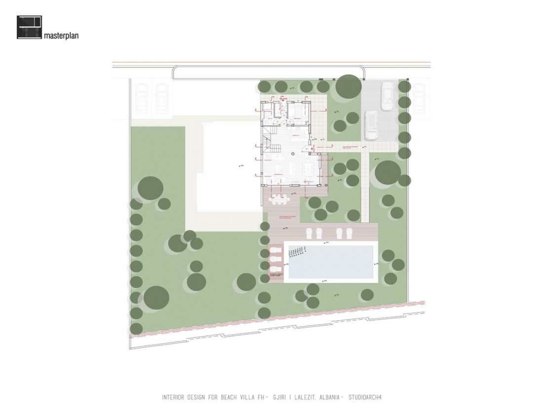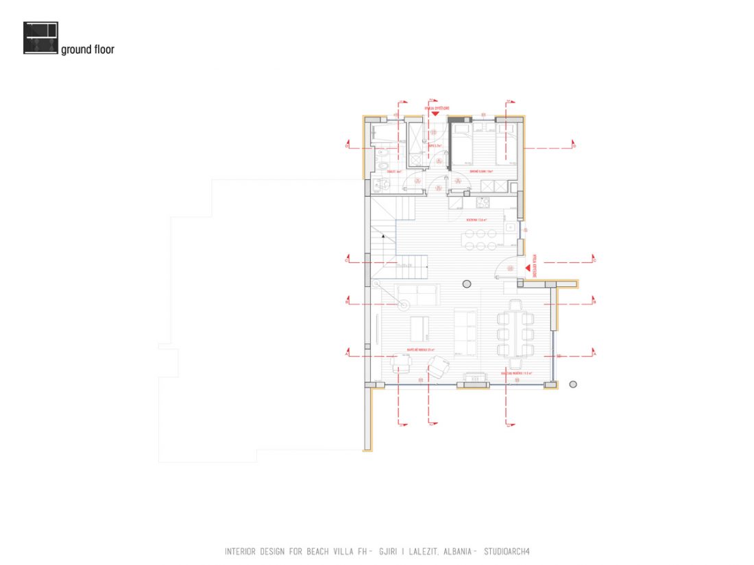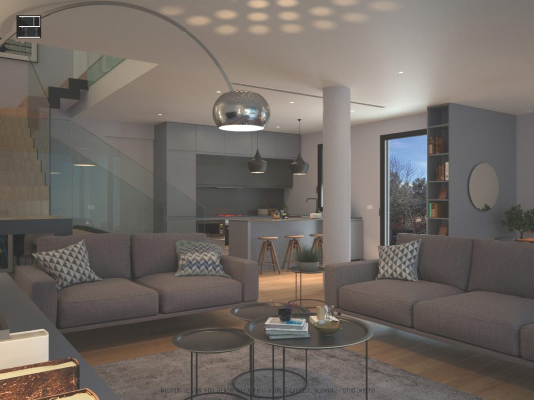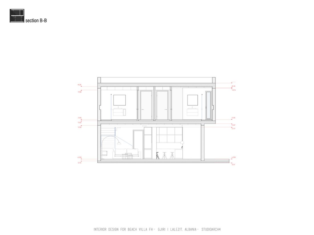 EN_This project is a beach house at Gjiri i Lalëzit, designed for a family of 5. In terms of functional distribution, the ground floor hosts common activities (such as a living room organized near a fireplace, and a dinning space, both opened towards the sea view), utilitarian spaces ( kitchen and laundry room) as well as an extra room and a toilet. On the first floor, there are two master bedrooms on the west side, favored by the beach view; as well as the children’s bedroom on the east side. The hall between the bedrooms is a flexible space, which will be organized by the inhabitants to fit their needs or to adapt to different activities.
