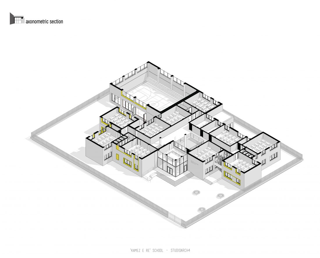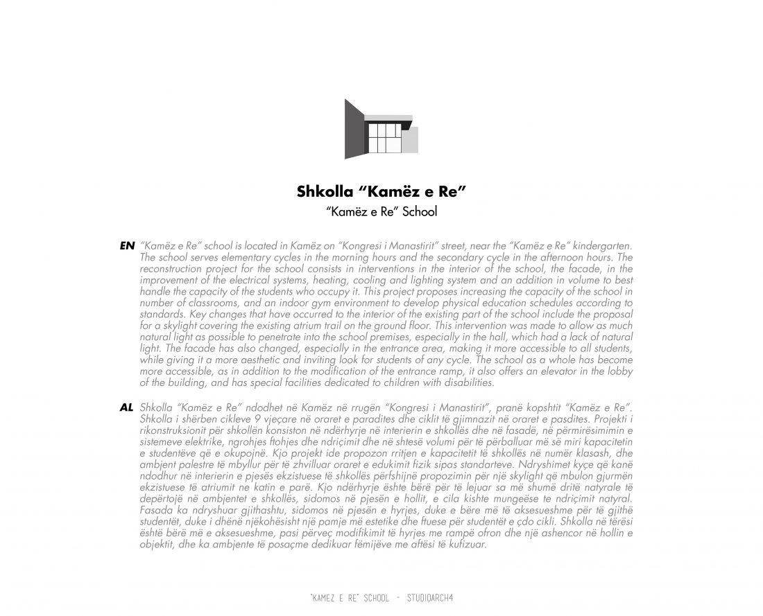 Shkolla “Kamëz e Re” ndodhet në Kamëz në rrugën “Kongresi i Manastirit”, pranë kopshtit “Kamëz e Re”. Shkolla i shërben cikleve 9 vjeçare në oraret e paradites dhe ciklit të gjimnazit në oraret e pasdites. Projekti i rikonstruksionit për shkollën konsiston në ndërhyrje në interierin e shkollës dhe në fasadë, në përmirësimimin e sistemeve elektrike, ngrohjes ftohjes dhe ndriçimit dhe në shtesë volumi për të përballuar më së miri kapacitetin e studentëve që e okupojnë. Kjo projekt ide propozon rritjen e kapacitetit të shkollës në numër klasash, dhe ambjent palestre të mbyllur për të zhvilluar oraret e edukimit fizik sipas standarteve. Ndryshimet kyçe që kanë ndodhur në interierin e pjesës ekzistuese të shkollës përfshijnë propozimin për një skylight që mbulon gjurmën ekzistuese të atriumit ne katin e parë. Kjo ndërhyrje ështe bërë për të lejuar sa më shumë dritë natyrale të depërtojë në ambjentet e shkollës, sidomos në pjesën e hollit, e cila kishte mungeëse te ndriçimit natyral. Fasada ka ndryshuar gjithashtu, sidomos në pjesën e hyrjes, duke e bëre më të aksesueshme për të gjithë studentët, duke i dhënë njëkohësisht një pamje më estetike dhe ftuese për studentët e çdo cikli. Shkolla në tërësi është bërë më e aksesueshme, pasi përveç modifikimit të hyrjes me rampë ofron dhe një ashencor në hollin e objektit, dhe ka ambjente të posaçme dedikuar fëmijëve me aftësi të kufizuar.