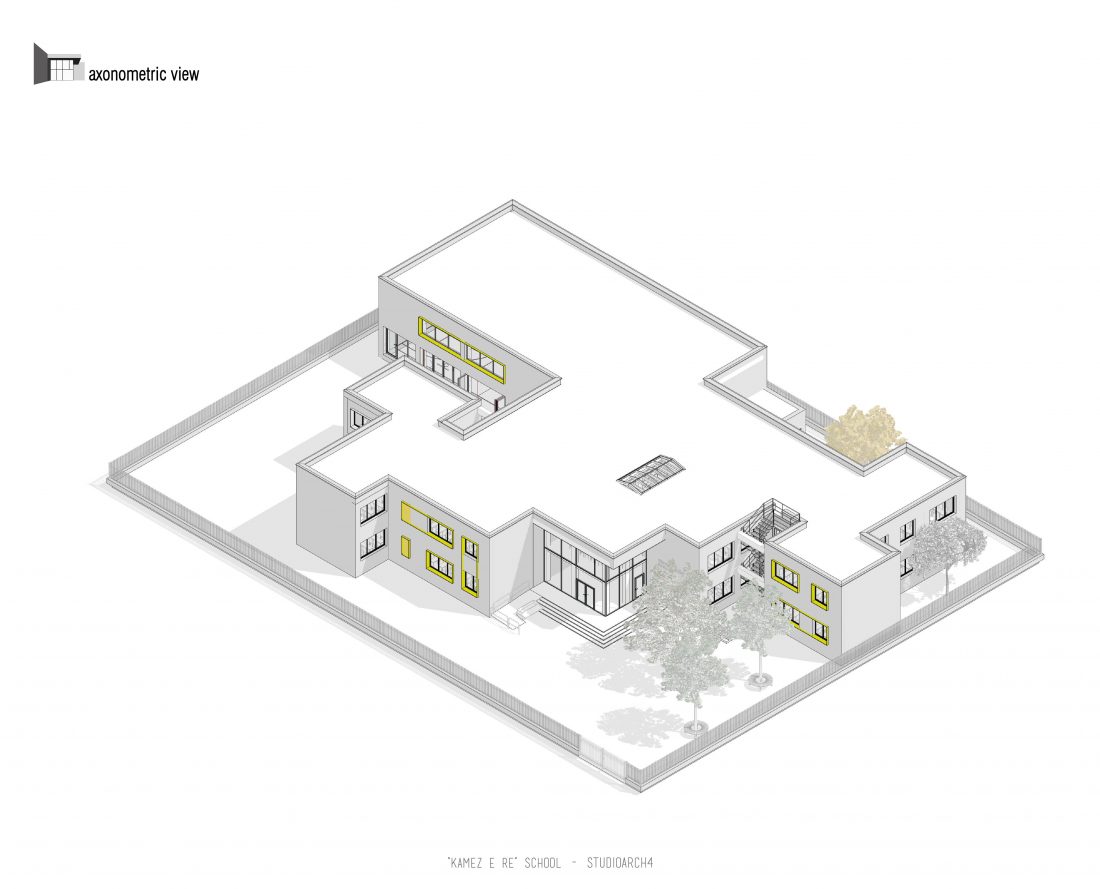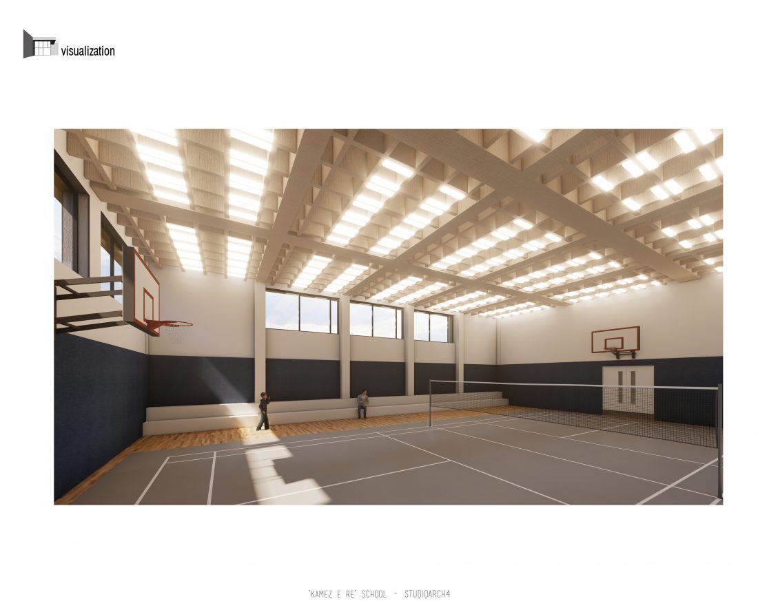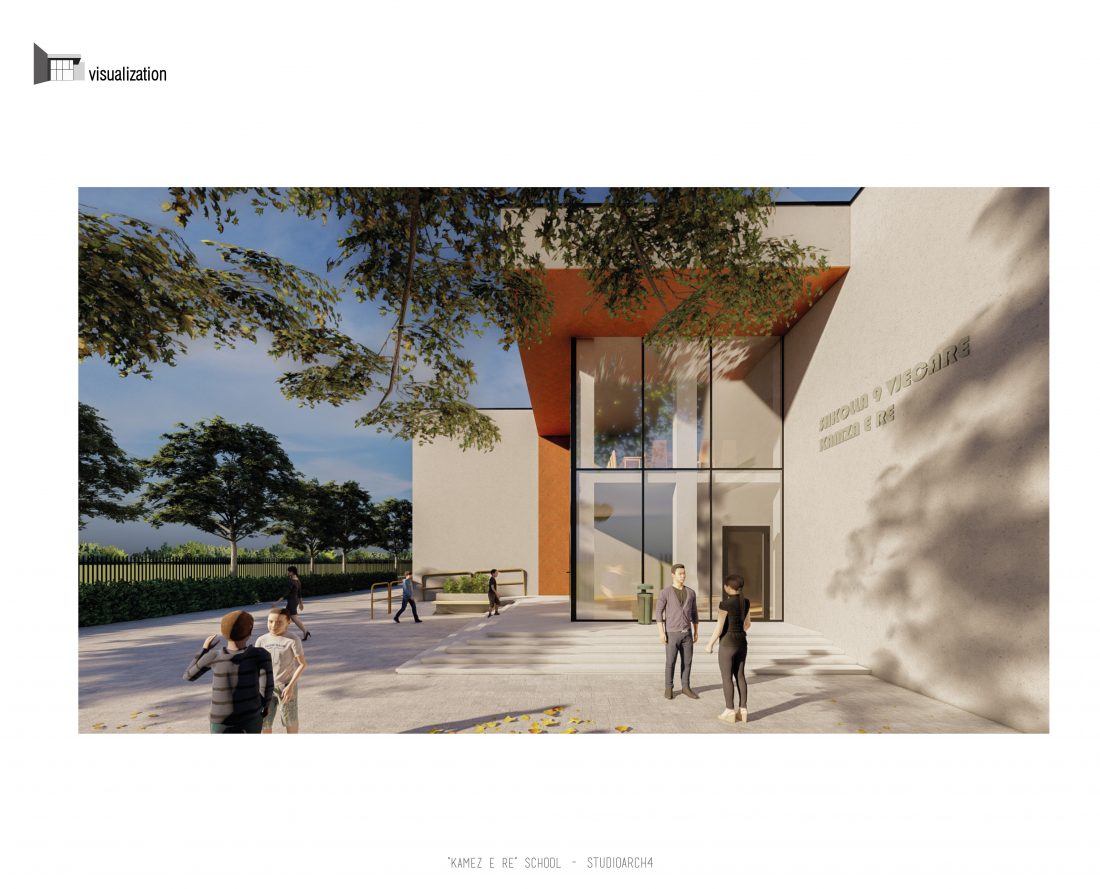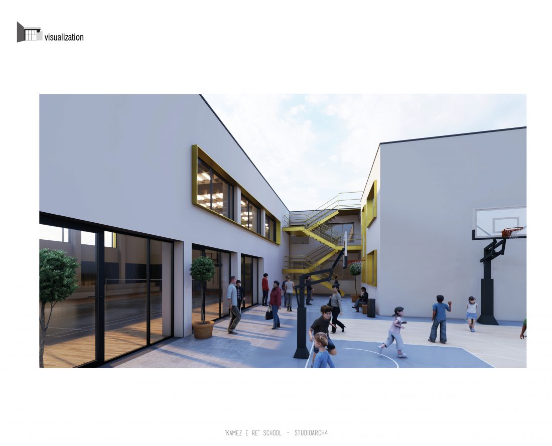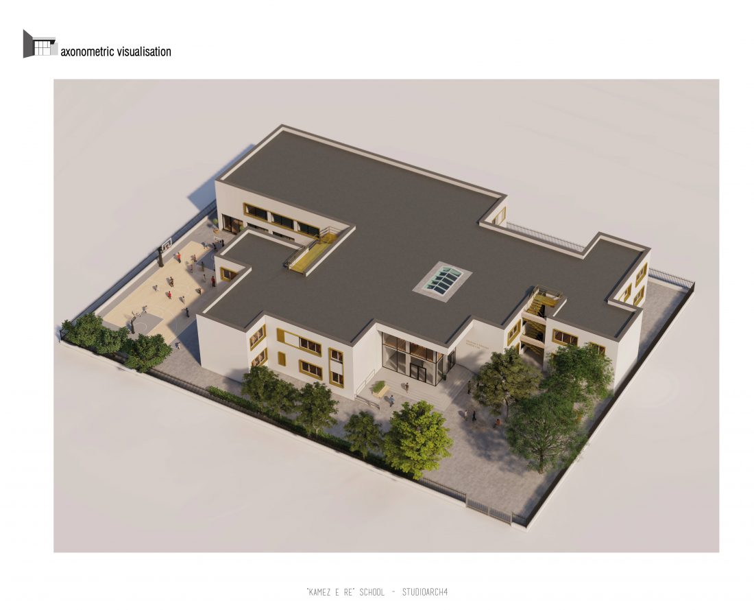 “Kamëz e Re” school is located in Kamëz on “Kongresi i Manastirit” street, near the “Kamëz e Re” kindergarten. The school serves elementary cycles in the morning hours and the secondary cycle in the afternoon hours. The reconstruction project for the school consists in interventions in the interior of the school, the facade, in the improvement of the electrical systems, heating, cooling and lighting system and an addition in volume to best handle the capacity of the students who occupy it. This project proposes increasing the capacity of the school in number of classrooms, and an indoor gym environment to develop physical education schedules according to standards. Key changes that have occurred to the interior of the existing part of the school include the proposal for a skylight covering the existing atrium trail on the ground floor. This intervention was made to allow as much natural light as possible to penetrate into the school premises, especially in the hall, which had a lack of natural light. The facade has also changed, especially in the entrance area, making it more accessible to all students, while giving it a more aesthetic and inviting look for students of any cycle. The school as a whole has become more accessible, as in addition to the modification of the entrance ramp, it also offers an elevator in the lobby of the building, and has special facilities dedicated to children with disabilities.