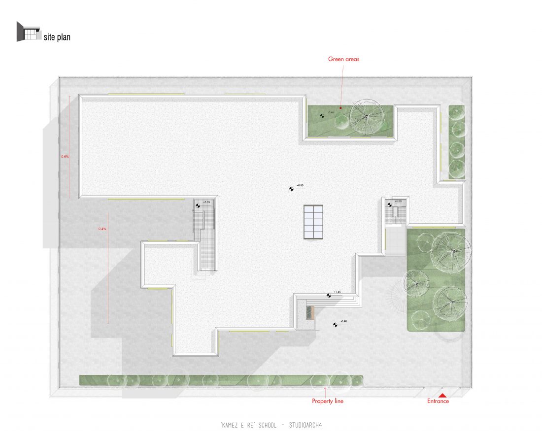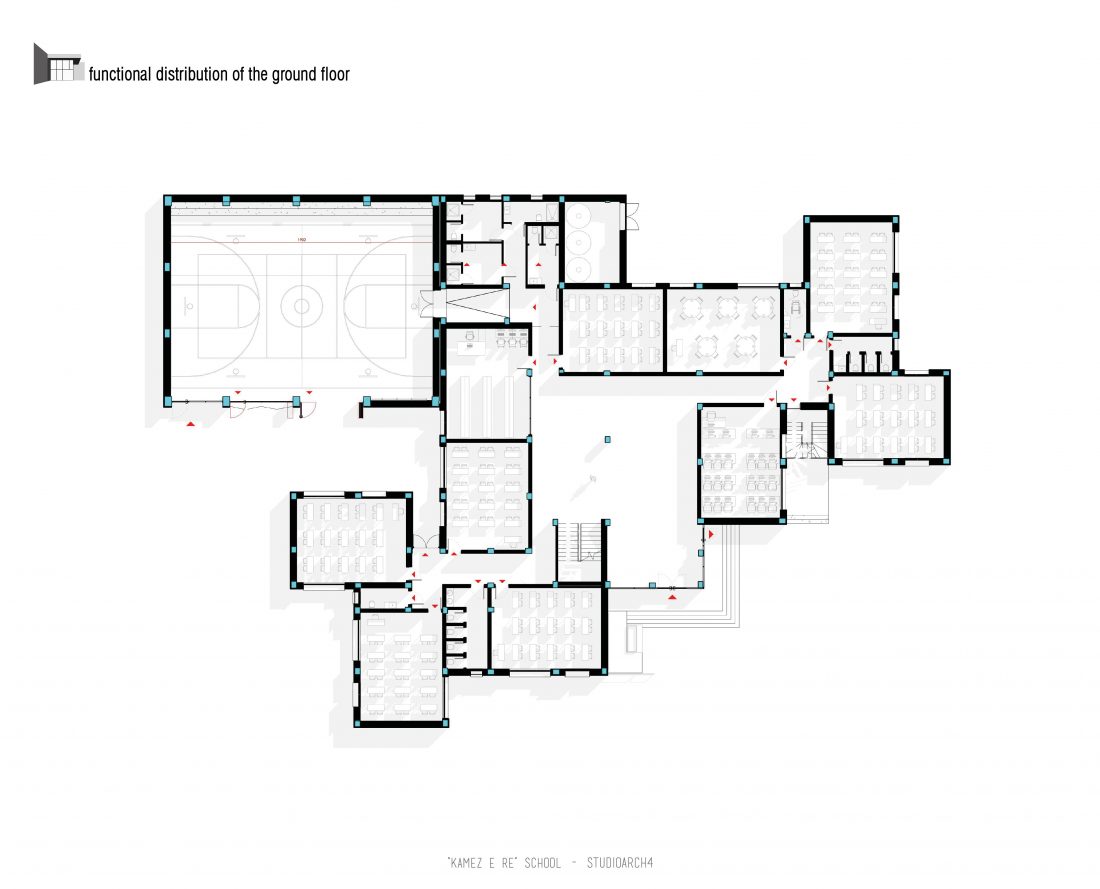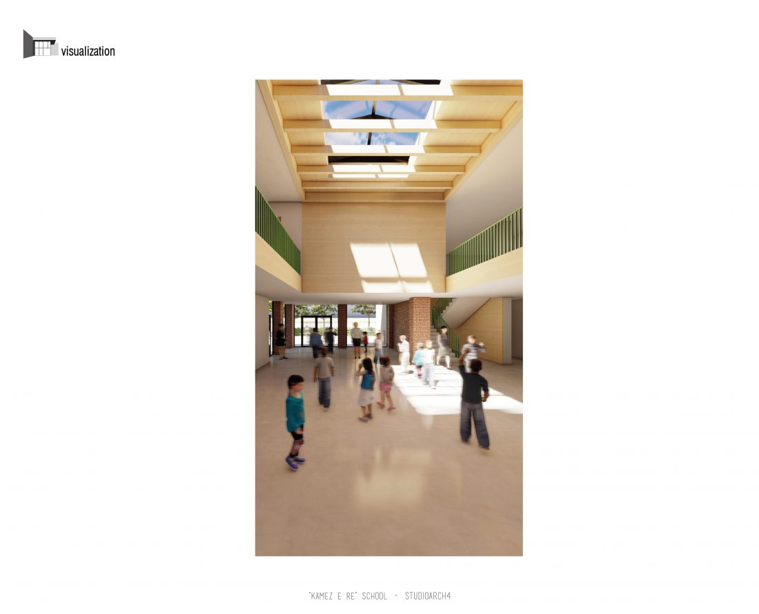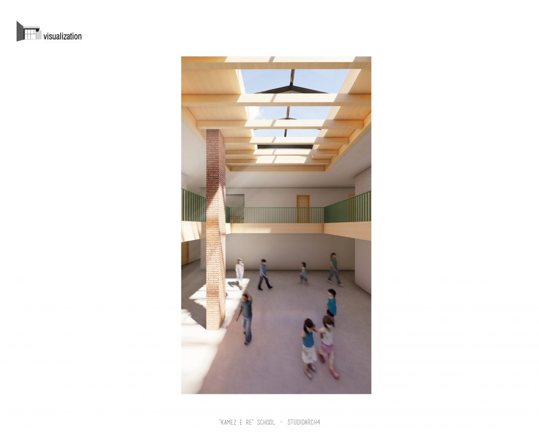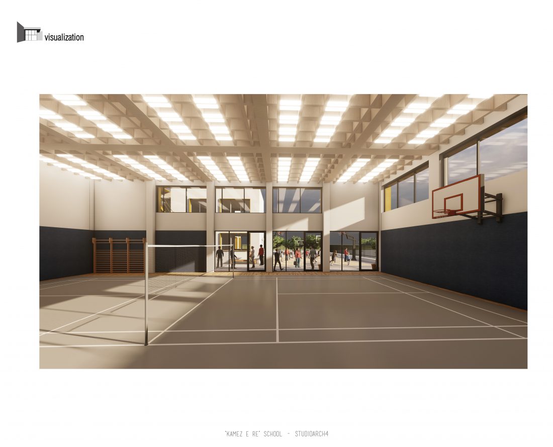 “Kamëz e Re” school is located in Kamëz on “Kongresi i Manastirit” street, near the “Kamëz e Re” kindergarten. The school serves elementary cycles in the morning hours and the secondary cycle in the afternoon hours. The reconstruction project for the school consists in interventions in the interior of the school, the facade, in the improvement of the electrical systems, heating, cooling and lighting system and an addition in volume to best handle the capacity of the students who occupy it. This project proposes increasing the capacity of the school in number of classrooms, and an indoor gym environment to develop physical education schedules according to standards. Key changes that have occurred to the interior of the existing part of the school include the proposal for a skylight covering the existing atrium trail on the ground floor. This intervention was made to allow as much natural light as possible to penetrate into the school premises, especially in the hall, which had a lack of natural light. The facade has also changed, especially in the entrance area, making it more accessible to all students, while giving it a more aesthetic and inviting look for students of any cycle. The school as a whole has become more accessible, as in addition to the modification of the entrance ramp, it also offers an elevator in the lobby of the building, and has special facilities dedicated to children with disabilities.