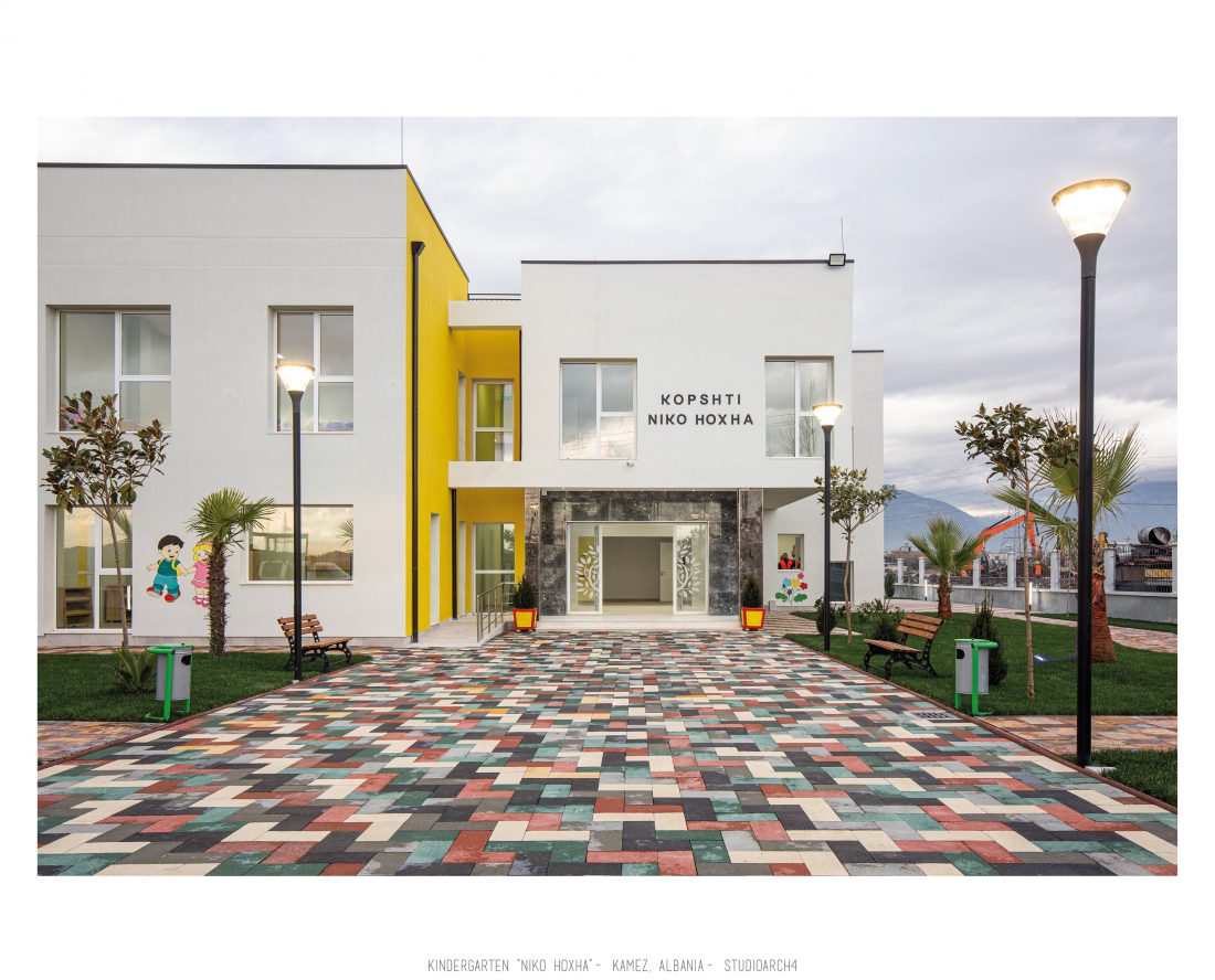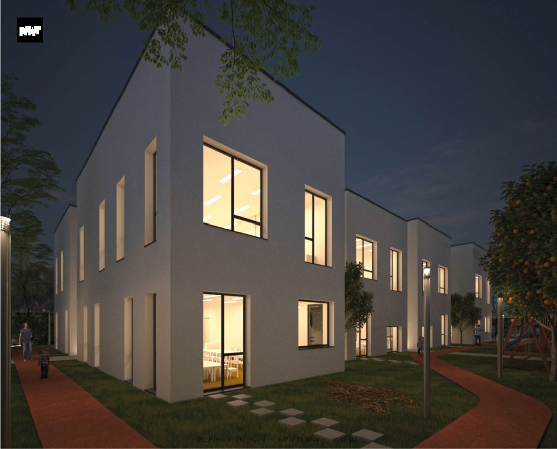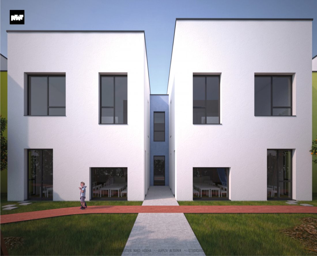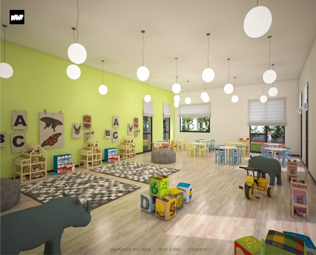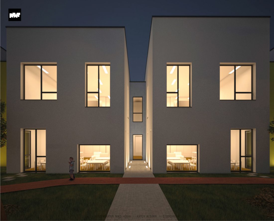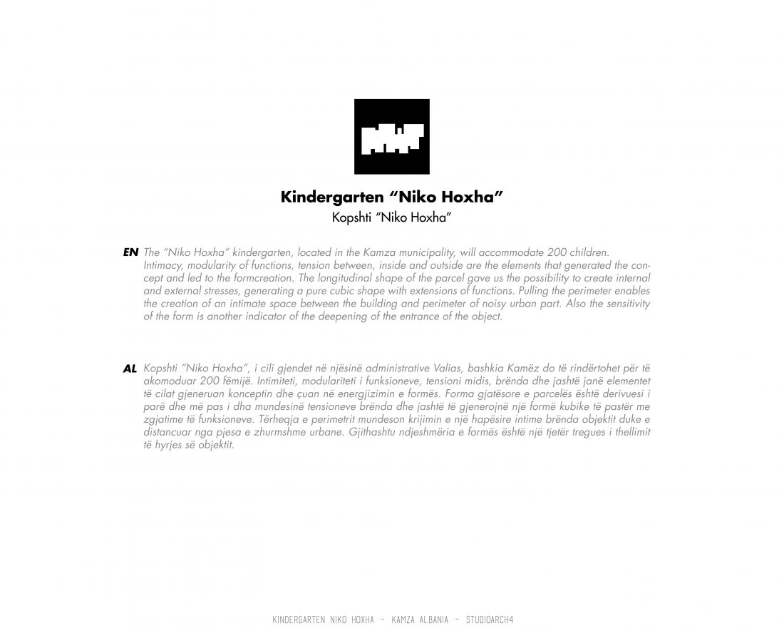 Kopshti “Niko Hoxha”, i cili gjendet në njësinë administrative Valias, bashkia Kamëz do të rindërtohet për të akomoduar 200 fëmijë. Intimiteti, modulariteti i funksioneve, tensioni midis, brënda dhe jashtë janë elementet të cilat gjeneruan konceptin dhe çuan në energjizimin e formës. Forma gjatësore e parcelës është derivuesi i parë dhe më pas i dha mundesinë tensioneve brënda dhe jashtë të gjenerojnë një formë kubike të pastër me zgjatime të funksioneve. Tërheqja e perimetrit mundeson krijimin e një hapësire intime brënda objektit duke e distancuar nga pjesa e zhurmshme urbane. Gjithashtu ndjeshmëria e formës është një tjetër tregues i thellimit të hyrjes së objektit.