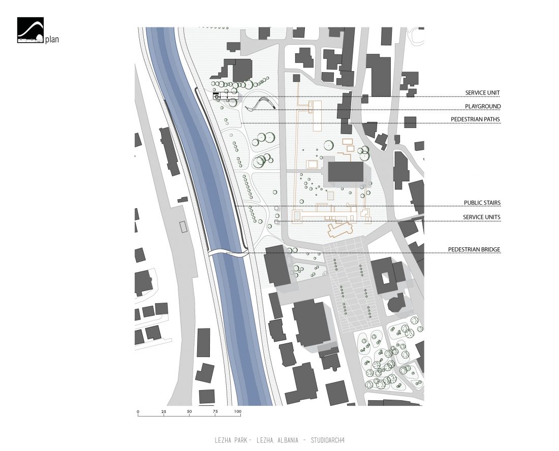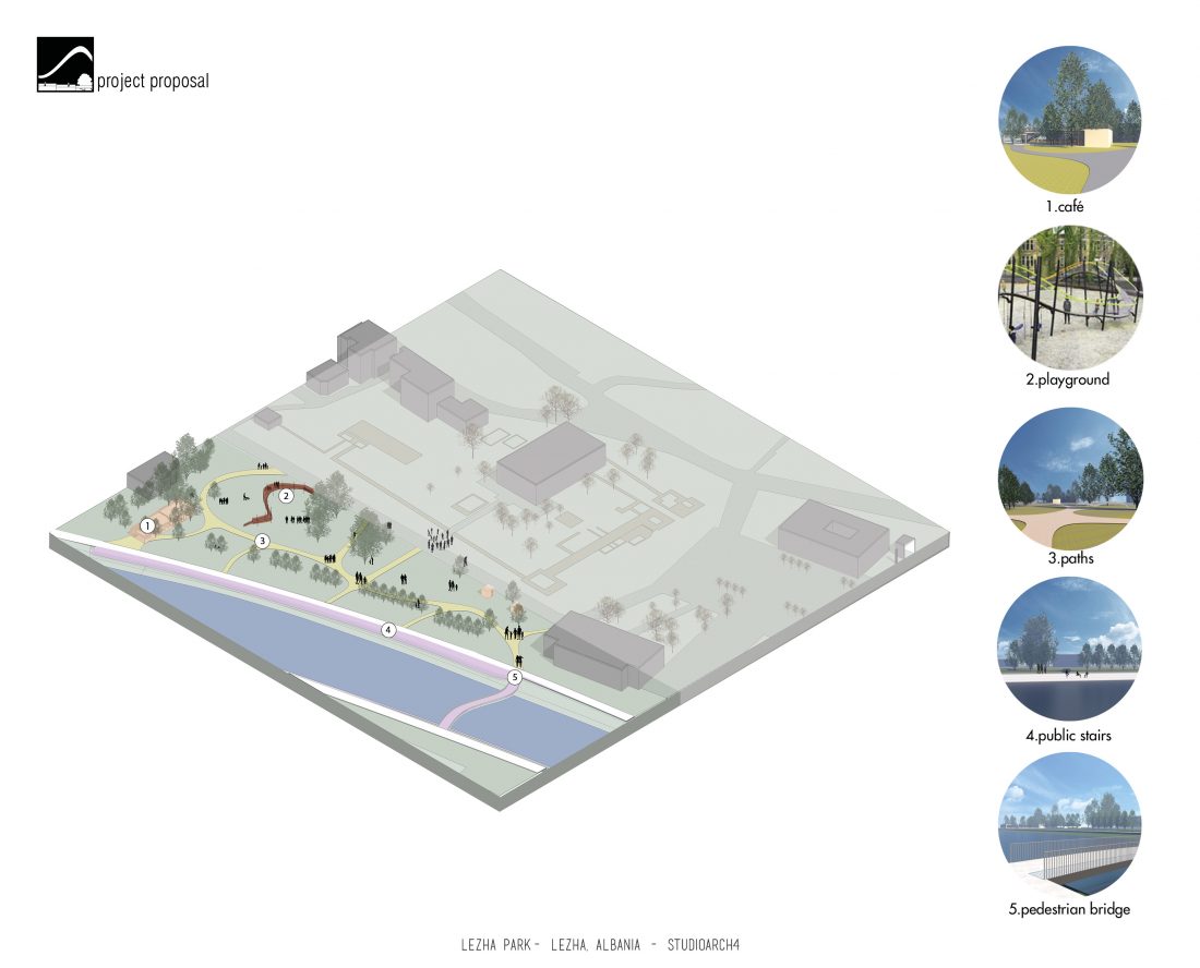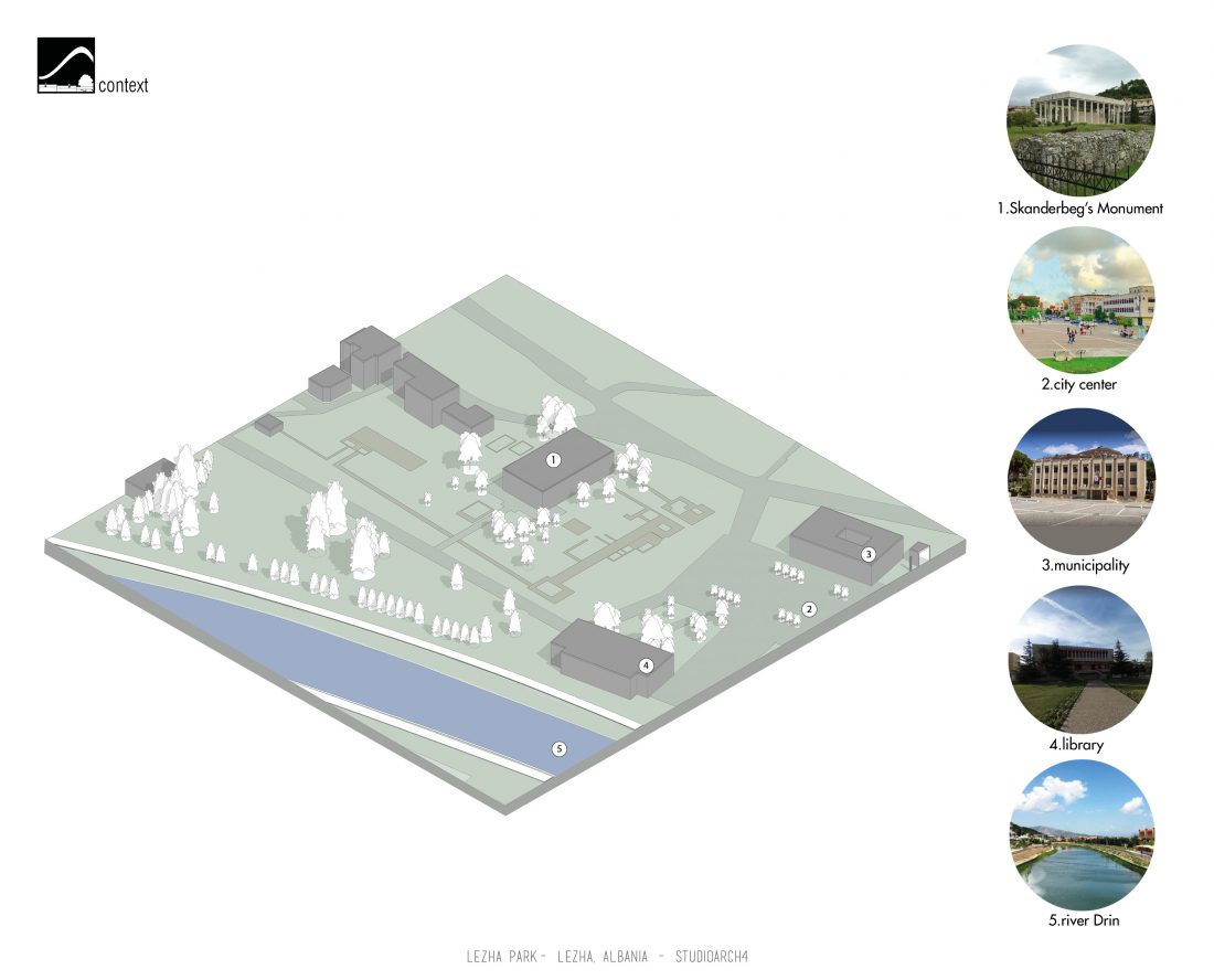 The site of this project is a park in the city of Lezha. Its location is strategic because it’s where many of the city’s flows meet: it’s situated near the river, the historic area which also includes Skanderbeg’s monument, the city’s center square which is surrounded by relevant buildings such as : the cultural center, the library & the municipality.