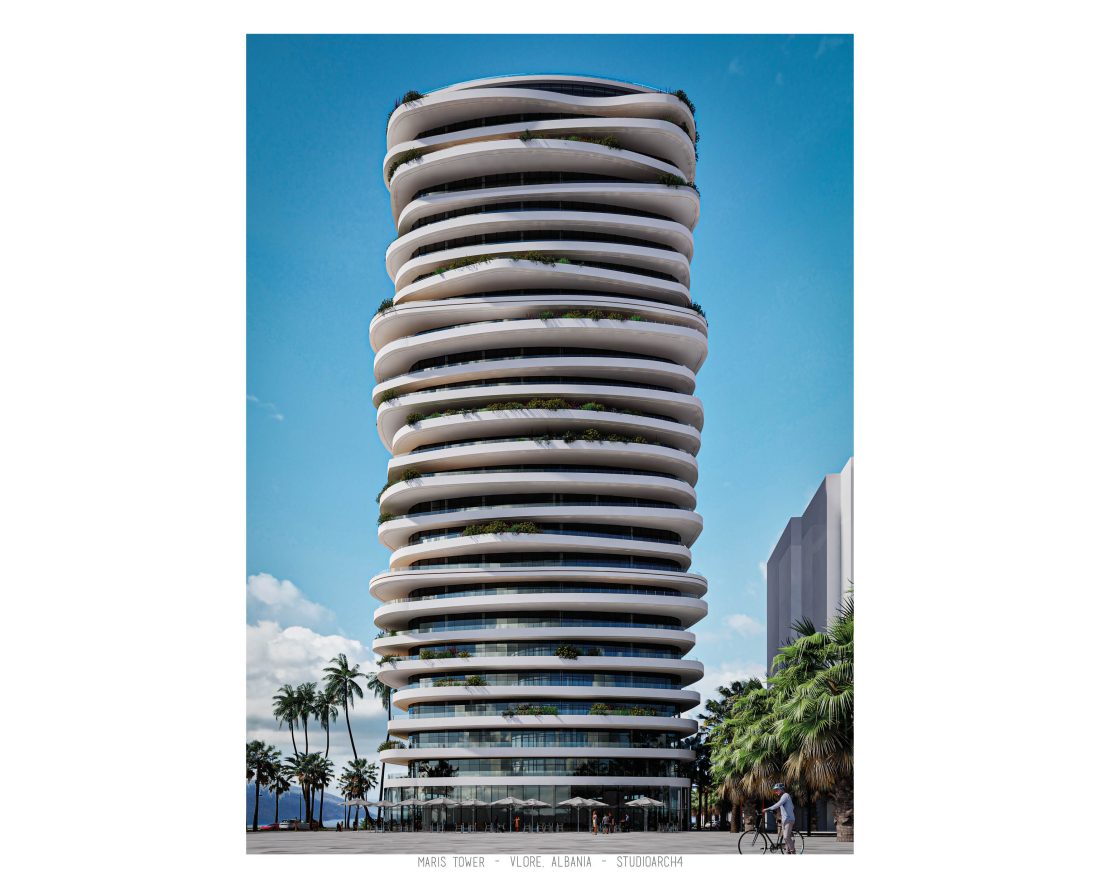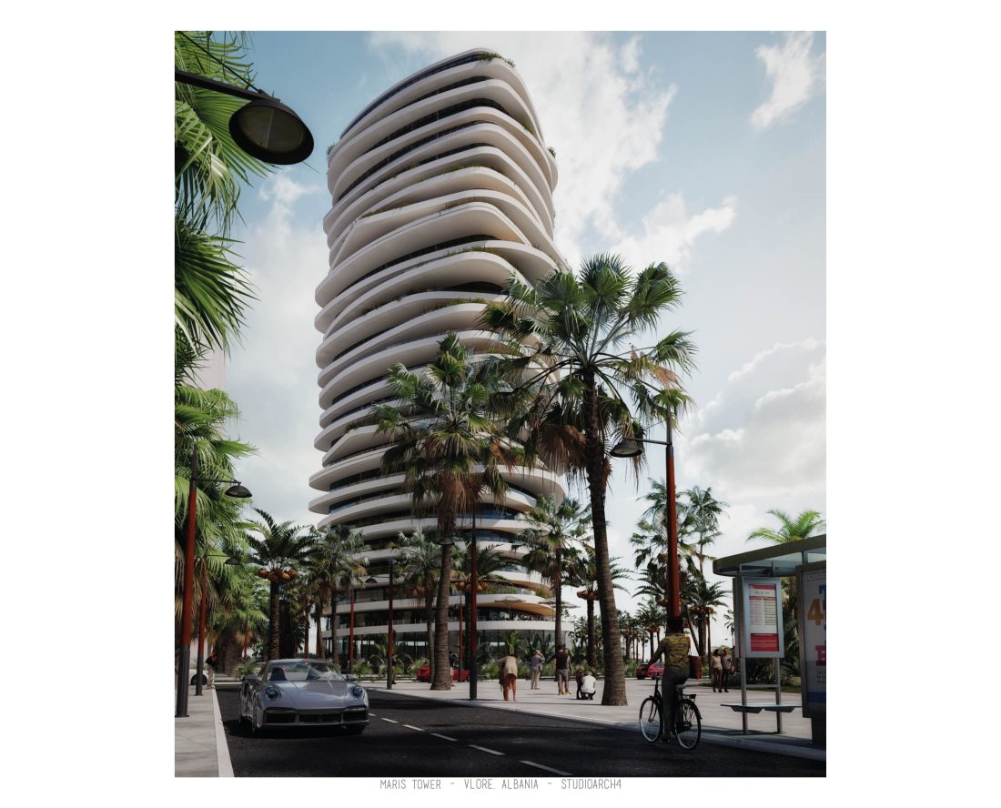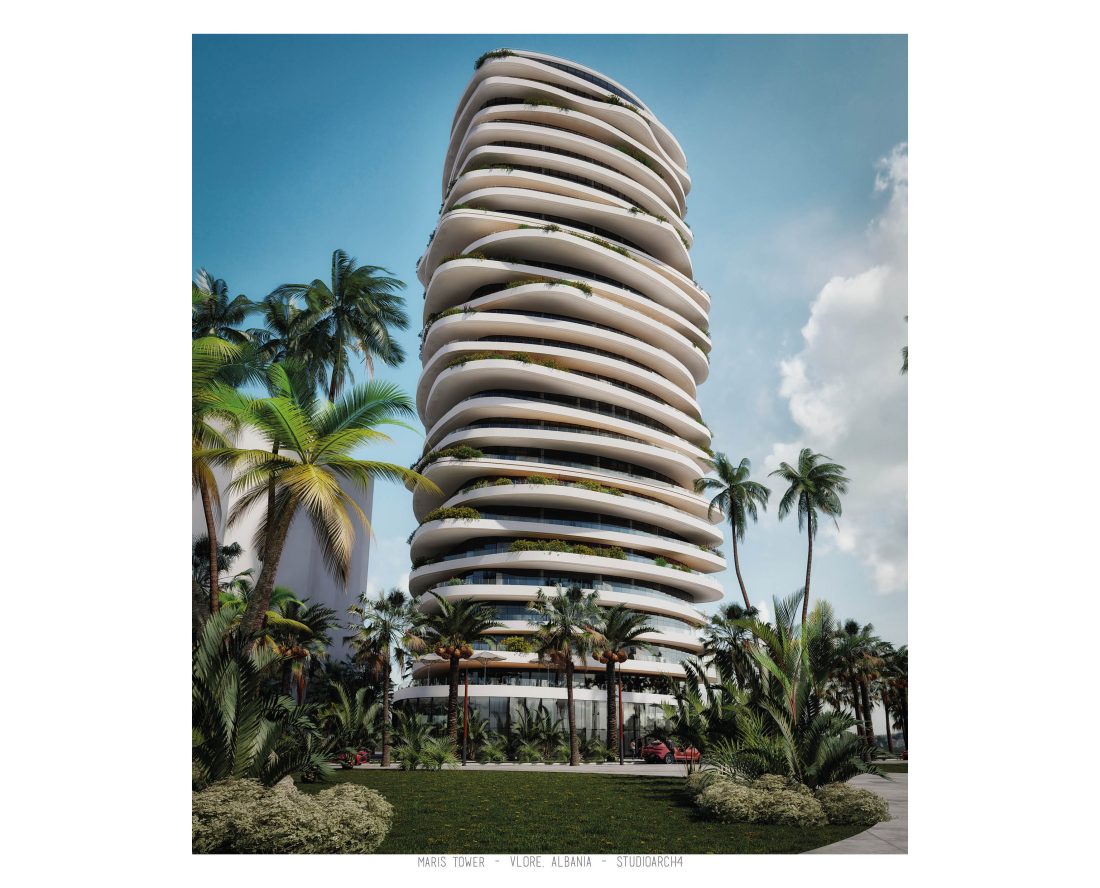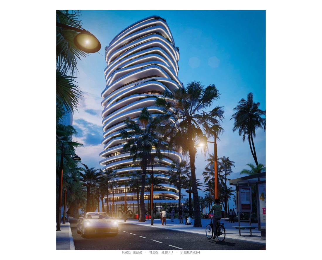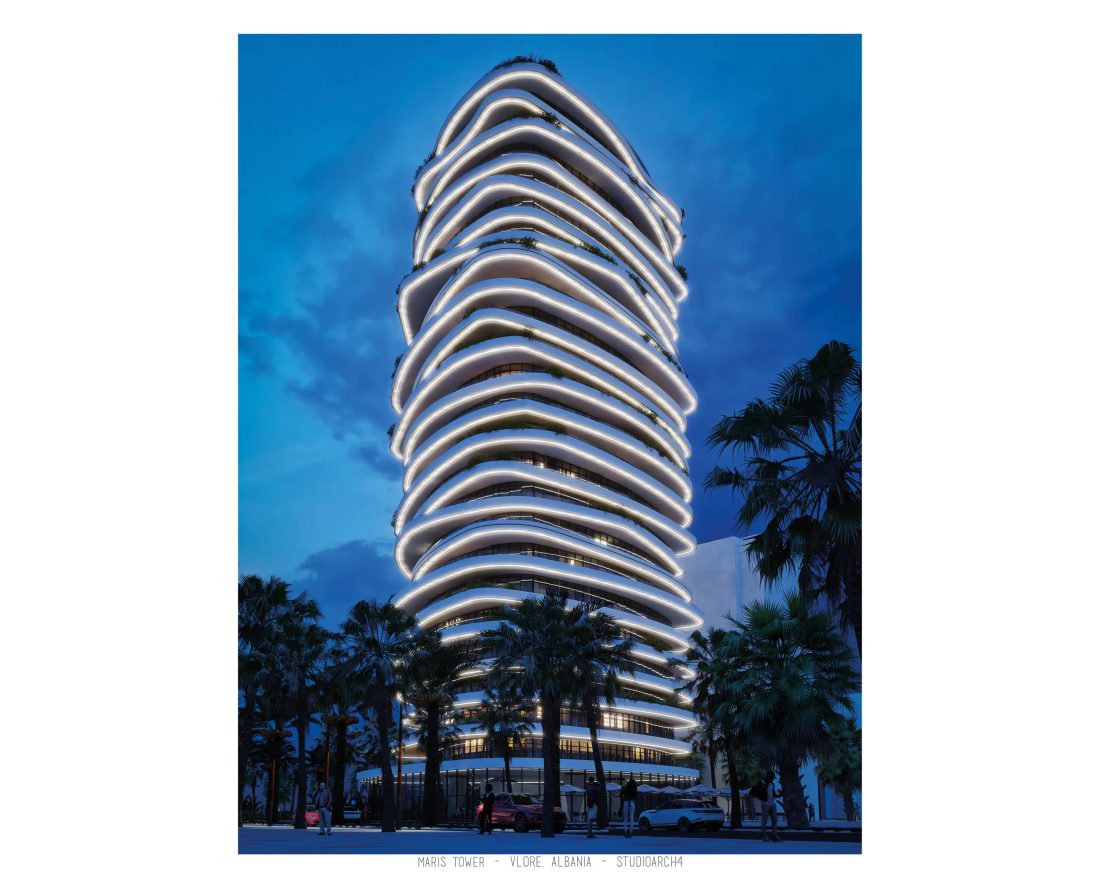 The building is a modern mixed-use structure with 25 floors above ground and 4 underground levels, covering a total built area of 23,803.73 m², located in Vlorë, Albania. It includes commercial services on the lower floors, residential units on the middle floors, and a hotel on the upper floors, offering a multifunctional space that serves both the local community and visitors.