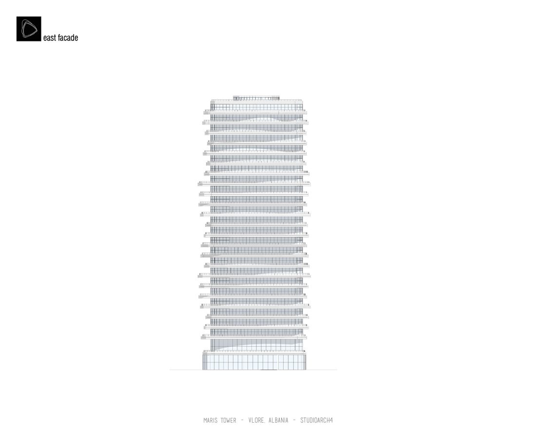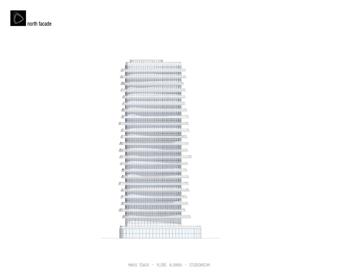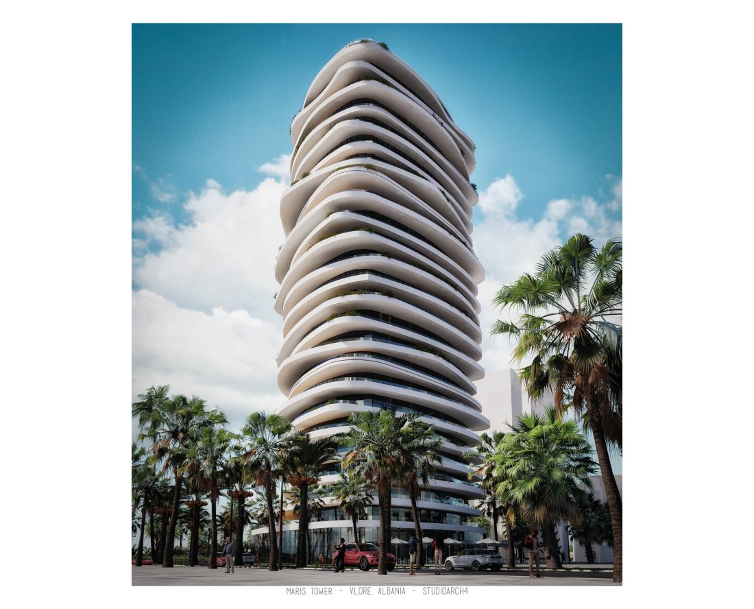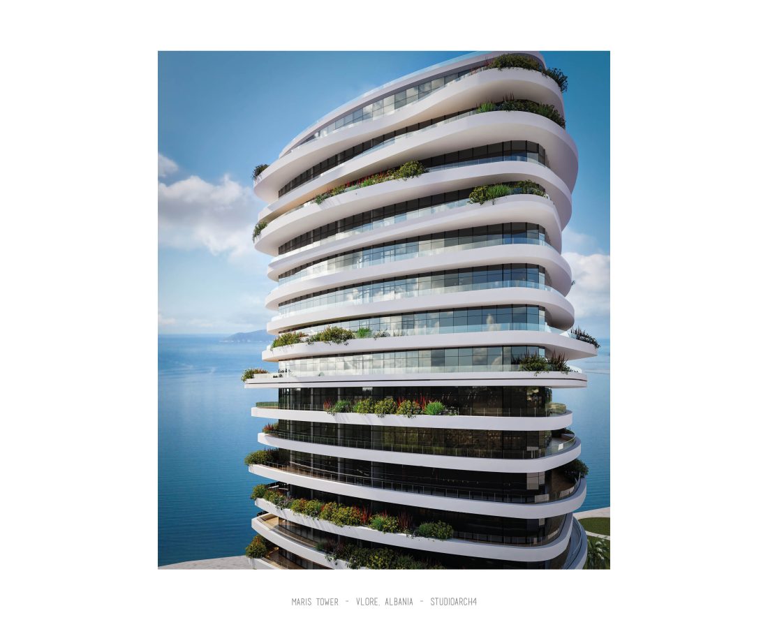The building is a modern mixed-use structure with 25 floors above ground and 4 underground levels, covering a total built area of 23,803.73 m², located in Vlorë, Albania. It includes commercial services on the lower floors, residential units on the middle floors, and a hotel on the upper floors, offering a multifunctional space that serves both the local community and visitors.