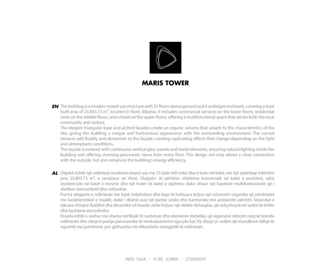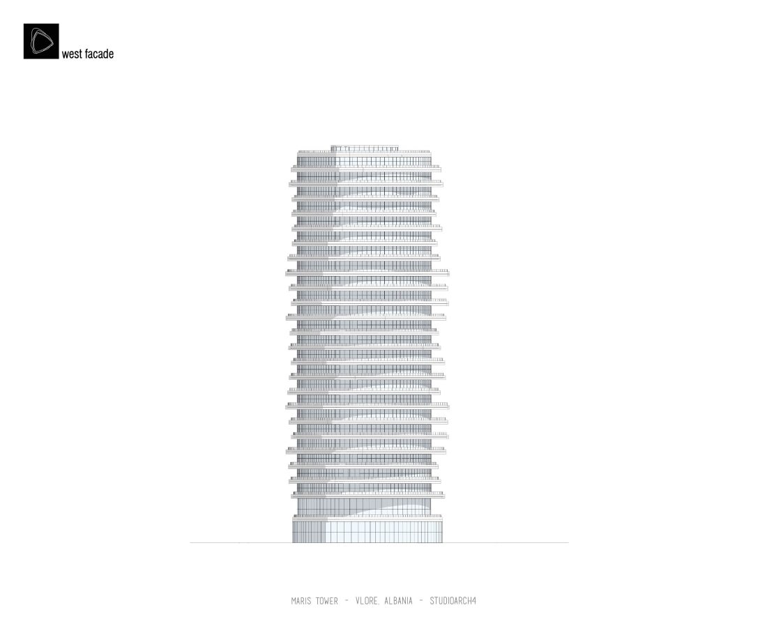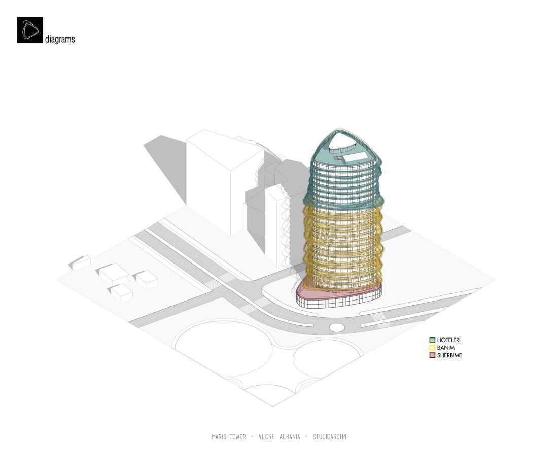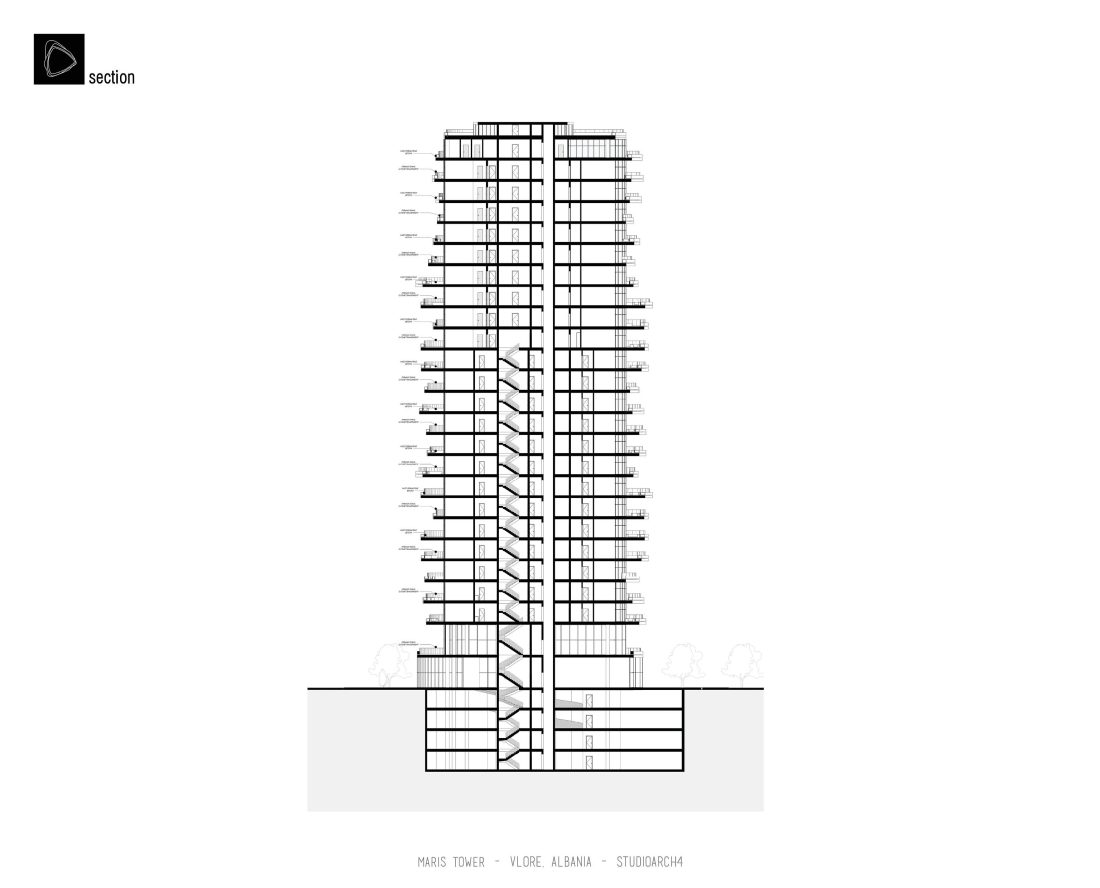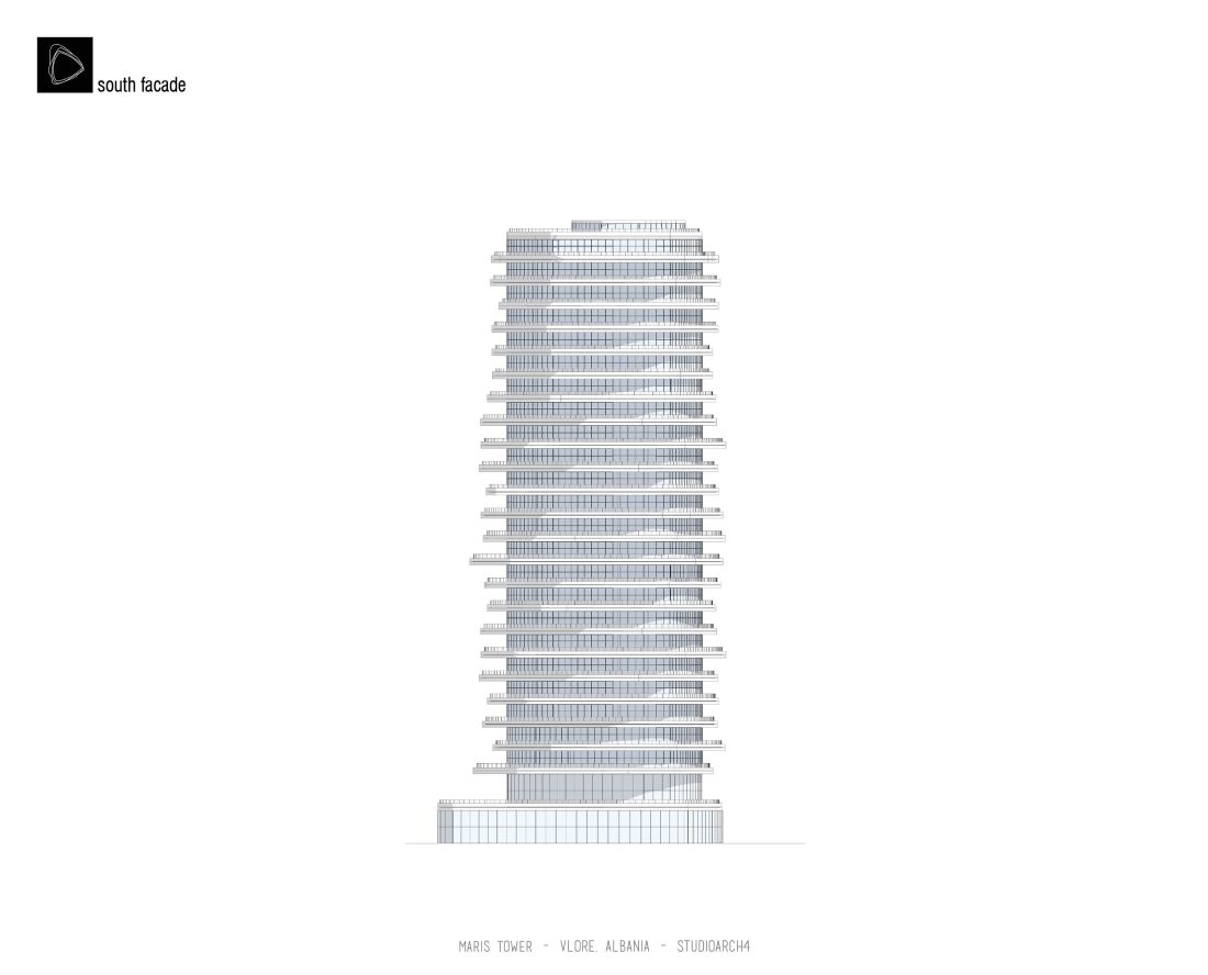 The building is a modern mixed-use structure with 25 floors above ground and 4 underground levels, covering a total built area of 23,803.73 m², located in Vlorë, Albania. It includes commercial services on the lower floors, residential units on the middle floors, and a hotel on the upper floors, offering a multifunctional space that serves both the local community and visitors.