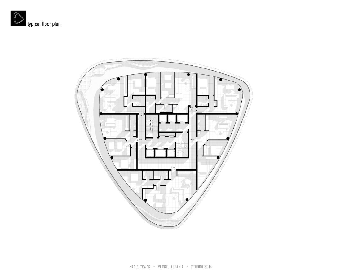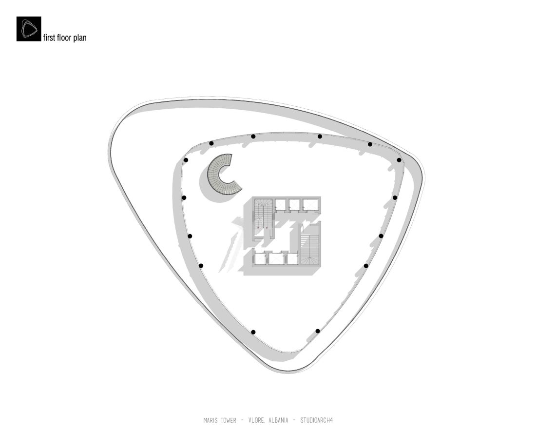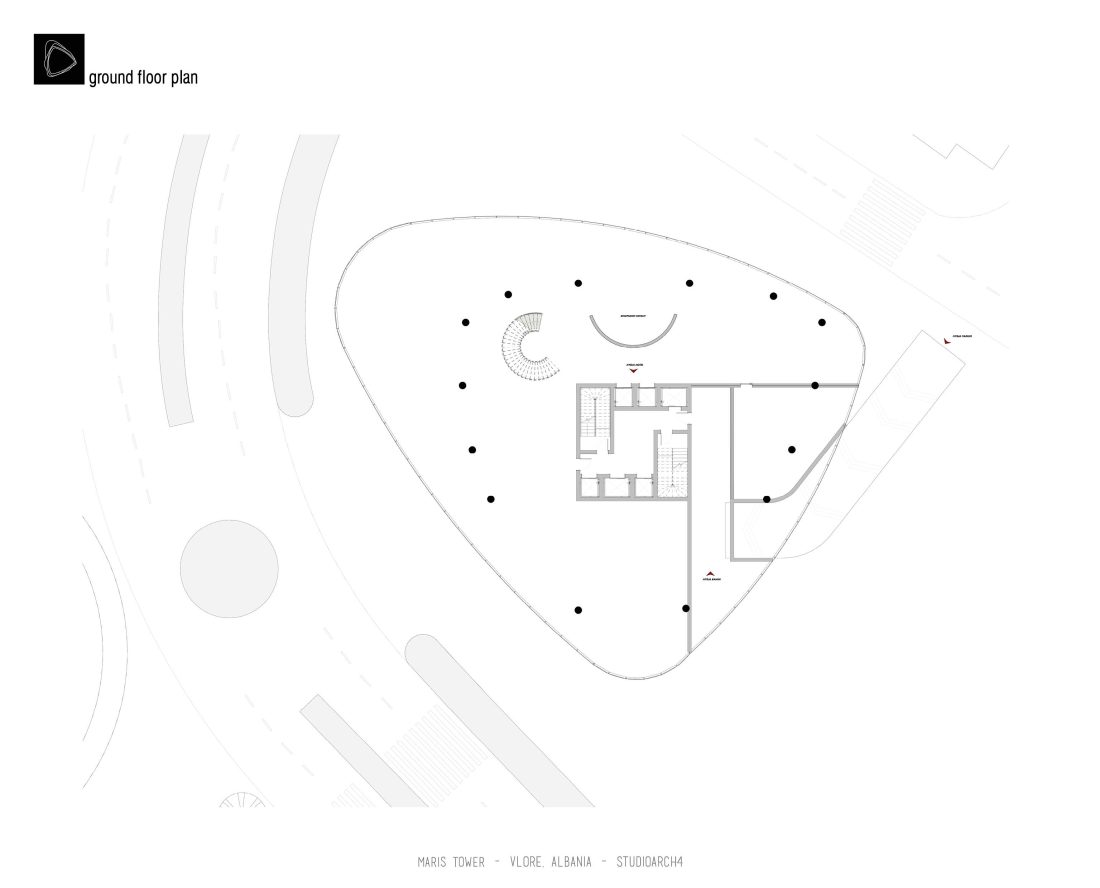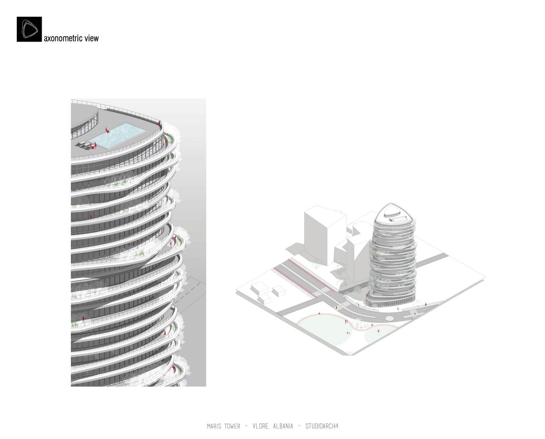 Forma elegante e ndërtesës me bazë trekëndore dhe faqe të harkuara krijon një volumetri organike që përshtatet me karakteristikat e truallit, duke i dhënë asaj një pamje unike dhe harmonike me ambientin përreth. Verandat e lakuara shtojnë fluiditet dhe dinamikë në fasadë, duke krijuar një efekte tërheqëse, që ndryshojnë në varësi të dritës dhe kushteve atmosferike.