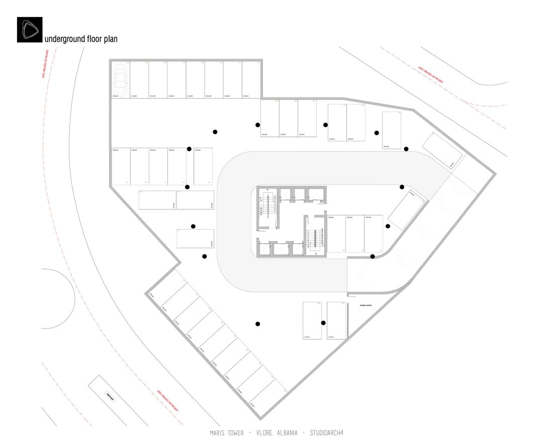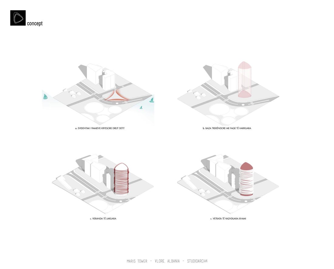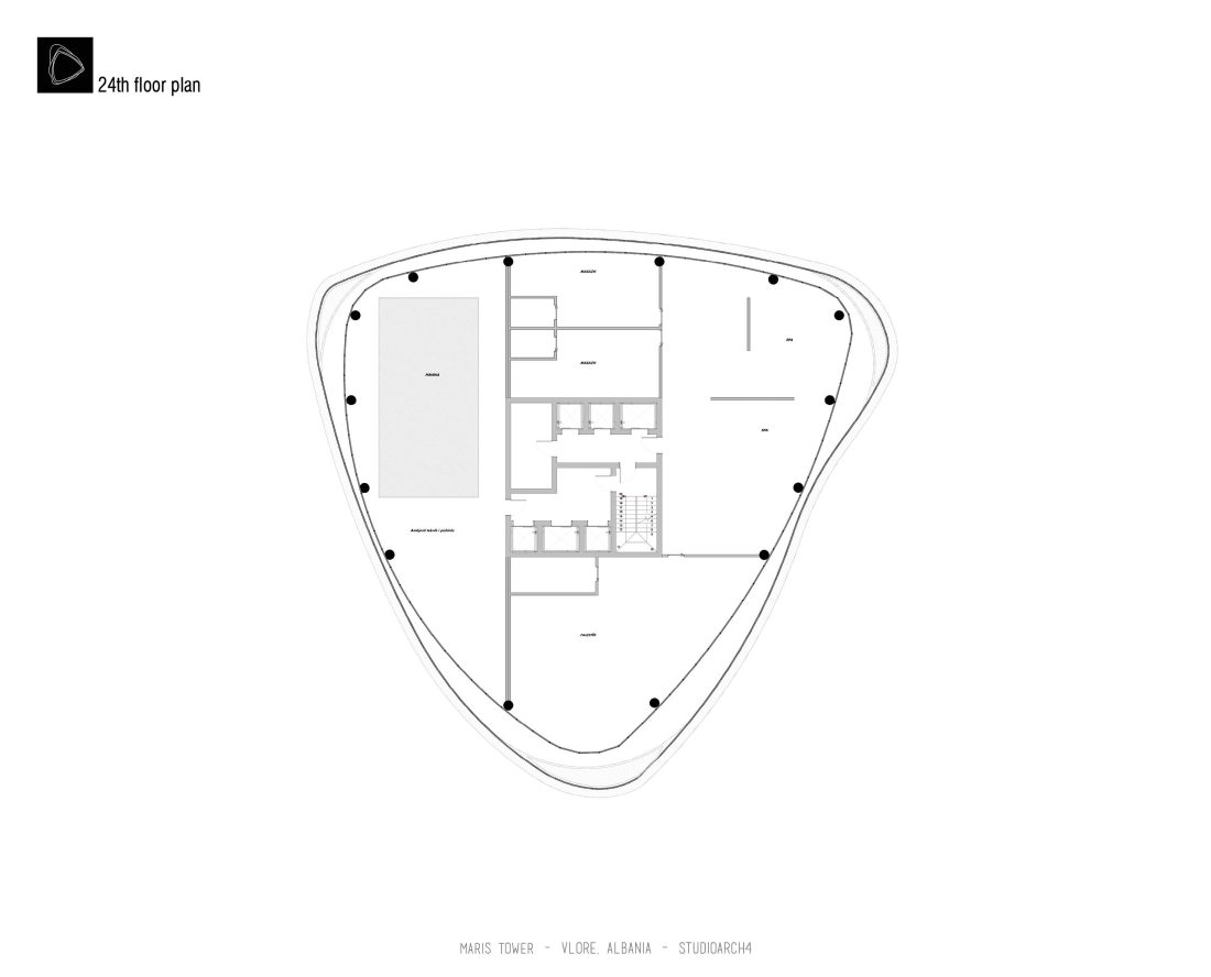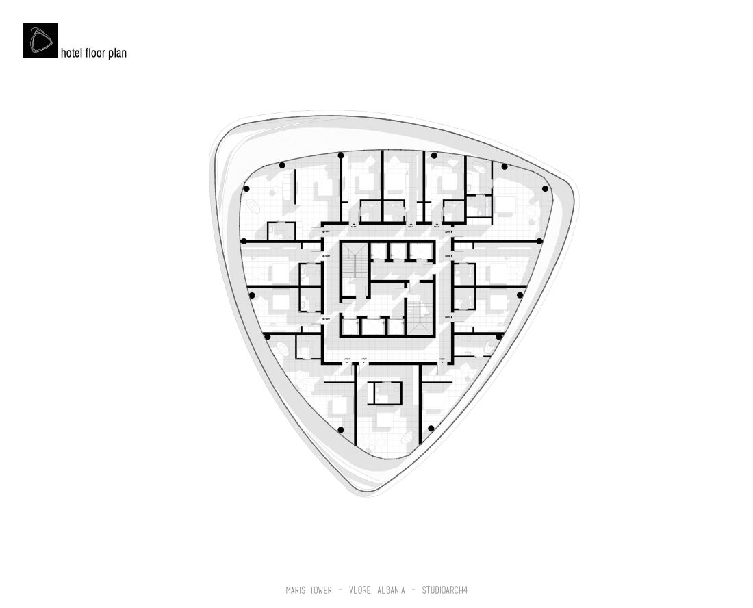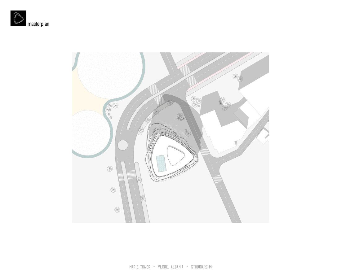 Forma elegante e ndërtesës me bazë trekëndore dhe faqe të harkuara krijon një volumetri organike që përshtatet me karakteristikat e truallit, duke i dhënë asaj një pamje unike dhe harmonike me ambientin përreth. Verandat e lakuara shtojnë fluiditet dhe dinamikë në fasadë, duke krijuar një efekte tërheqëse, që ndryshojnë në varësi të dritës dhe kushteve atmosferike.