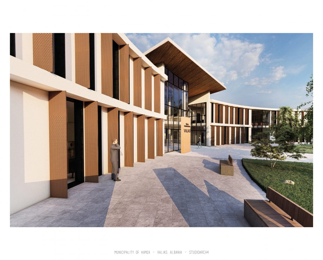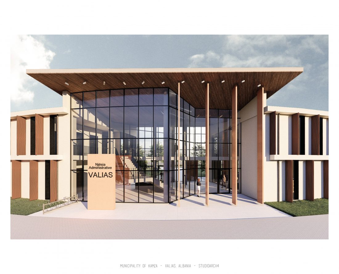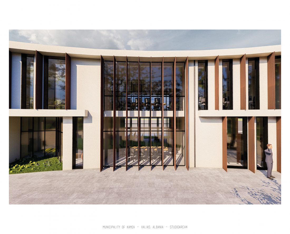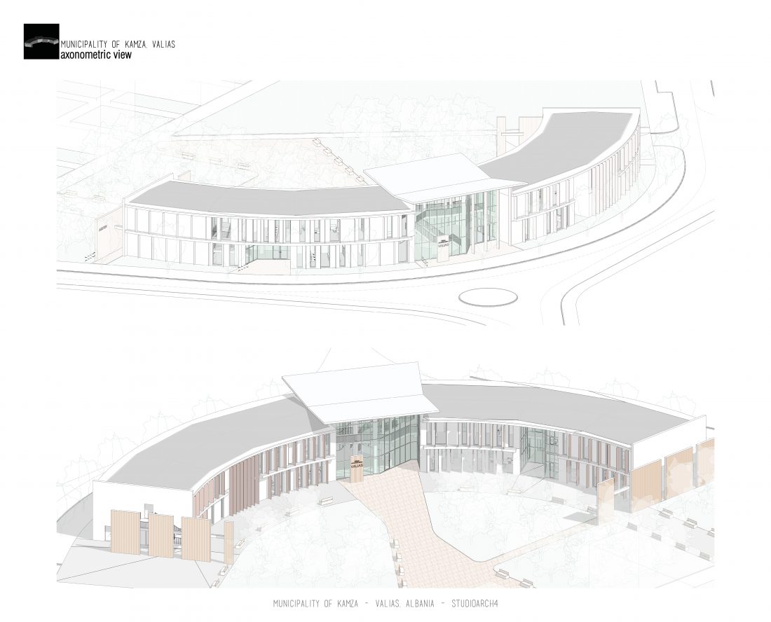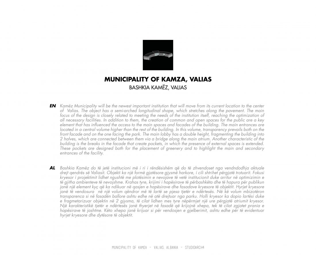 Kamëz Municipality will be the newest important institution that will move from its current location to the center of Valias. The object has a semi-arched longitudinal shape, which stretches along the pavement. The main focus of the design is closely related to meeting the needs of the institution itself, reaching the optimization of all necessary facilities. In addition to them, the creation of common and open spaces for the public are a key element that has influenced the access to the main spaces and facades of the building. The main entrances are located in a central volume higher than the rest of the building. In this volume, transparency prevails both on the front facade and on the one facing the park. The main lobby has a double height, fragmenting the building into 2 halves, which are connected between them via a bridge along the main atrium. Another characteristic of the building is the breaks in the facade that create pockets, in which the presence of external spaces is extended. These pockets are designed both for the placement of greenery and to highlight the main and secondary entrances of the facility.