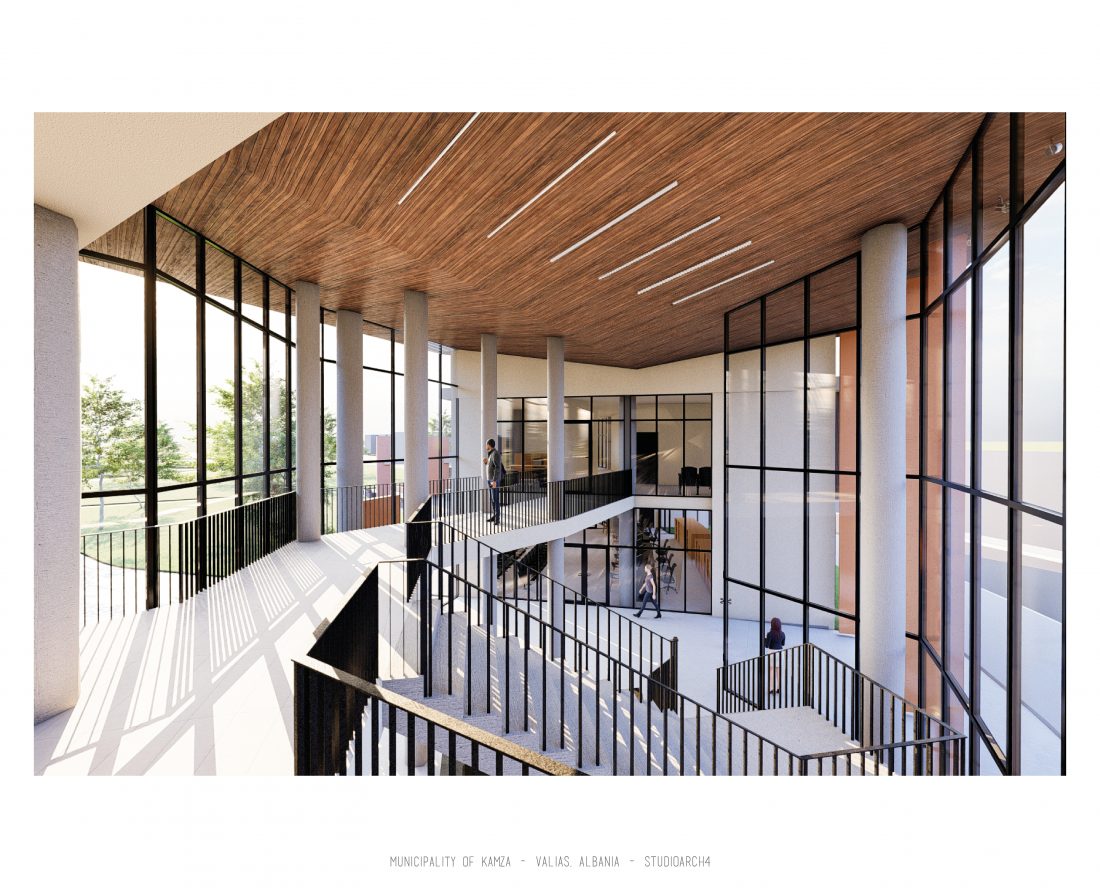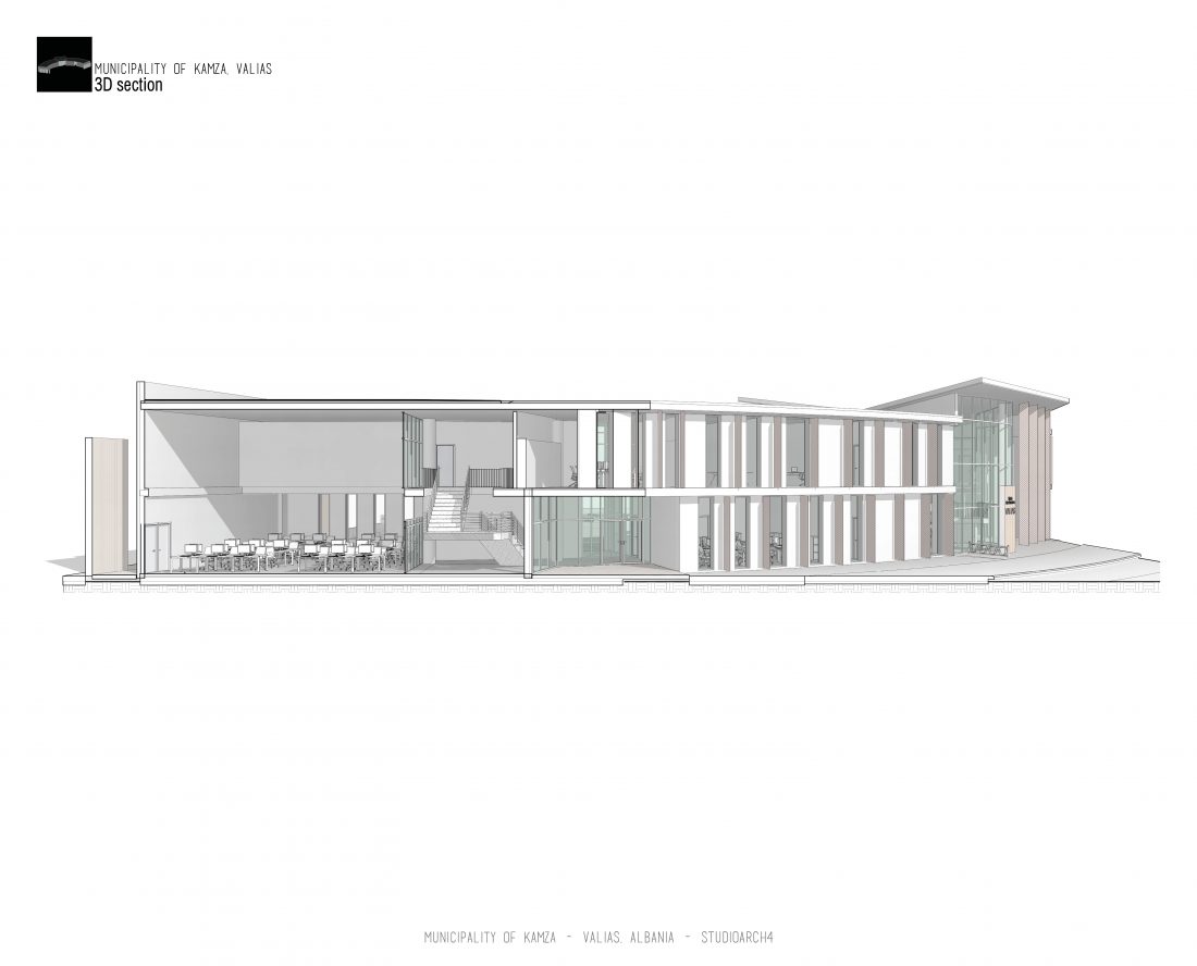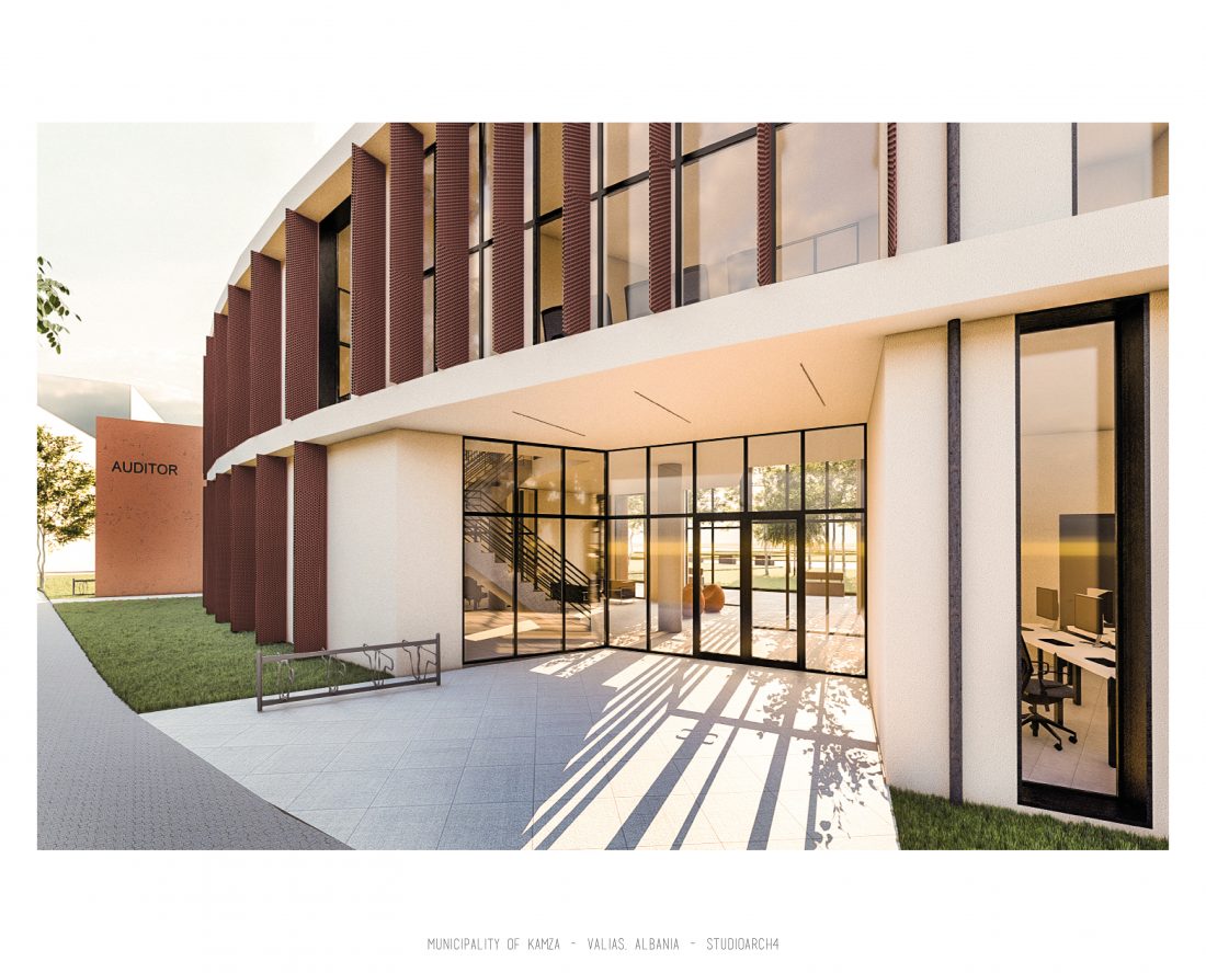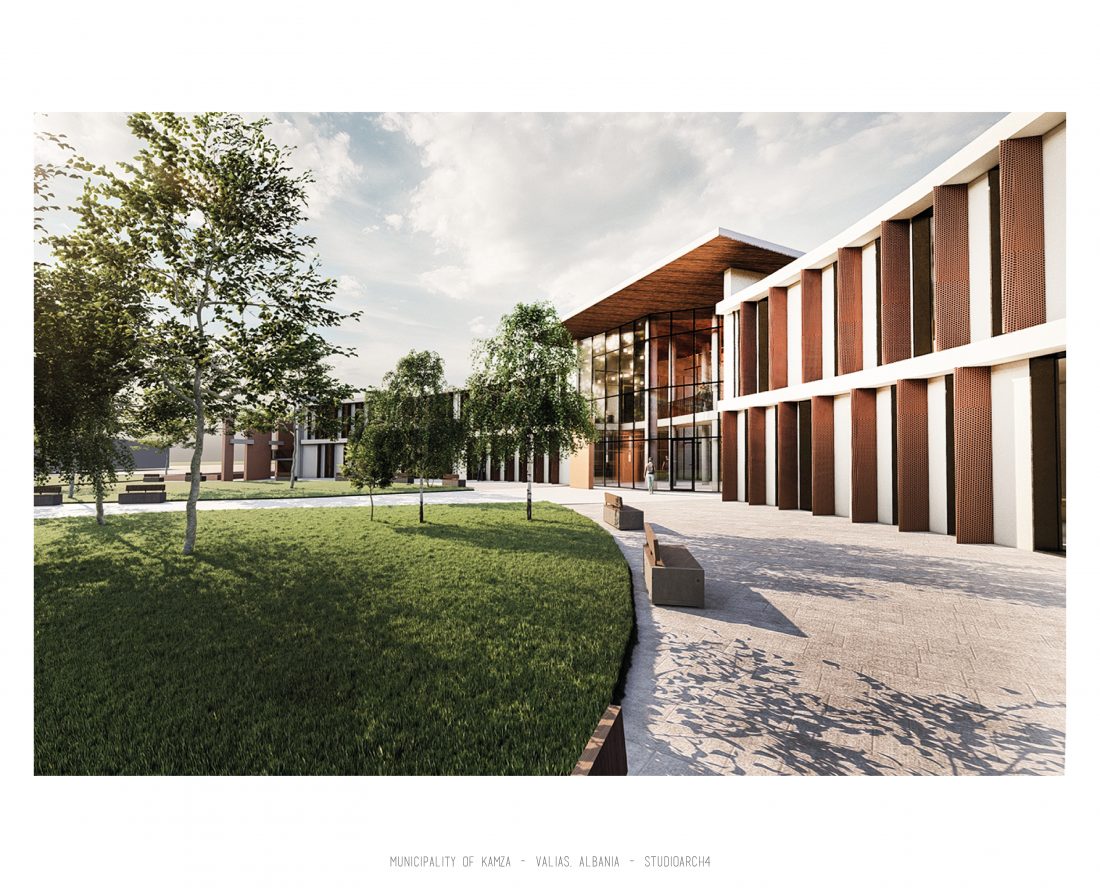 Kamëz Municipality will be the newest important institution that will move from its current location to the center of Valias. The object has a semi-arched longitudinal shape, which stretches along the pavement. The main focus of the design is closely related to meeting the needs of the institution itself, reaching the optimization of all necessary facilities. In addition to them, the creation of common and open spaces for the public are a key element that has influenced the access to the main spaces and facades of the building. The main entrances are located in a central volume higher than the rest of the building. In this volume, transparency prevails both on the front facade and on the one facing the park. The main lobby has a double height, fragmenting the building into 2 halves, which are connected between them via a bridge along the main atrium. Another characteristic of the building is the breaks in the facade that create pockets, in which the presence of external spaces is extended. These pockets are designed both for the placement of greenery and to highlight the main and secondary entrances of the facility.