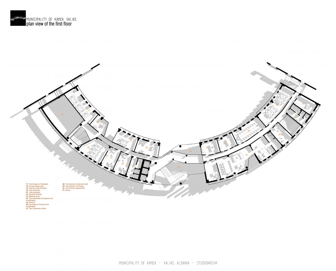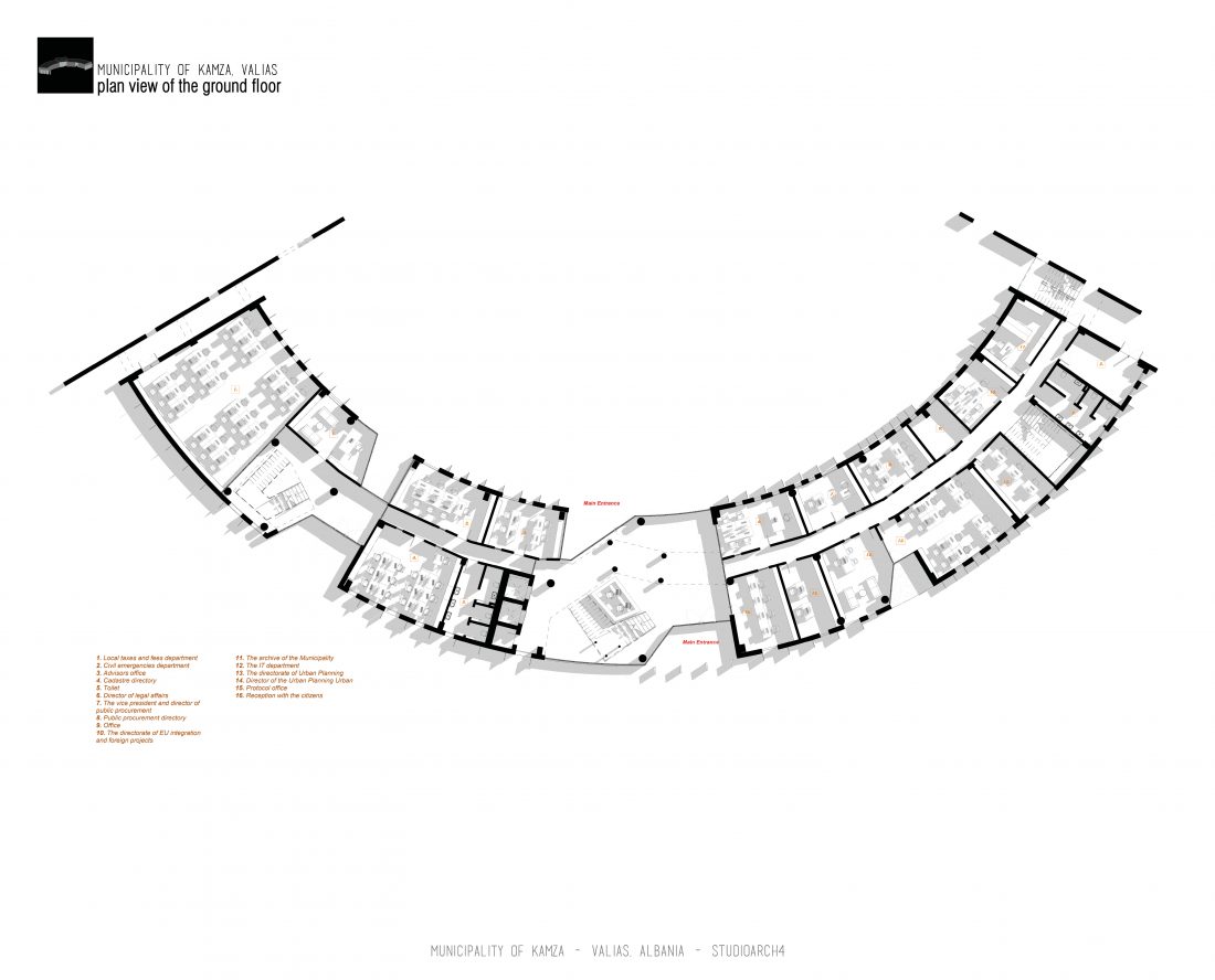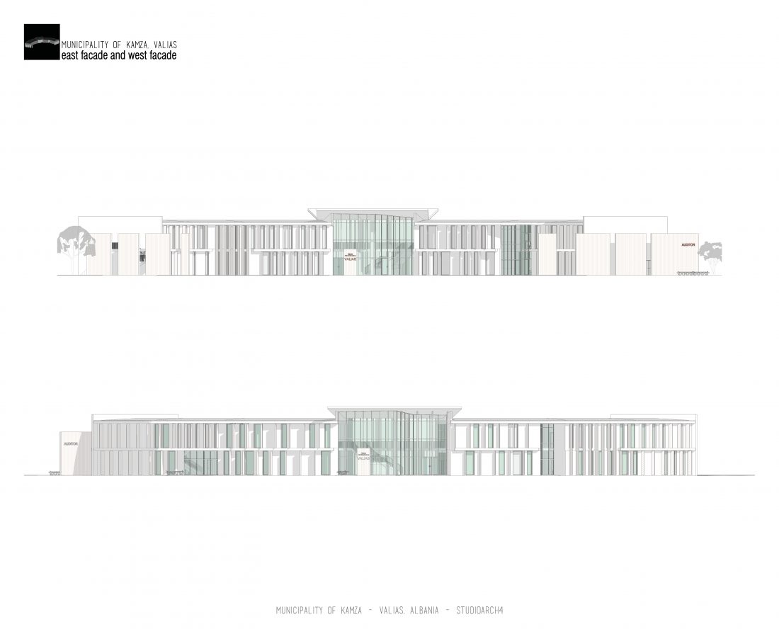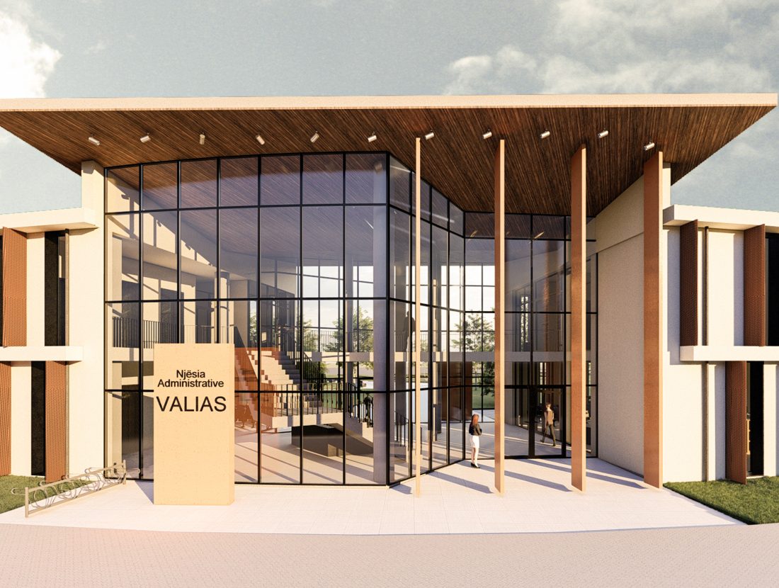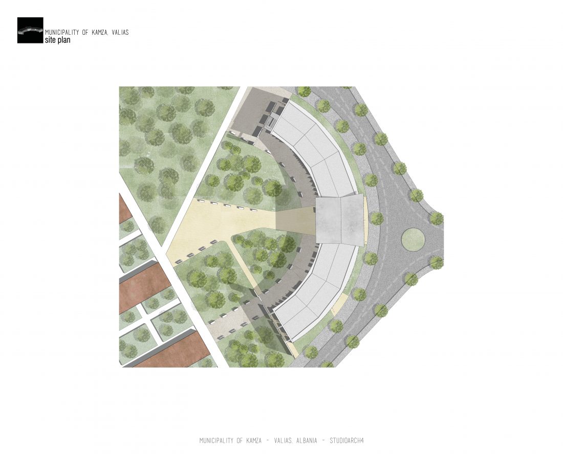 Kamëz Municipality will be the newest important institution that will move from its current location to the center of Valias. The object has a semi-arched longitudinal shape, which stretches along the pavement. The main focus of the design is closely related to meeting the needs of the institution itself, reaching the optimization of all necessary facilities. In addition to them, the creation of common and open spaces for the public are a key element that has influenced the access to the main spaces and facades of the building. The main entrances are located in a central volume higher than the rest of the building. In this volume, transparency prevails both on the front facade and on the one facing the park. The main lobby has a double height, fragmenting the building into 2 halves, which are connected between them via a bridge along the main atrium. Another characteristic of the building is the breaks in the facade that create pockets, in which the presence of external spaces is extended. These pockets are designed both for the placement of greenery and to highlight the main and secondary entrances of the facility.