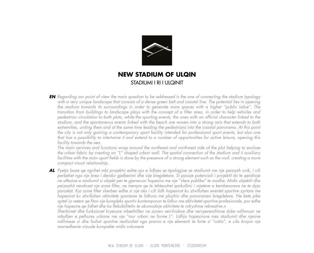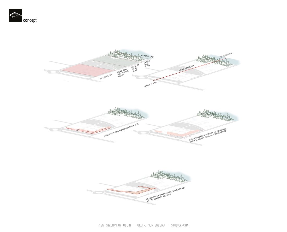 Pyetja baze qe ngrihet mbi projektin eshte ajo e lidhjes se tipologjise se stadiumit me nje peizazh unik, i cili perbehet nga nje brez i dendur gjelberimi dhe vije bregdetare. Si pasoje potenciali i projektit do te qendroje ne aftesine e stadiumit si objekt per te gjeneruar hapesira me nje “vlere publike” te madhe. Midis objektit dhe peizazhit vendoset nje zone filter, ne menyre qe te lehtesohet qarkullimi i mjeteve e kembesoreve ne te dyja parcelat. Kjo zone filter sherben edhe si nje aks i cili lidh hapesirat ku zhvillohen eventet sportive zyrtare me hapesirat ku zhvillohen aktivitete spontane te lidhura me plazhin dhe panoramen bregdetare. Ne kete pike qyteti jo vetem qe fiton nje kompleks sportiv kontemporan te lidhur me aktivitetet sportive profesionale, por edhe nje hapesire qe lidhet dhe ka fleksibilitetin te akomodoje aktivitete te ndryshme rekreative.n