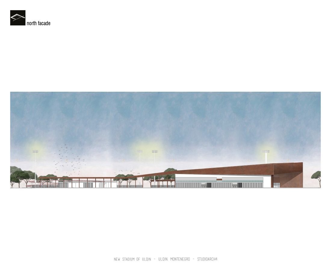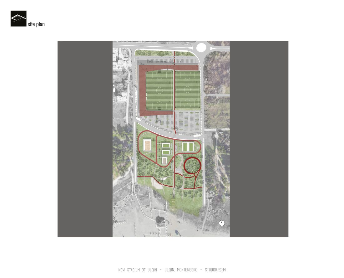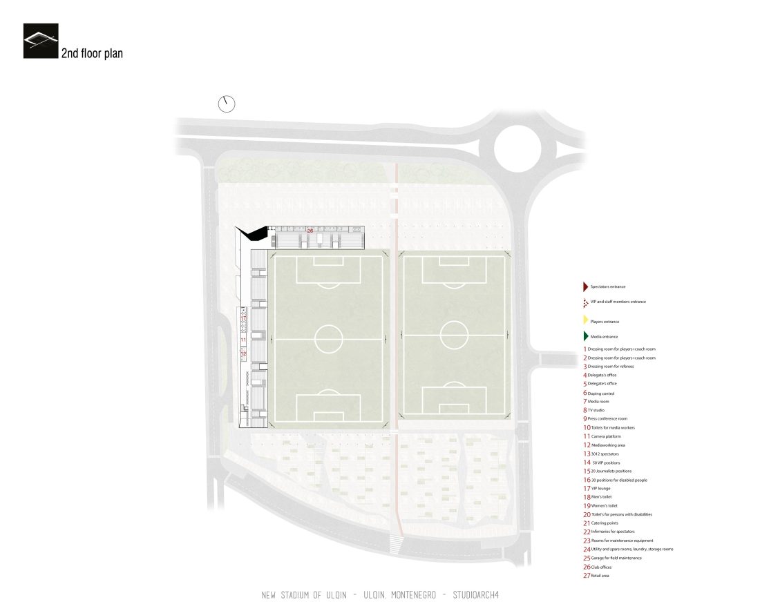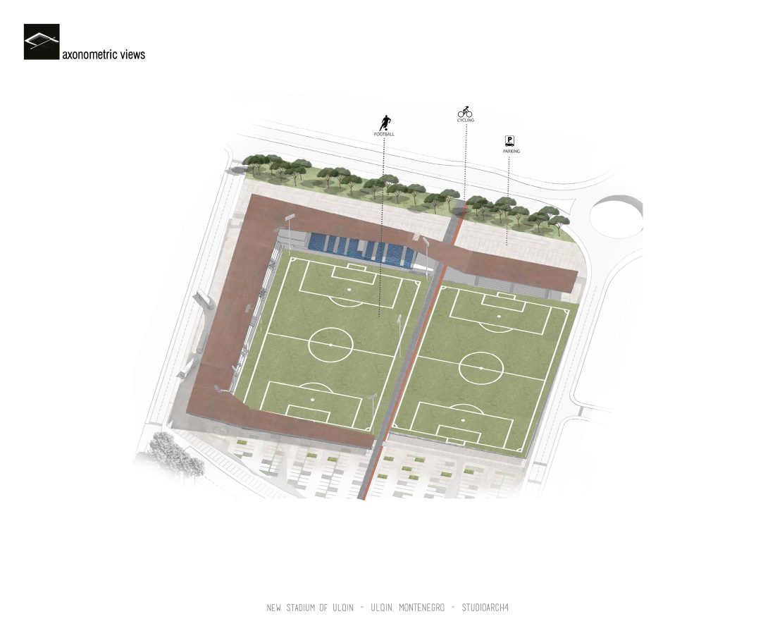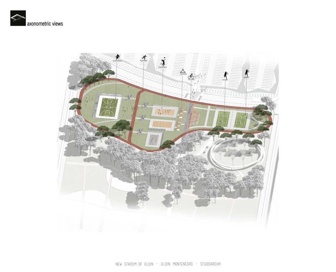 Sherbimet dhe funksionet kryesore mbeshtillen ne zonen veri-lindore dhe veri-perendimoe duke ndihmuar ne mbylljen e pelhures urbane me nje “mur urban ne forme L”. Lidhja hapesinore mes stadiumit dhe njesive ndihmese si dhe fushat sportive realizohet nga prania e nje elementi te forte si “catia”, e cila krojon nje marredhenie vizuale kompakte midis volumeve.