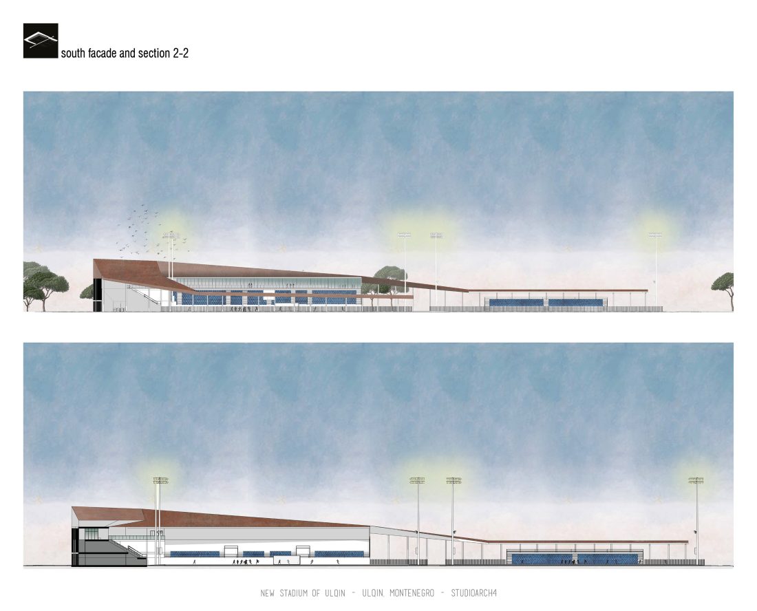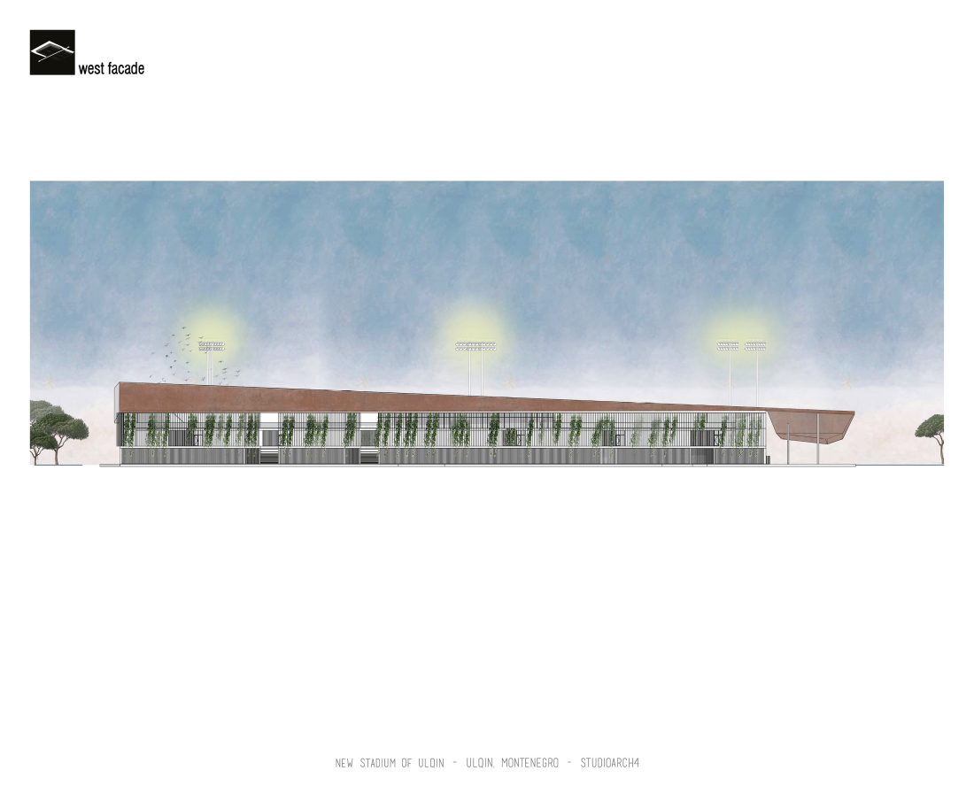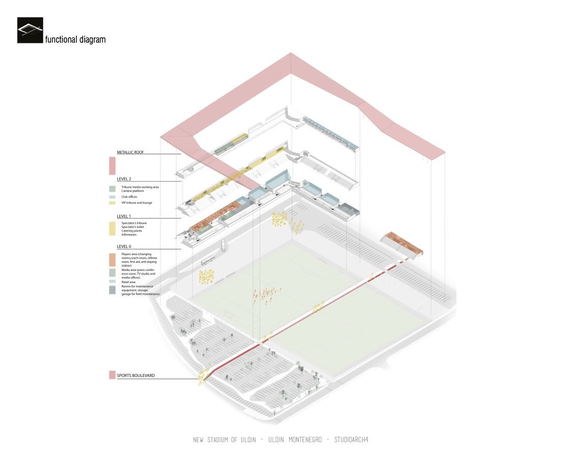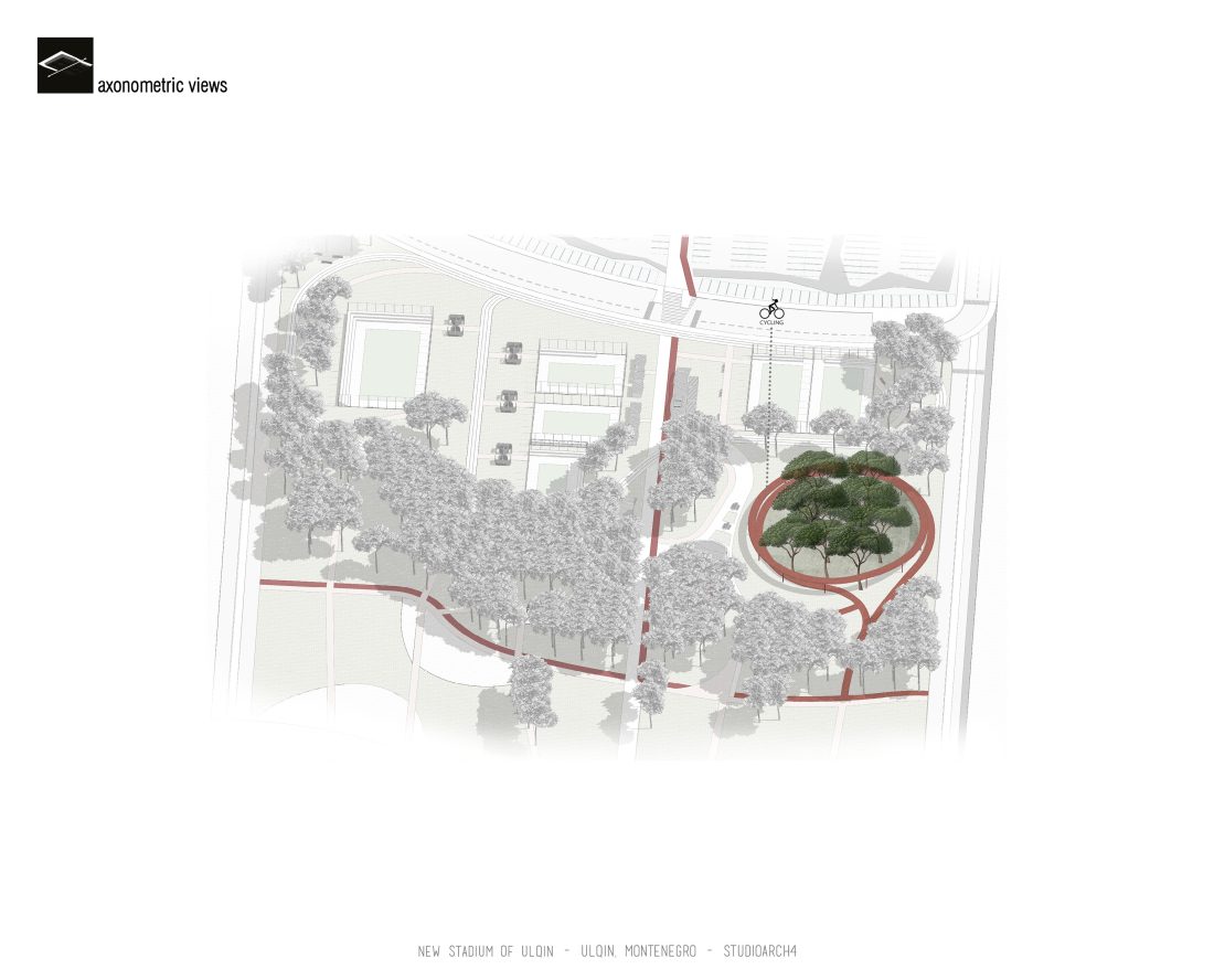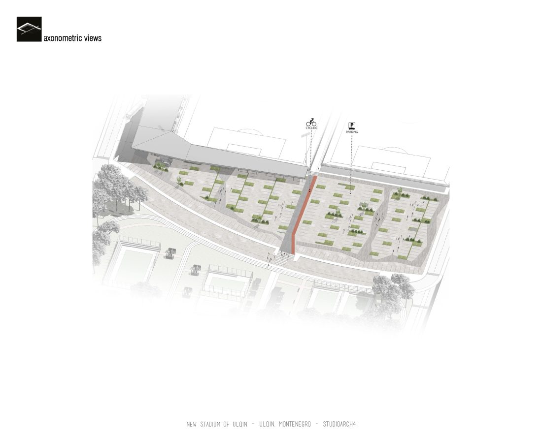 Sherbimet dhe funksionet kryesore mbeshtillen ne zonen veri-lindore dhe veri-perendimoe duke ndihmuar ne mbylljen e pelhures urbane me nje “mur urban ne forme L”. Lidhja hapesinore mes stadiumit dhe njesive ndihmese si dhe fushat sportive realizohet nga prania e nje elementi te forte si “catia”, e cila krojon nje marredhenie vizuale kompakte midis volumeve.