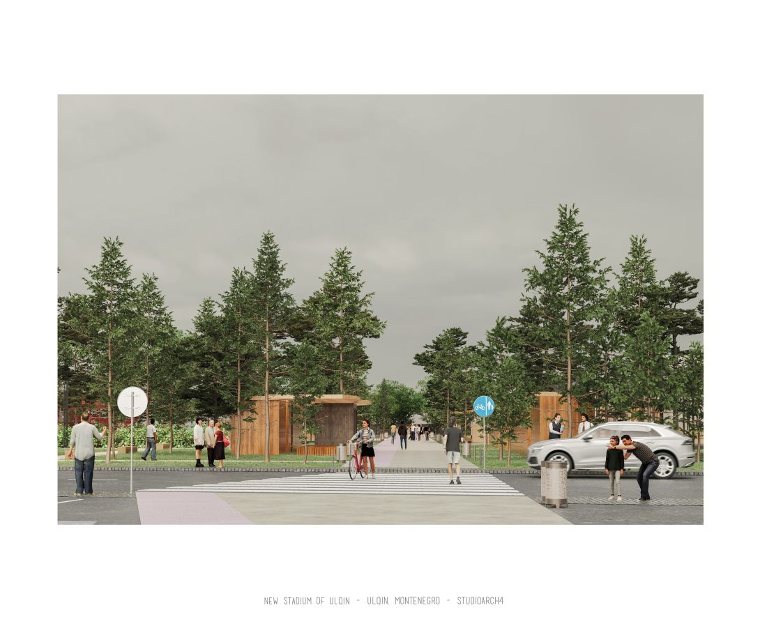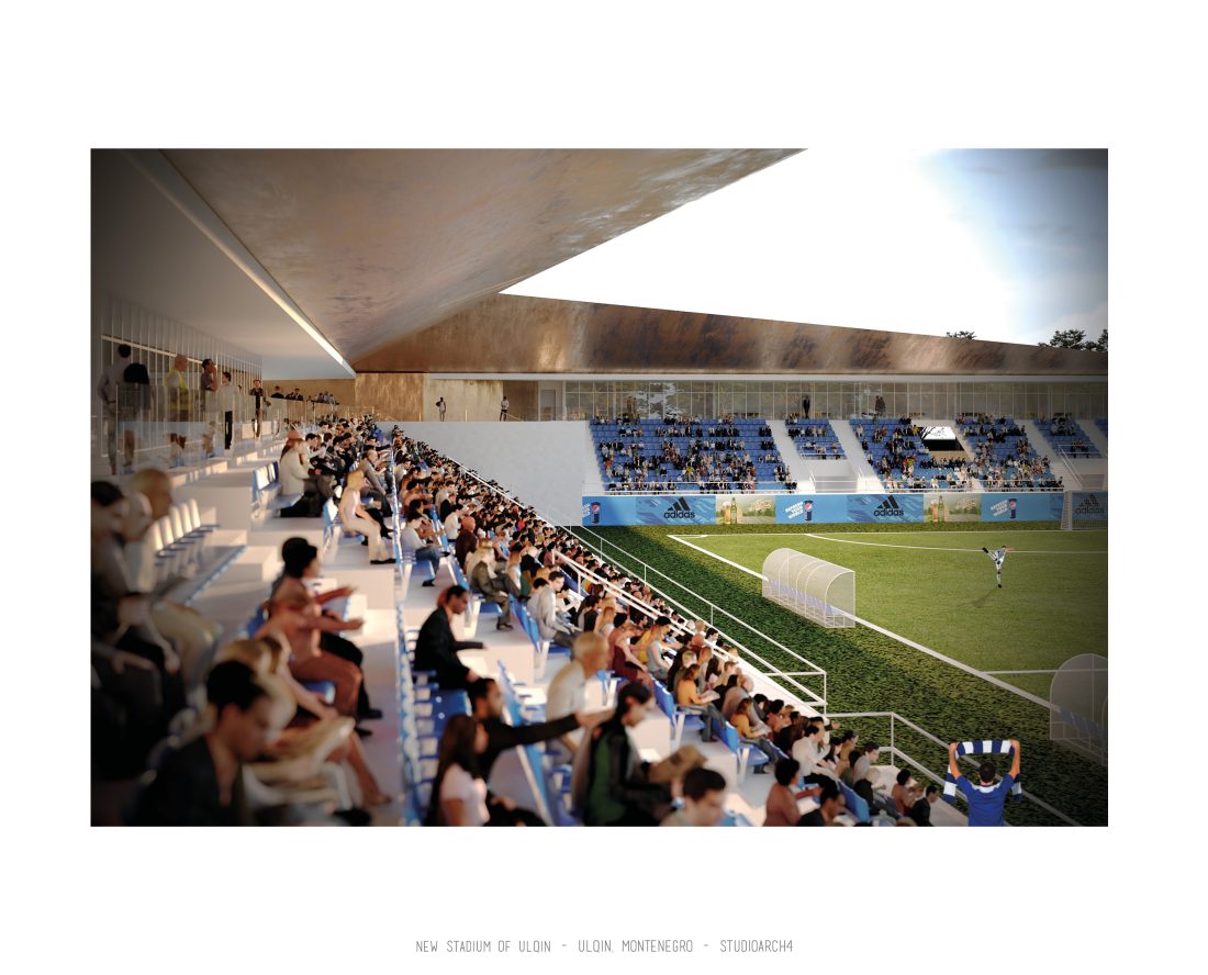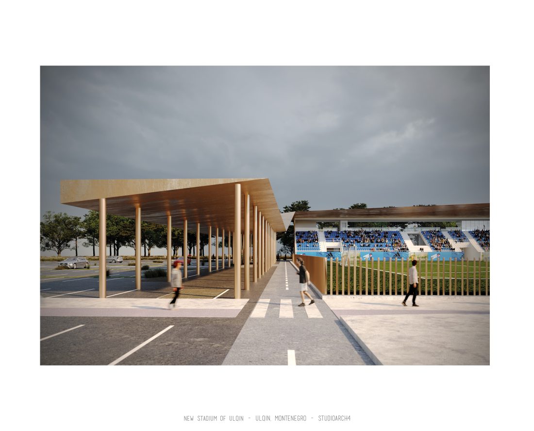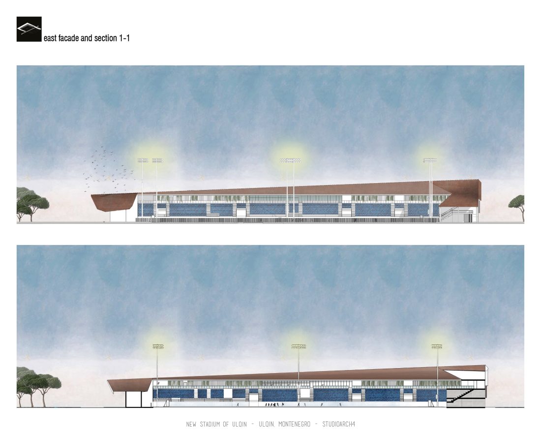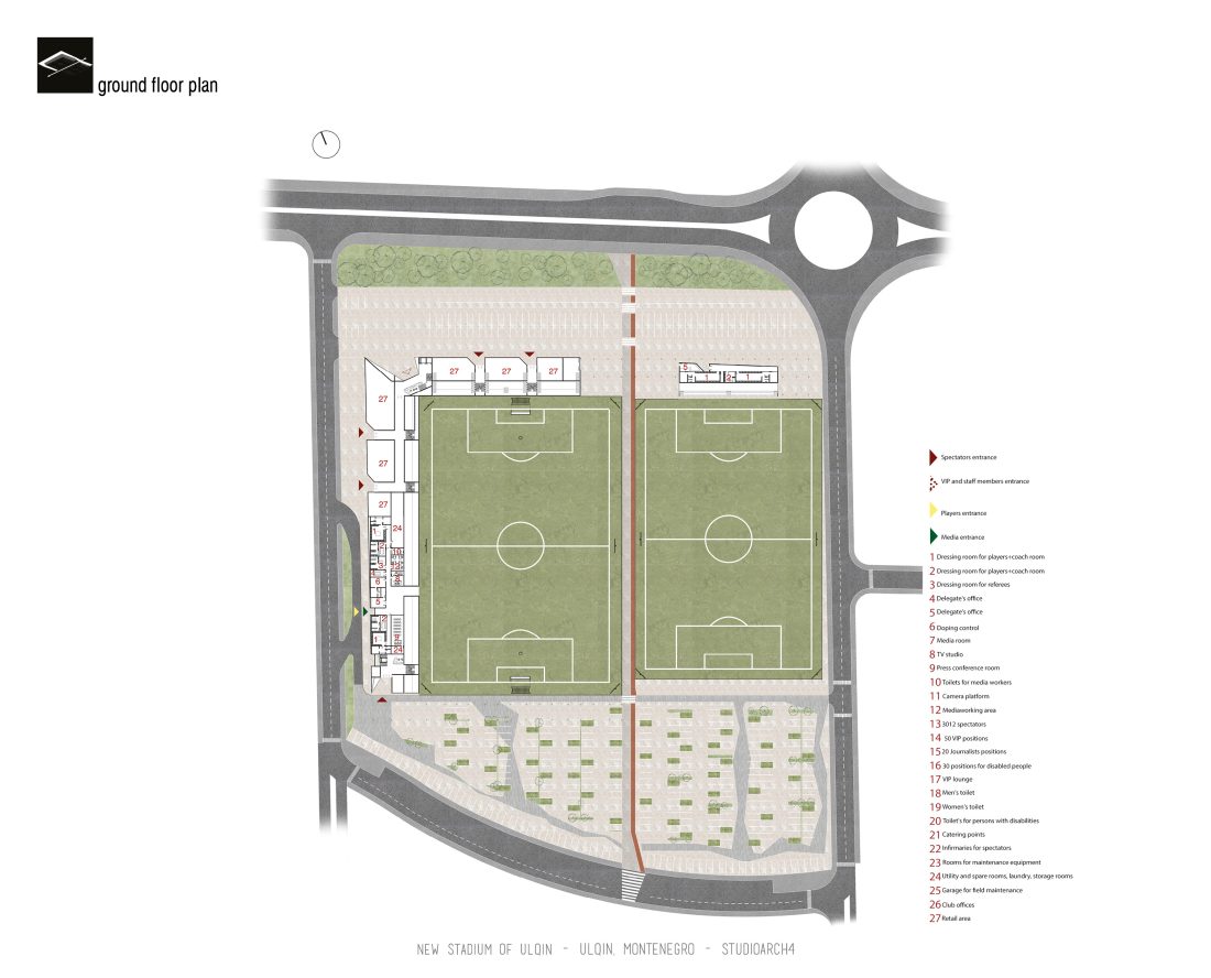 Sherbimet dhe funksionet kryesore mbeshtillen ne zonen veri-lindore dhe veri-perendimoe duke ndihmuar ne mbylljen e pelhures urbane me nje “mur urban ne forme L”. Lidhja hapesinore mes stadiumit dhe njesive ndihmese si dhe fushat sportive realizohet nga prania e nje elementi te forte si “catia”, e cila krojon nje marredhenie vizuale kompakte midis volumeve.
