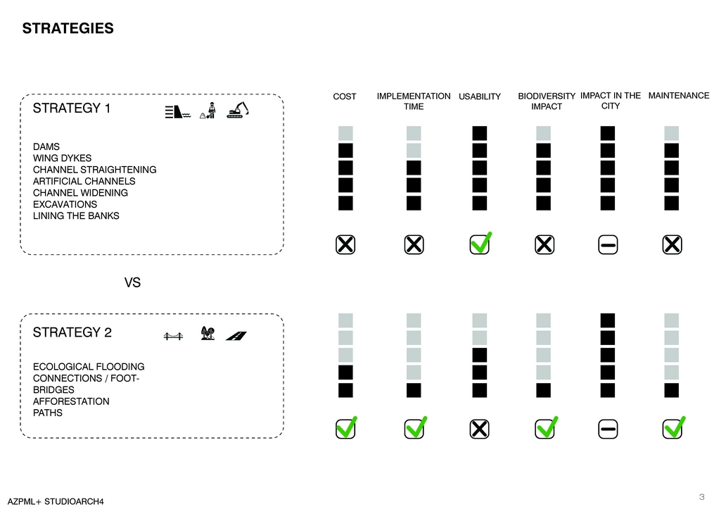 This strategy is mainly based on accepting the actual situation and the fact that flooding is an inevitable issue, in no massive intervention scenarios. On the other hand the impact of these sorts of interventions will not affect the biodiversity of the river. When talking about physical impact, this strategy consists on the creation of simple bridge-like passages and small afforestation interventions. The costs required are very low and they are related with a short-term scenario implementation. With this sort of intervention as long as it is accepted the fact that the island can be flooded during a certain period of time, the usability will be less than 100% of the whole surface of the island, but still the utilization of the paths and bridges will be consistent. On the other hand we have again a very strong impact in the city, as long as the shape of intervention leaves a mark on the city pattern. One extra advantage of this strategy is that it requires les maintenance and preserves nature into its wild state.