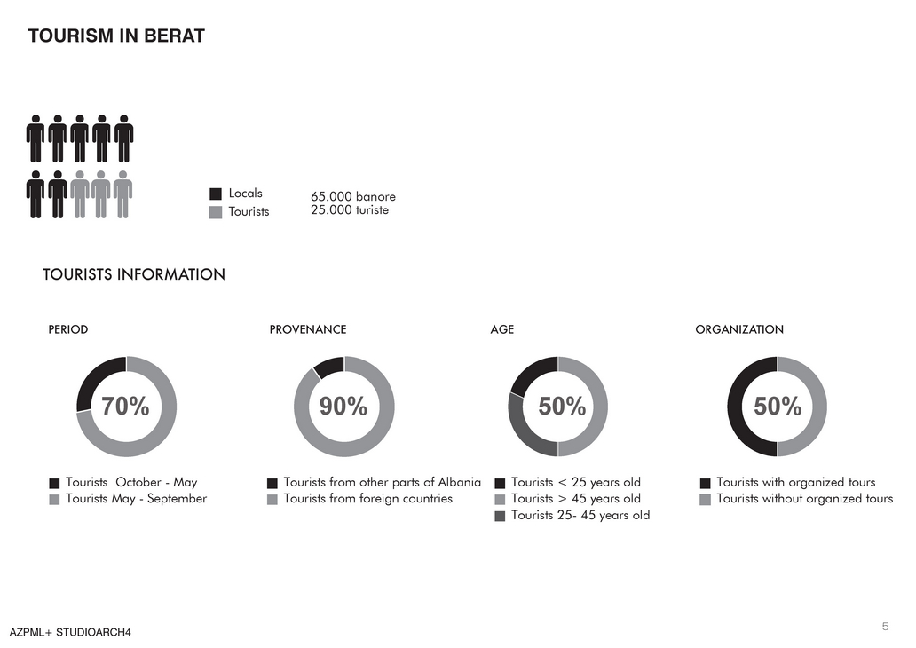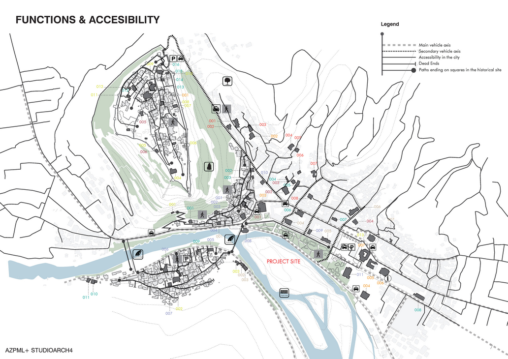 Through a general overview of Berat’s typography and morphology the placement of the island is quite remarkable. Though its existence is not much livable due to its accessibility problems. If we observe further the changing topography of the river the composition of several small islands and the growth of green vegetation we mark that the creation of the island was as a cause of the funnel shape of the river bed when reaching the city center. In the diagram where we analyze the location of the functions around the city as well as the accessibility network we mark that the concentration of the tourists attractions, and the UNESCO World Heritage sites, are located to the northwest of our site. Some other attractions are located to the northern part of the site and are related with the area only visually and have as a divider the wall barrier that lays along the river. If we analyze the accessibility network we read different types of paths and pedestrian networks. Some of the most remarkable are the historical paths inside the old neighborhoods. Such a way we consider very important to emphasize the pedestrian pattern by giving a slight contribution to the city.