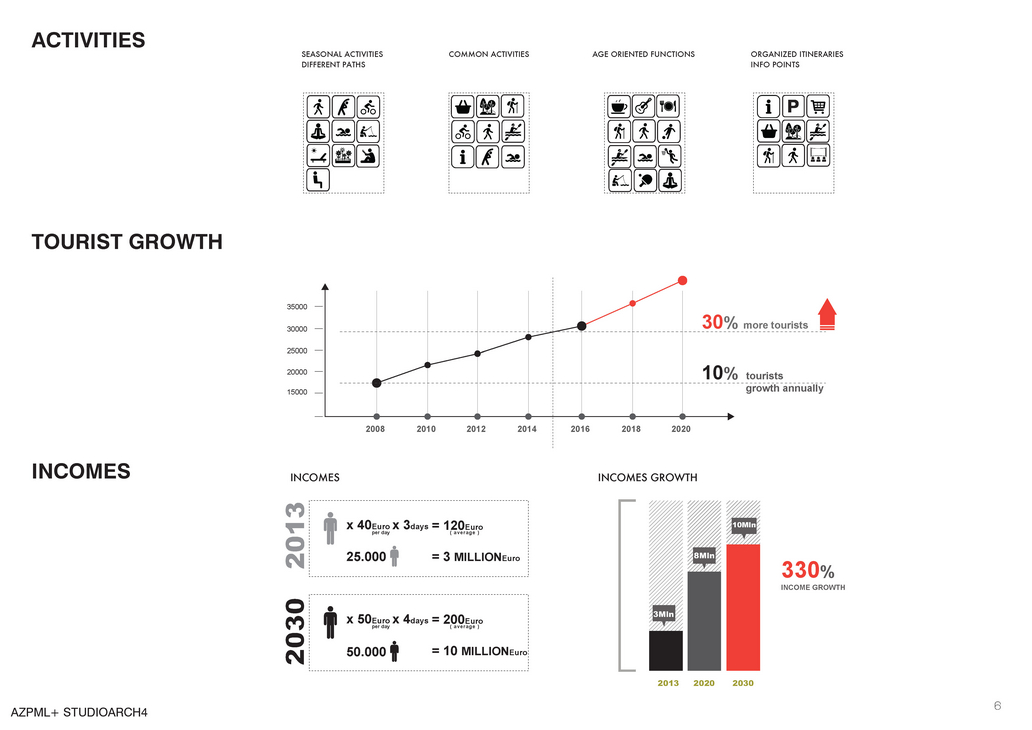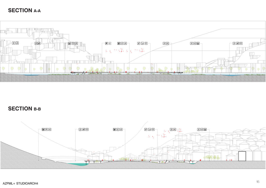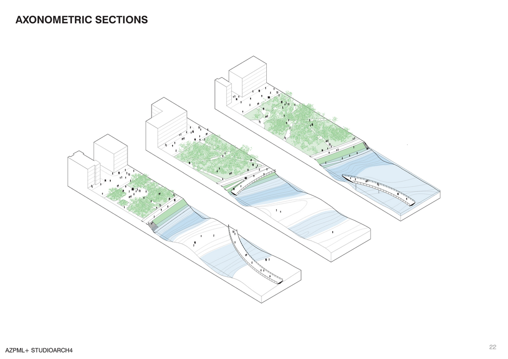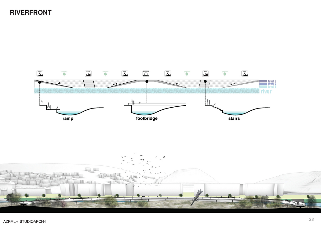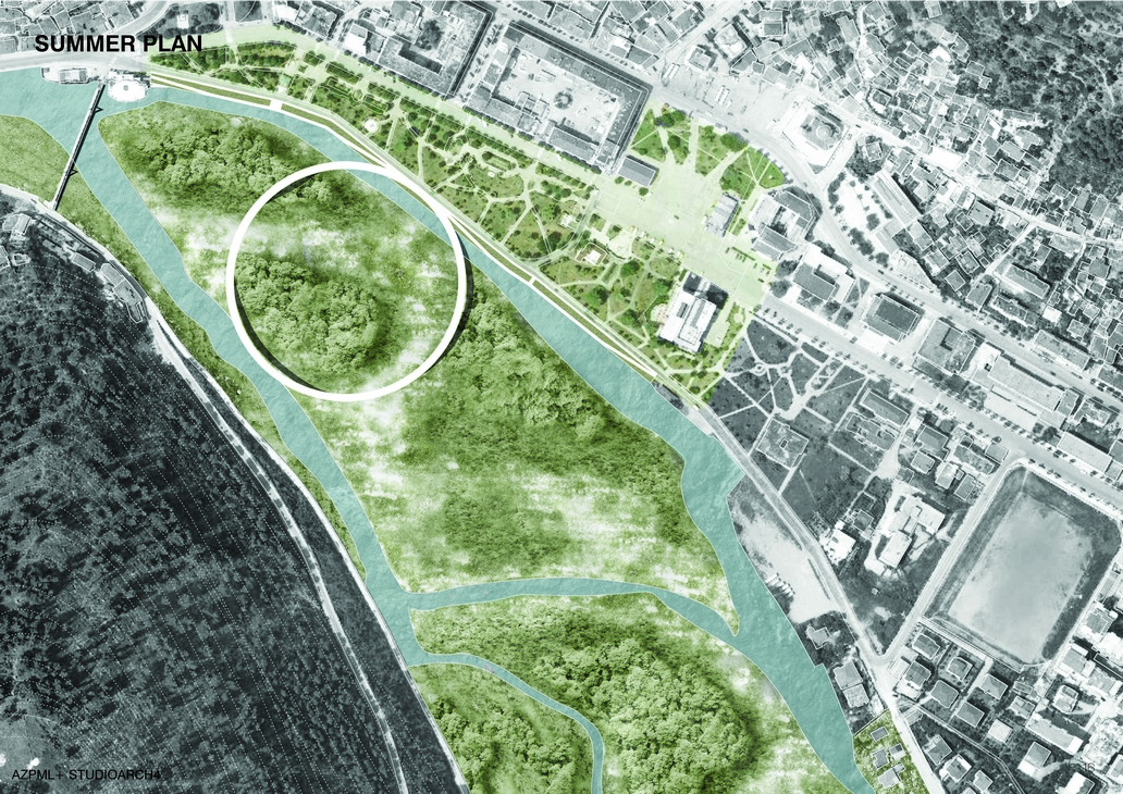 The island can host from concerts and huge events to simple daily life activities such as fishing or jogging. As a tourist attractor besides offering it’s own events such as a stop point for rafting, green activities or festivals, the island with our intervention offers an interesting observation pedestrian path from which one can enjoy the view of the all the three to historical together. Our proposal is in such terms a slight touch to the existing natural island, emphasizes the qualities of the land and contributes to it by offering a new experience of enjoying wild nature, landscape and new public events.