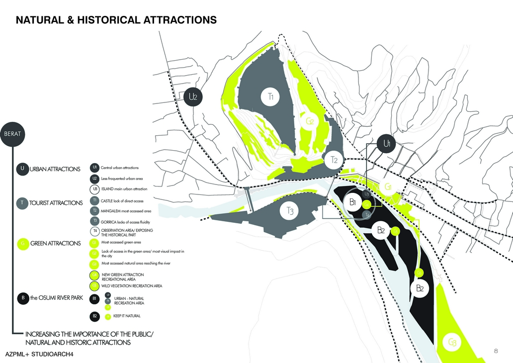 As an attractor the island holds interesting potentials. In a general analysis of the urban, touristic and green attractions the island will hereby be integrated as an important hub of recreation. In these terms the island will in such way dress different types of attractions and be a contributor to each of them. The urban attractions as the central ones and secondary ones, spread around the city and correlated to each other throughout the thin line of accessibility between Gorica and Mangalemi neighborhoods. UNESCO’s World Heritage sites are the main tourist attractors of Berat and do give a very strong identity to the whole city. But in a more detailed analysis the Castle stays more separated from the other two sites. The most accessed area is Mangalemi neighborhood; still Gorica is a bit bypassed. On the other hand the green gives a very potent impact in the city and dresses up a second identity to it.