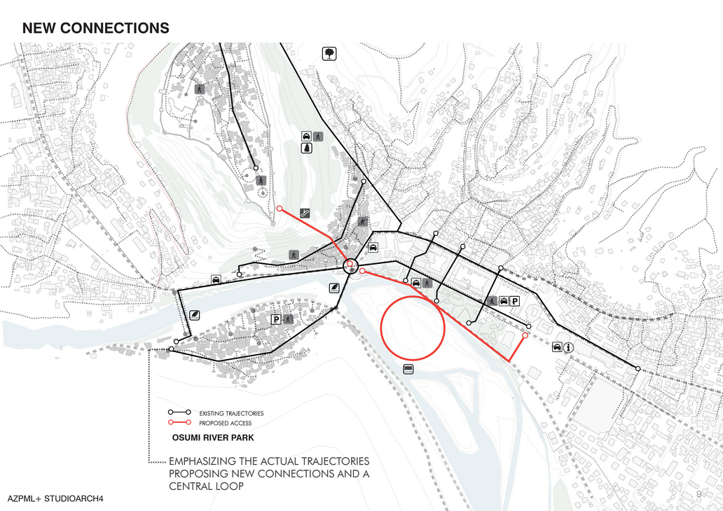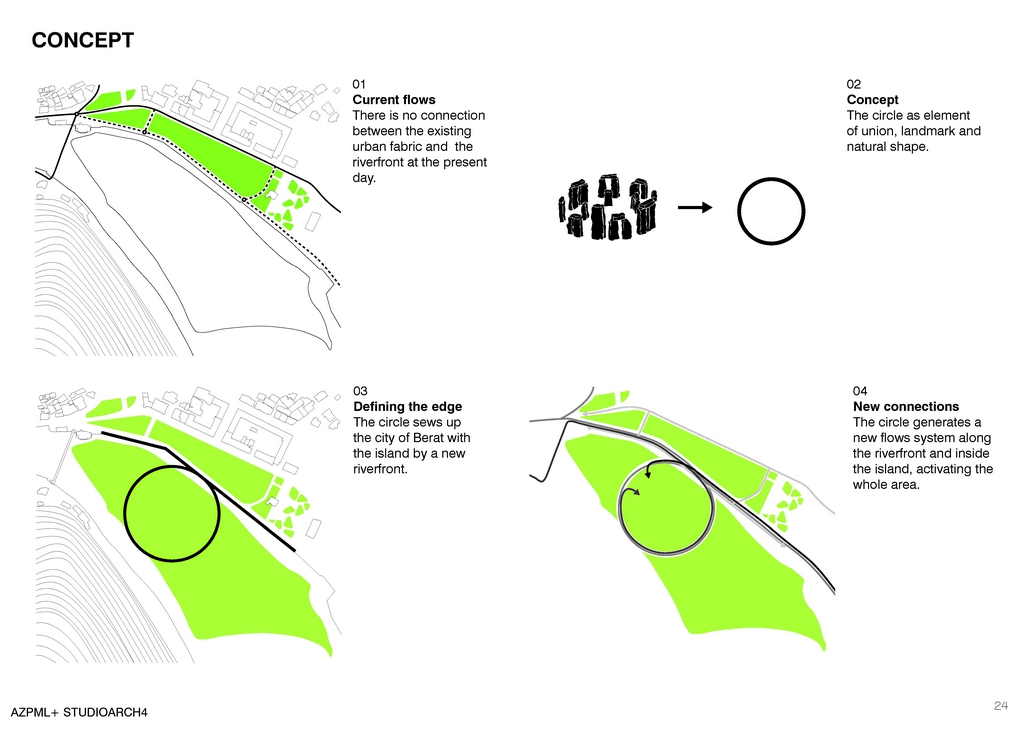 The circle is a symbol of union, landmark and natural shape throughout the ancient history and civilizations. We find the circle in ancient human settlements that mark a very important spiritual and physical relation with the nature. Such example is the very impressive Stonehenge. The circle in itself has always fascinated humans with its perfect shape. Still the circle is a metaphor for the cycle of life, for all the new beginnings for its absolute perfection and for the elegance of the shape. Current flows show that there is no connection between the existing urban fabric and the riverfront at the present day. We redefine the edge by introducing the circle that sews up city of Berat with the island by a new riverfront. The circle generates a new flow system along the riverfront and inside the island, activating the whole area.