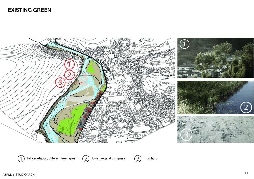 Berat lays parallel to the river Osum, mimicking the geographical morphology of the hills, which define the boundaries of the city. Taking into consideration two neighborhoods, Mangalem- where the castle is found and Goricë- these are the narrowest parts of the city, where can be found the bridge that connects these two parts. Hence, all the activities of the city are concentrated parallel to the Osum River. The Berat Island represents a possibility to expand the city while preserving its shape. The island can perform as a central part of the city while serving as a site for tourist and at the same time as a site for urban ecology and even urban wildlife.