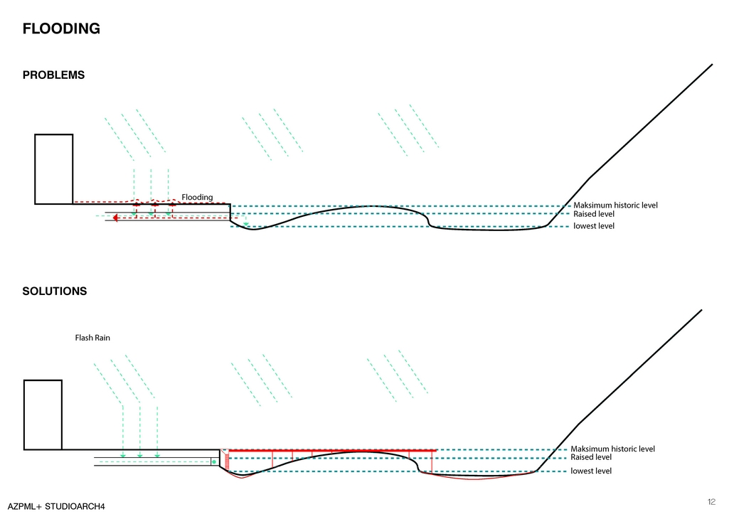 Because of the rise of the river water the pipe system is flooded and such as way the city in itself is flooded. To prevent such dark scenario the intervention needed is the proposal of new sewage and rain water system. Throughout this strategy the water is channeled into a system that goes along the river and deposits the waters outside of the city.