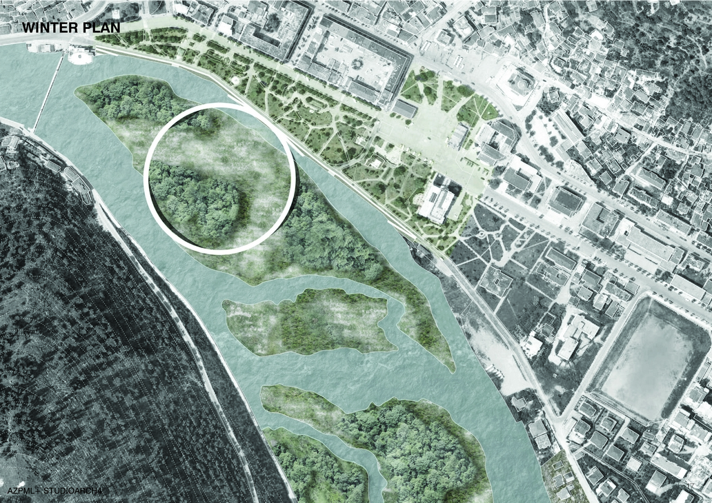 The new urban park is located in the central heart of the city, along the river. On the other hand the river holds a very impressive potential but lacks accessibility. On the other hand the lower eastern part of the river is very much accessible but located further away from the other attractions. We do have the mountain toping with the castle, which represents a very strong visual impression. The island in itself is a very natural created composition and changes it’s shape and vegetation during different periods of the year. In relation to these three different attractors we start to dress to the island portions of them, such a way to make it a very strong mark for the city itself. Our touch is very slight and in terms as an urban attractor would be a new hub of events lived into the wild.