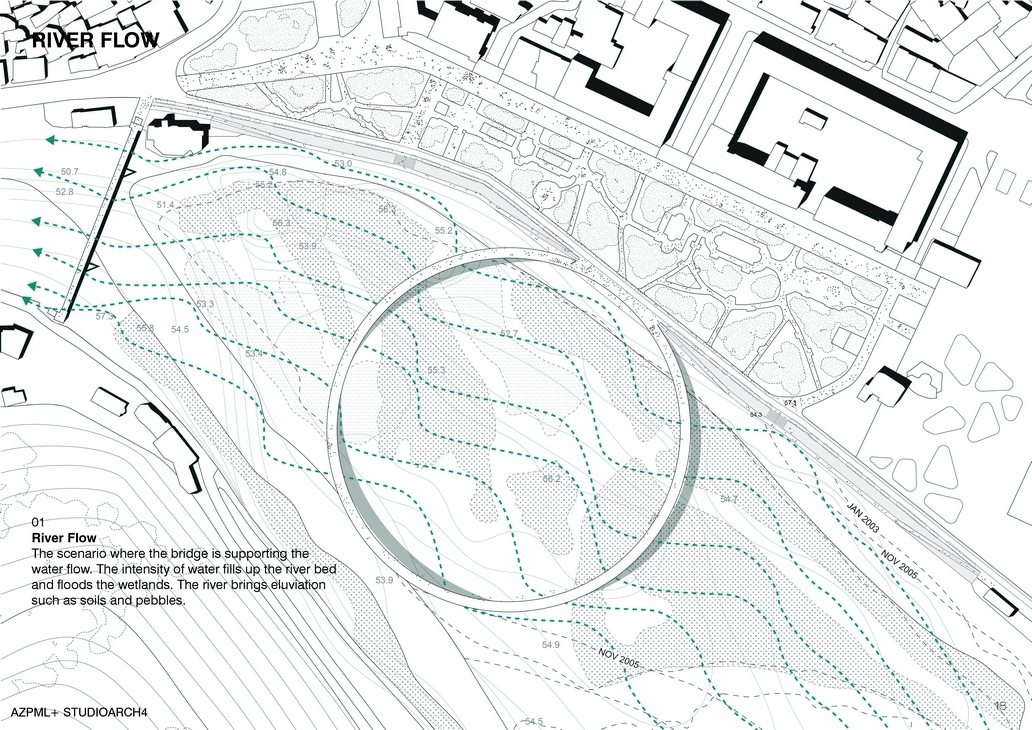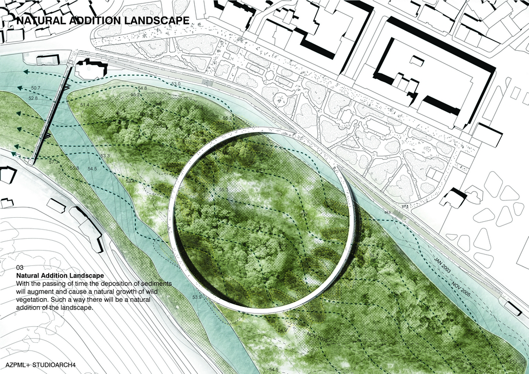 The existing green of the island is very wild and has a casual growth. It includes different types of vegetation where on the highest points trees characterize the landscape. On its slope the lower vegetation, such as types of grasses and bushes rein the whole surface. On the other hand mud land and groups of rocks cover the land closer to the riverbed. In our approach we keep the nature as it is, in a wild state, and introduce only the path that slightly touches the ground. Our footbridge has three openings, one main connection with the riverfront and two other connections with the island on its highest points. By making this slight intervention and preserving the actual state we do as well accept the fact that future floods can happen. On those scenarios what will be left above the water is only the ring footbridge. In this case with the addition of the bridge the eluviation will deposit soils and rocks to the bridge pylons. The depositions after a certain period of time will become potential space for new green growth. In this way the landscape will be on a continuous state of change.
