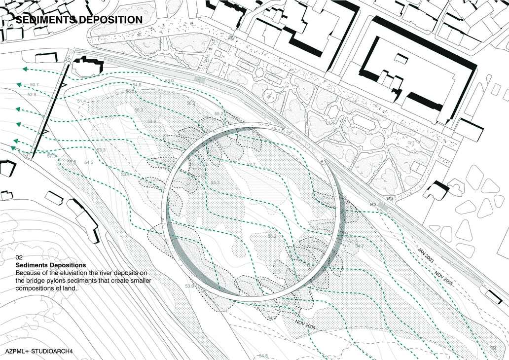 We can divide the deposition of sediments in three phases. Everything starts while in winter and the river has a stronger stream and higher quantity of water. The high intensity of water fills up the riverbed and floods the wetlands. The River brings with itself huge eluviation such as soil and pebbles. The second moment of the scenario is when sediments deposit on the bridge pylons. The depositions create such a way smaller compositions of land. While the time passes the sediments will augment and cause a natural growth of wild vegetation. Such a way there will be a natural addition of the landscape. This proposal protects and emphasized more the biodiversity of the land and contributes to the creation of a complex pattern.