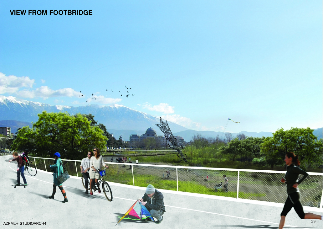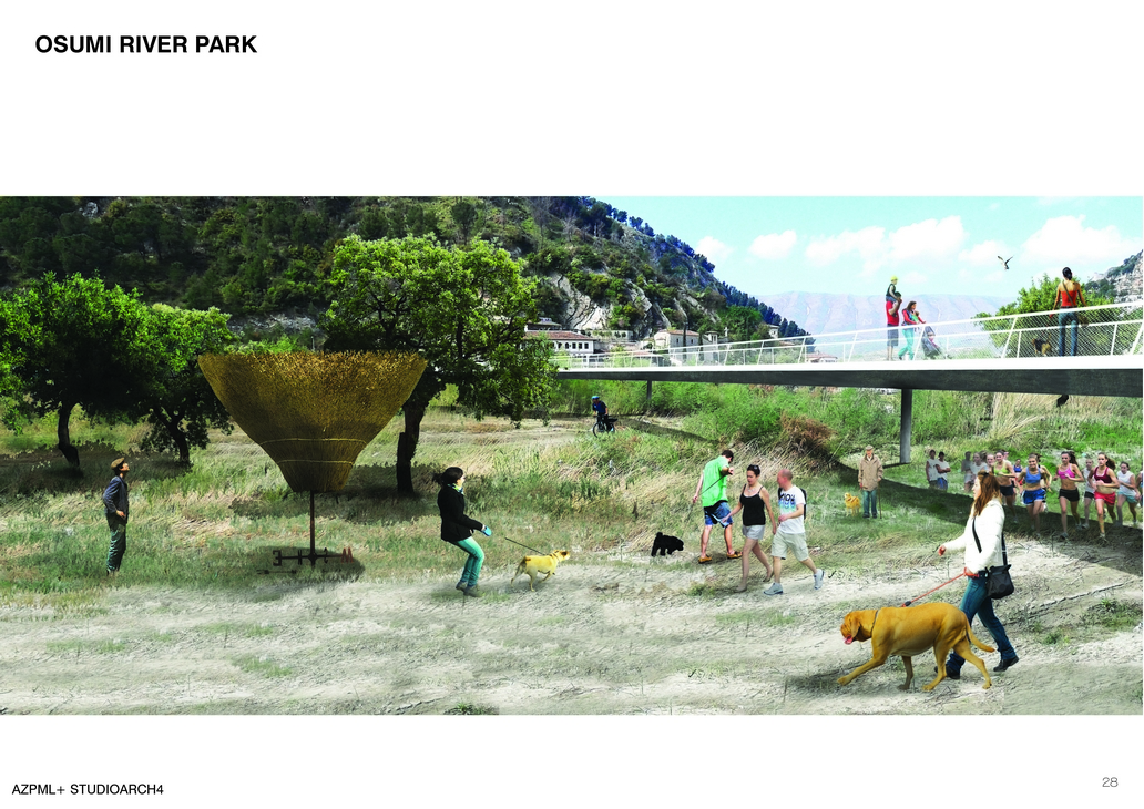 With this strategie of intervention and protection of the existing flora and fauna we propose the creation of the new Osumi River Park. The River Park is now fully exposed and the ring footbridge is integrated with the landscape. The ring looks like it has always been part of the landscape and gives the opportunity to access the natural landscape. The fluid movement of a revealing promenade from which one can enjoy the view of the historical city of Berat and its natural beauties surrounds the wild park. The space located within has now the pottential to host from huge events to simple daily life experiences. We have such a way created a new landmark that empasizes the attractions of the city and becomes an attraction in itself.