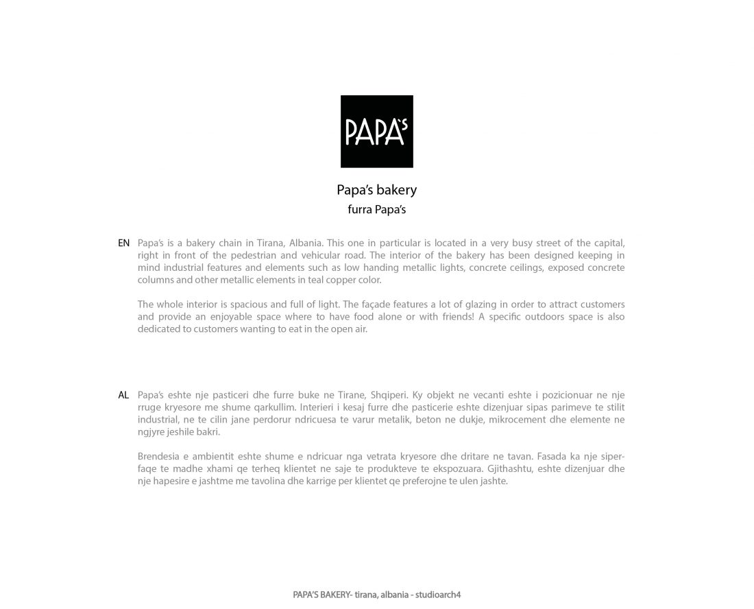 Papa’s eshte nje pasticeri dhe furre buke ne Tirane, Shqiperi. Ky objekt ne vecanti eshte i pozicionuar ne nje rruge kryesore me shume qarkullim. Interieri i kesaj furre dhe pasticerie eshte dizenjuar sipas parimeve te stilit industrial, ne te cilin jane perdorur ndricuesa te varur metalik, beton ne dukje, mikrocement dhe elemente ne ngjyre jeshile bakri.