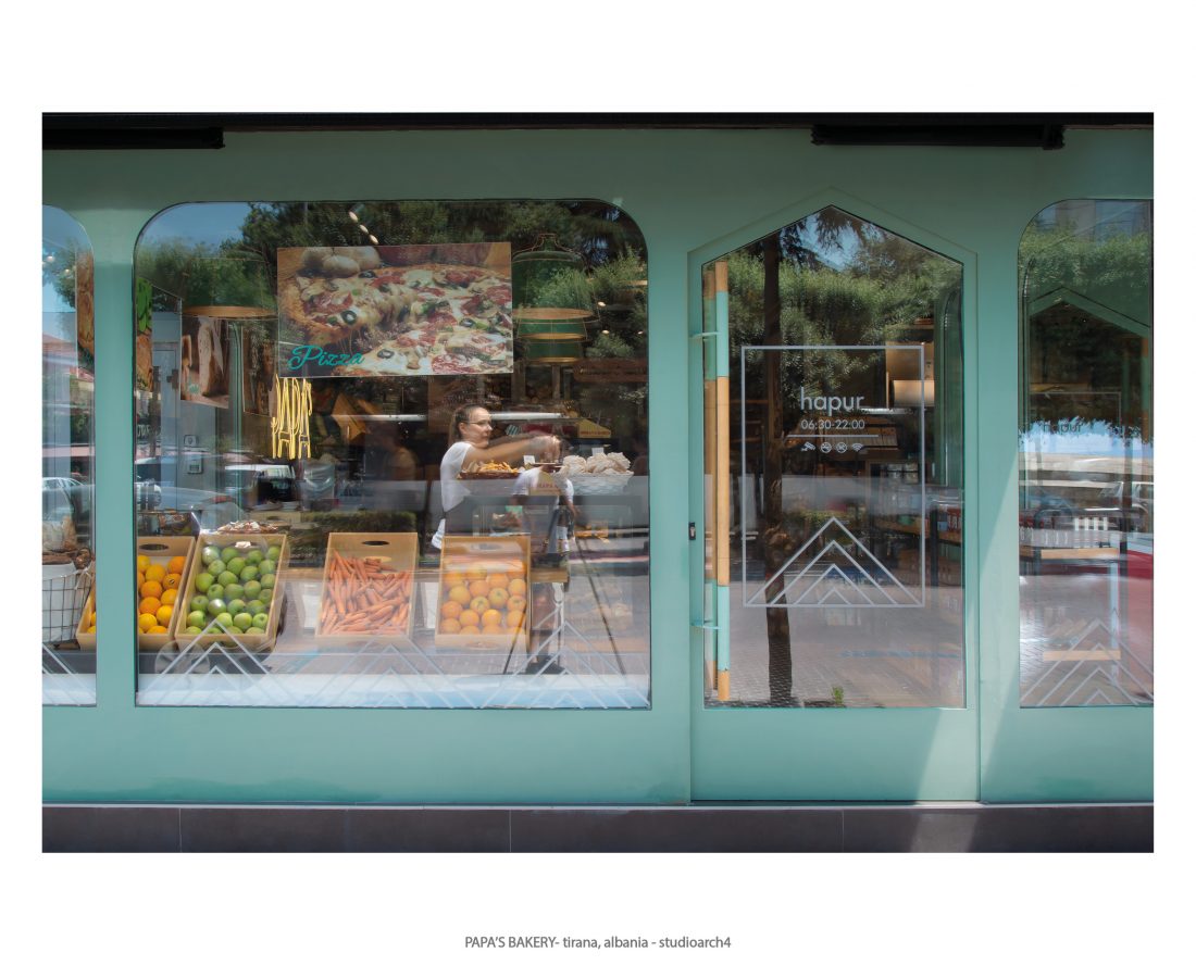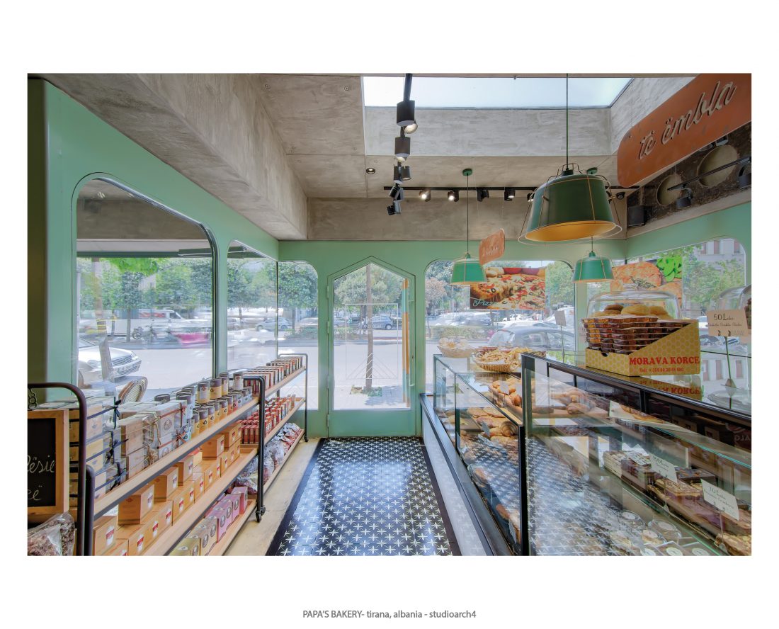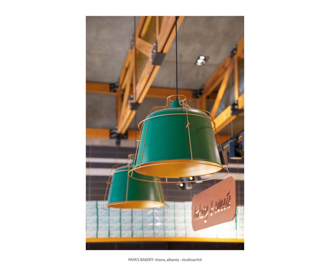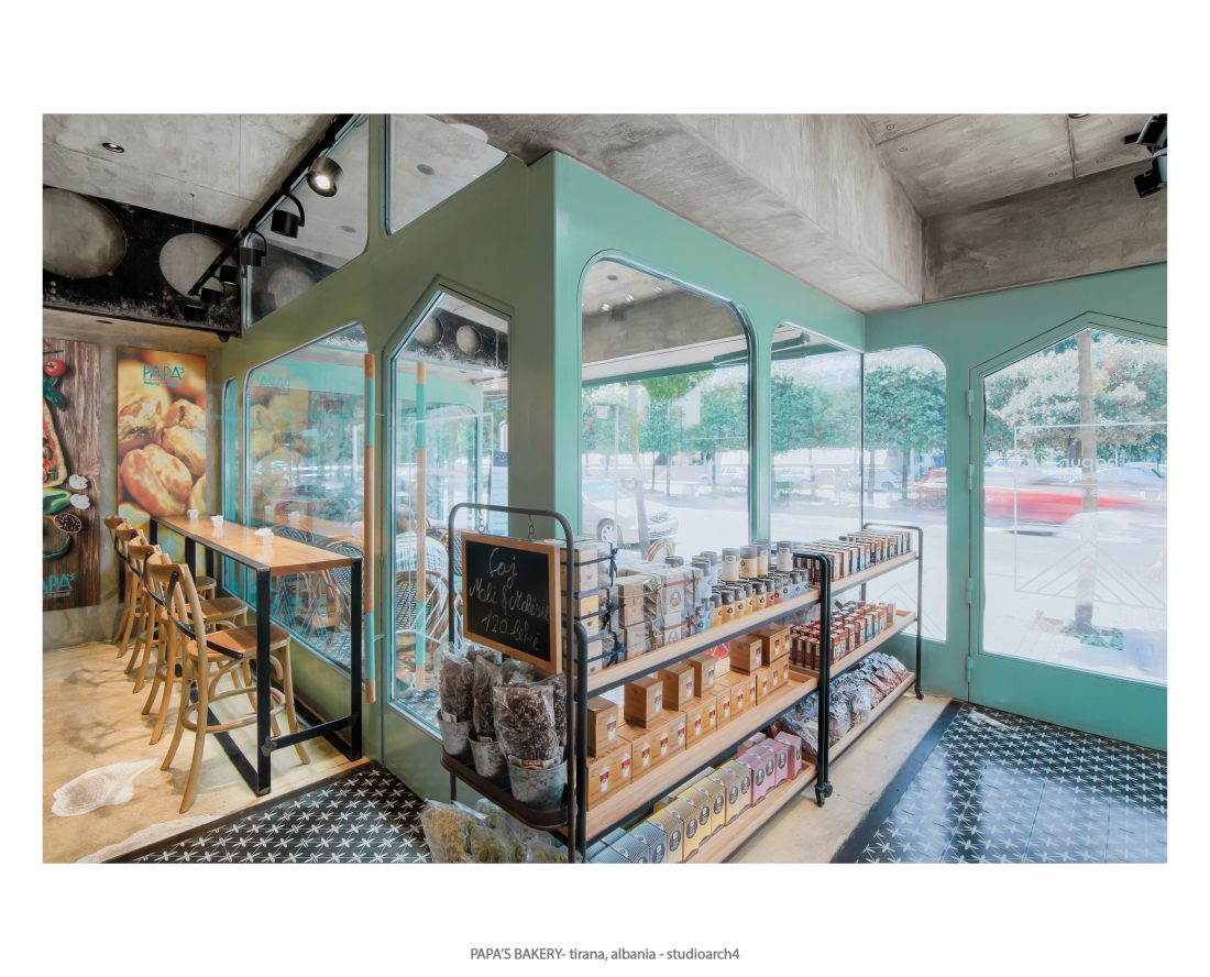 Papa’s is a bakery chain in Tirana, Albania. This one in particular is located in a very busy street of the capital, right in front of the pedestrian and vehicular road. The interior of the bakery has been designed keeping in mind industrial features and elements such as low handing metallic lights, concrete ceilings, exposed concrete columns and other metallic elements in teal copper color.