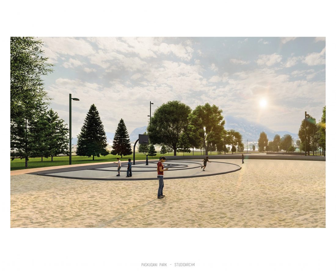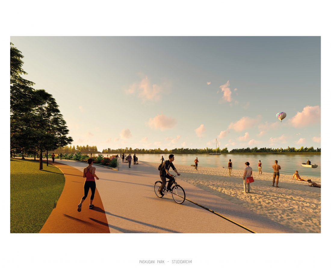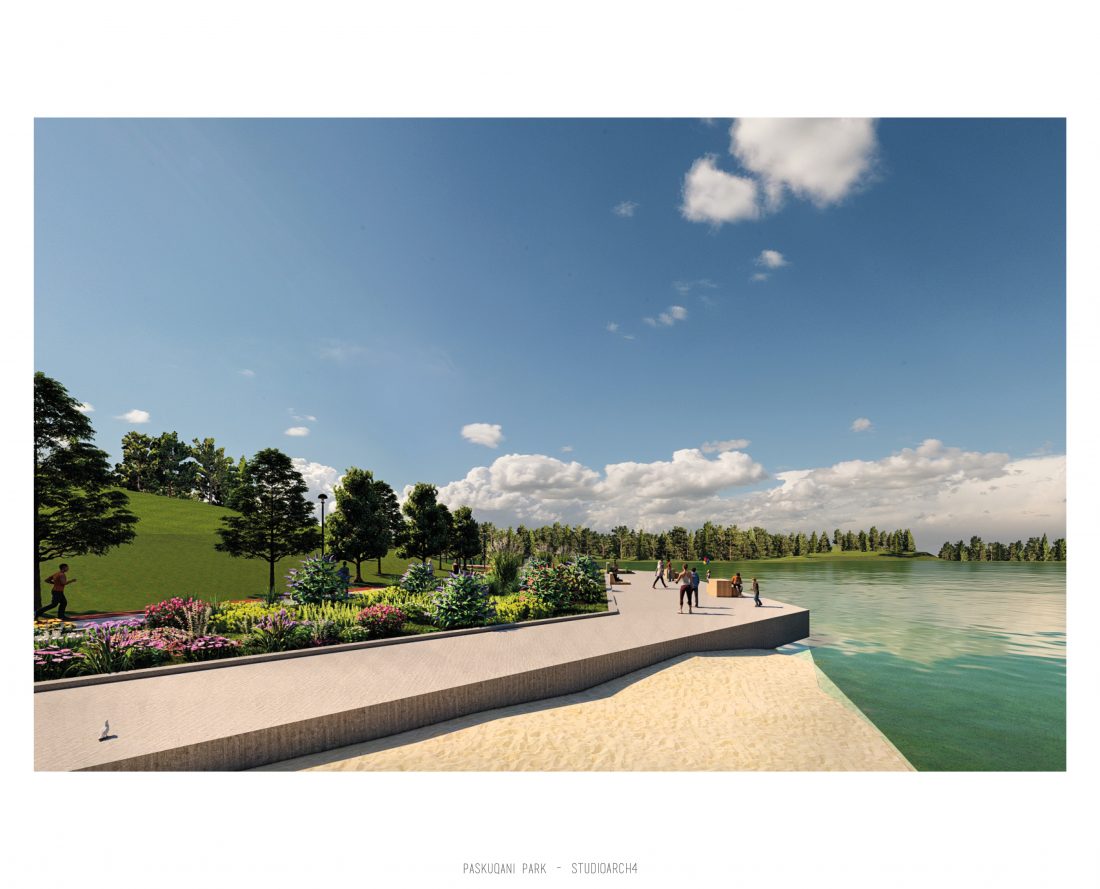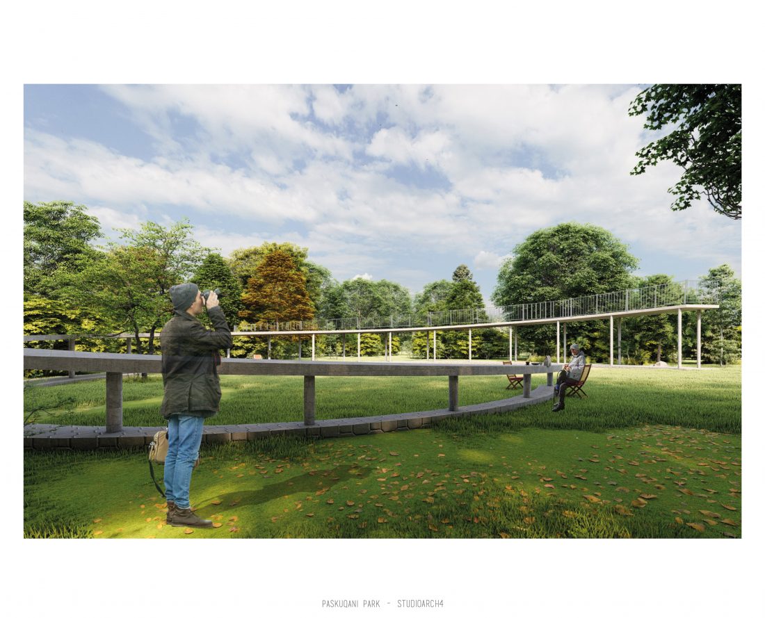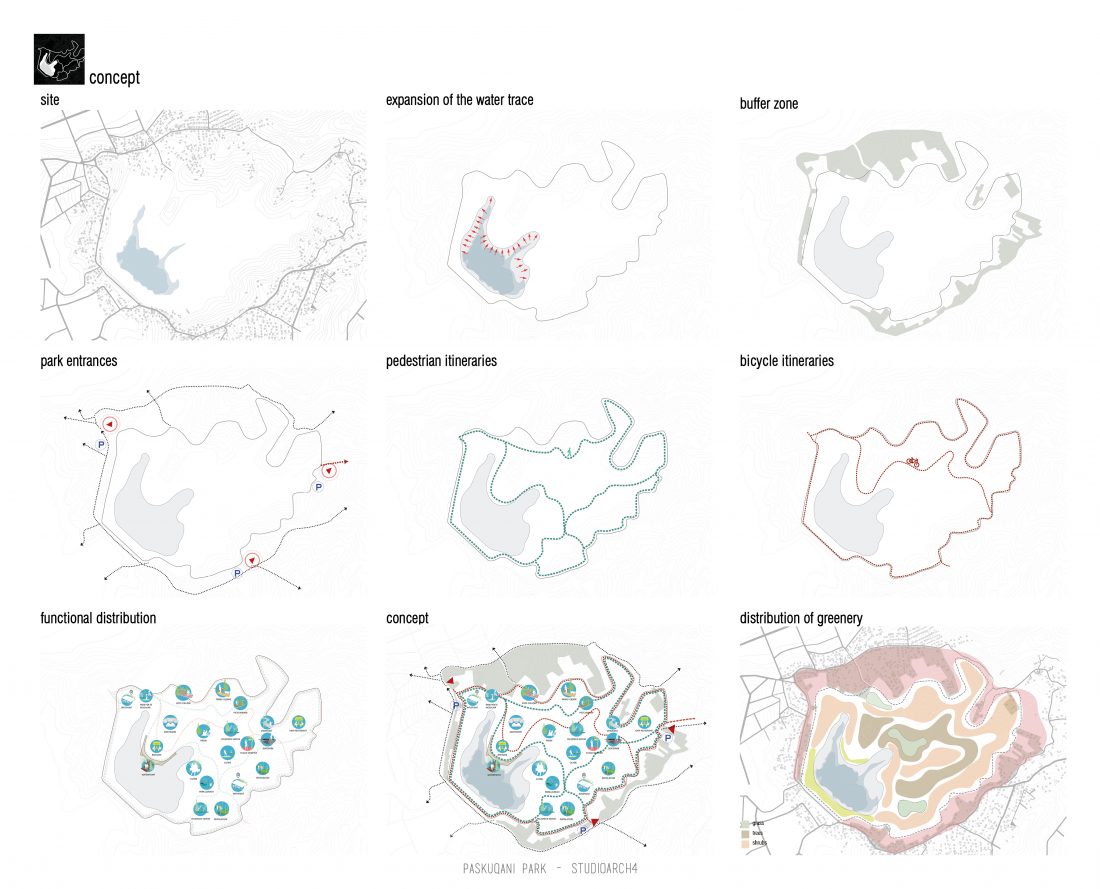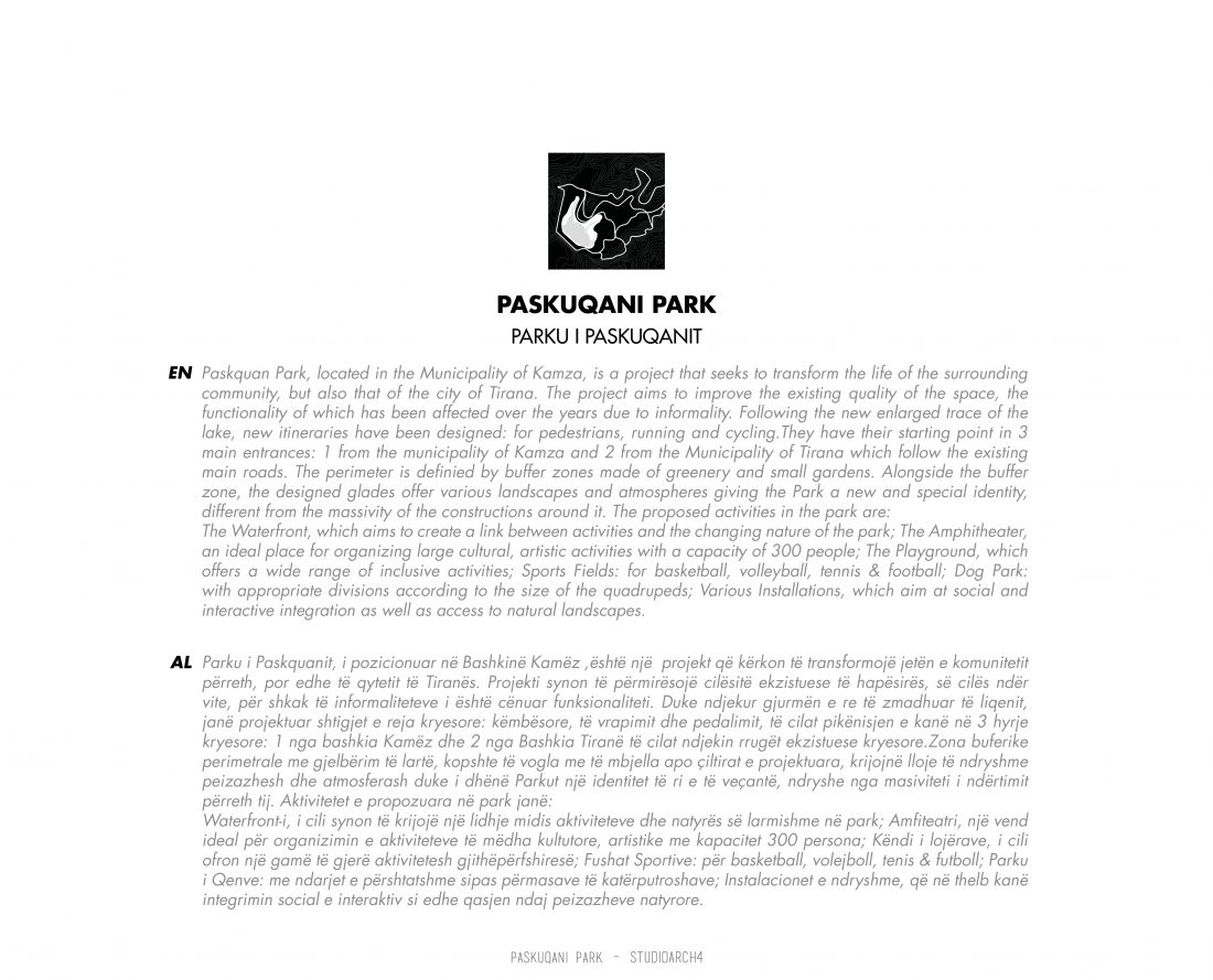 Paskquan Park, located in the Municipality of Kamza, is a project that seeks to transform the life of the surrounding community, but also that of the city of Tirana. The project aims to improve the existing quality of the space, the functionality of which has been affected over the years due to informality. Following the new enlarged trace of the lake, new itineraries have been designed: for pedestrians, running and cycling.They have their starting point in 3 main entrances: 1 from the municipality of Kamza and 2 from the Municipality of Tirana which follow the existing main roads. The perimeter is definied by buffer zones made of greenery and small gardens. Alongside the buffer zone, the designed glades offer various landscapes and atmospheres giving the Park a new and special identity, different from the massivity of the constructions around it. The proposed activities in the park are: