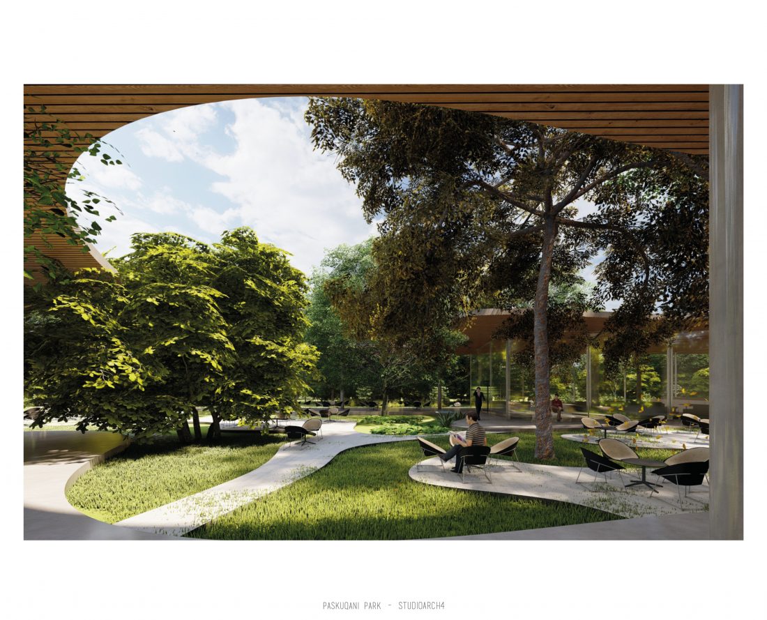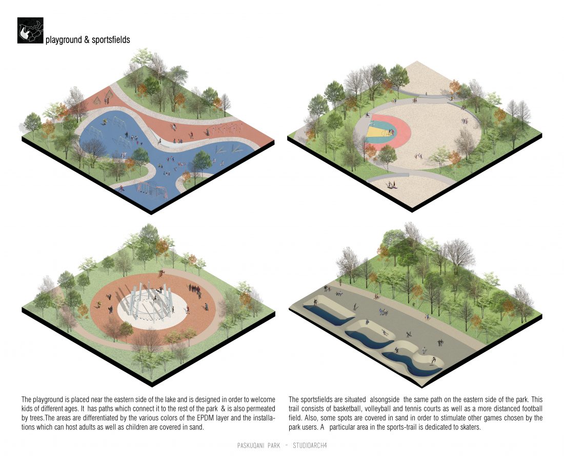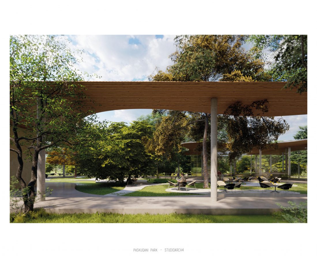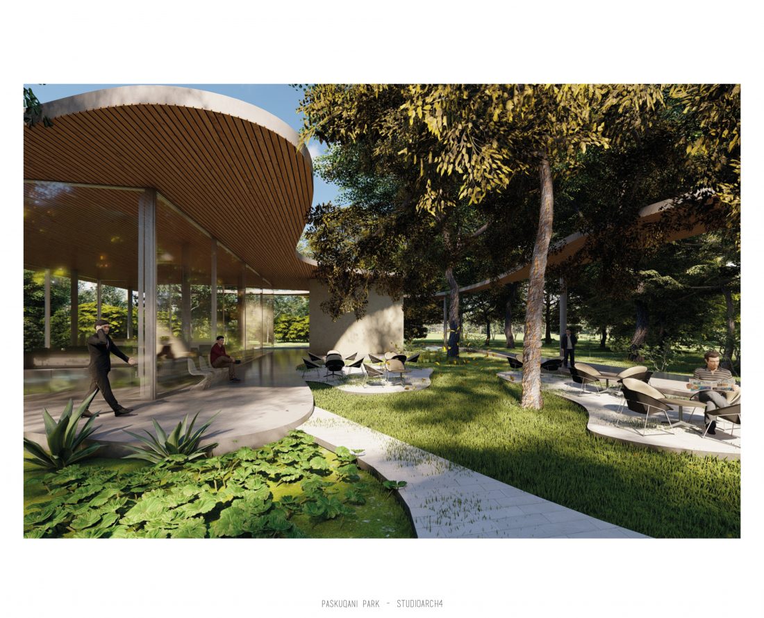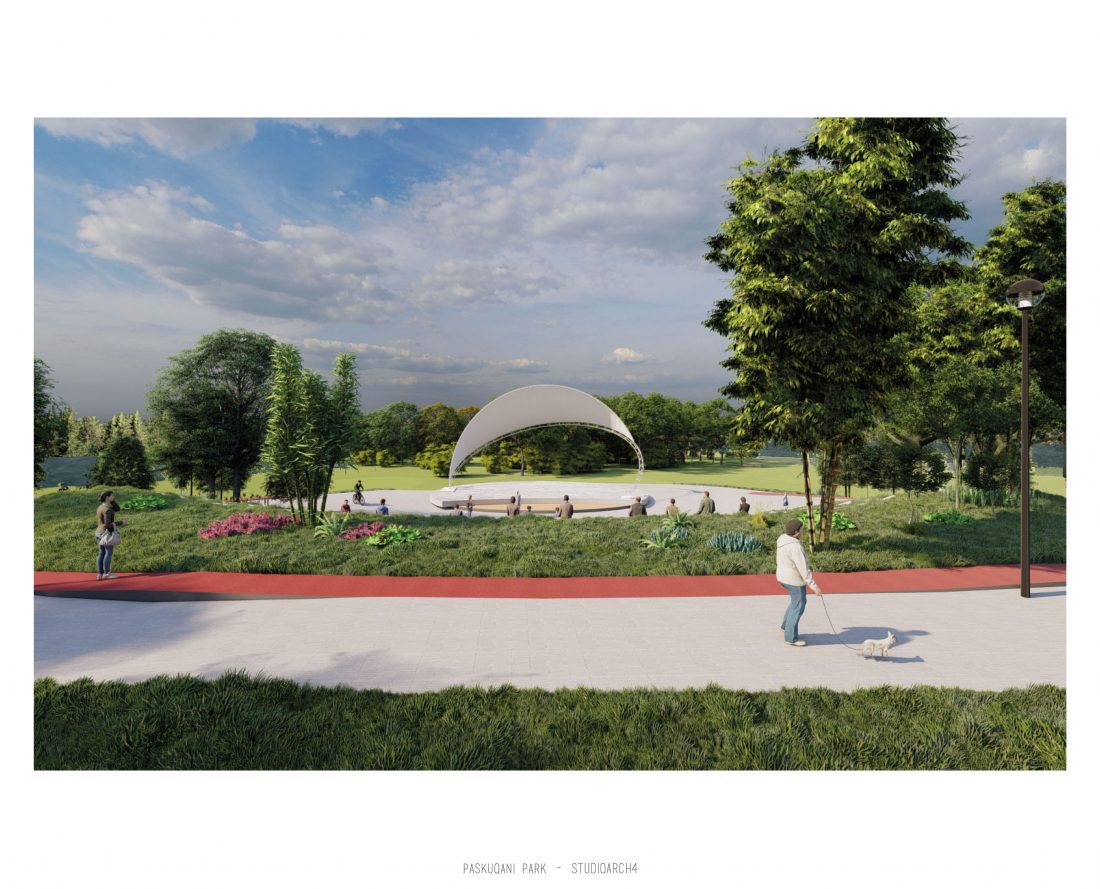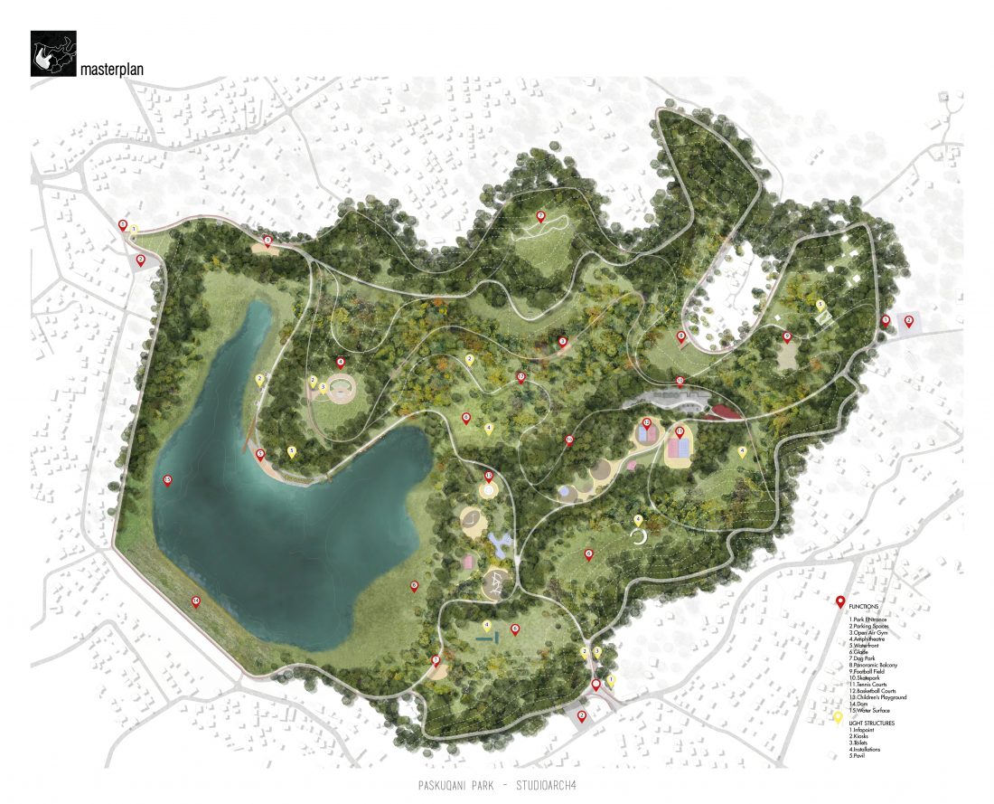 Paskquan Park, located in the Municipality of Kamza, is a project that seeks to transform the life of the surrounding community, but also that of the city of Tirana. The project aims to improve the existing quality of the space, the functionality of which has been affected over the years due to informality. Following the new enlarged trace of the lake, new itineraries have been designed: for pedestrians, running and cycling.They have their starting point in 3 main entrances: 1 from the municipality of Kamza and 2 from the Municipality of Tirana which follow the existing main roads. The perimeter is definied by buffer zones made of greenery and small gardens. Alongside the buffer zone, the designed glades offer various landscapes and atmospheres giving the Park a new and special identity, different from the massivity of the constructions around it. The proposed activities in the park are: