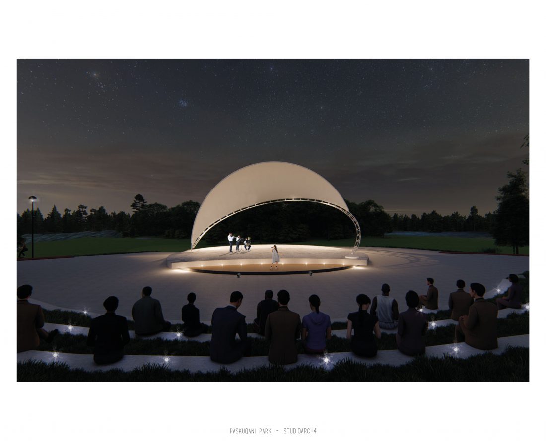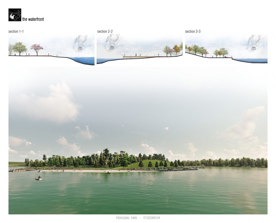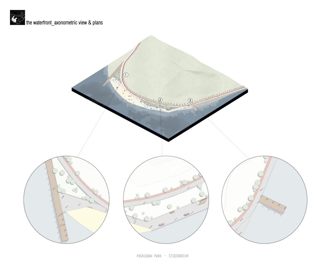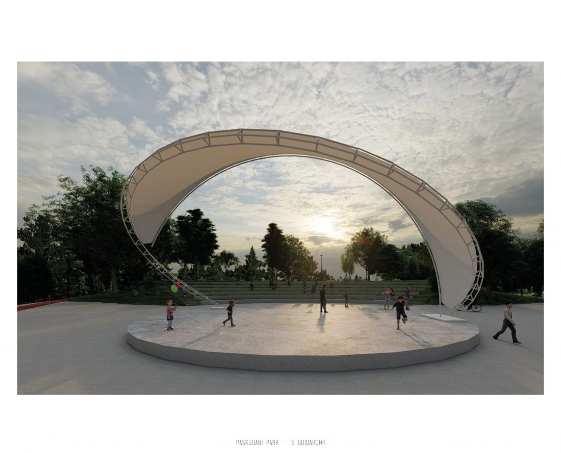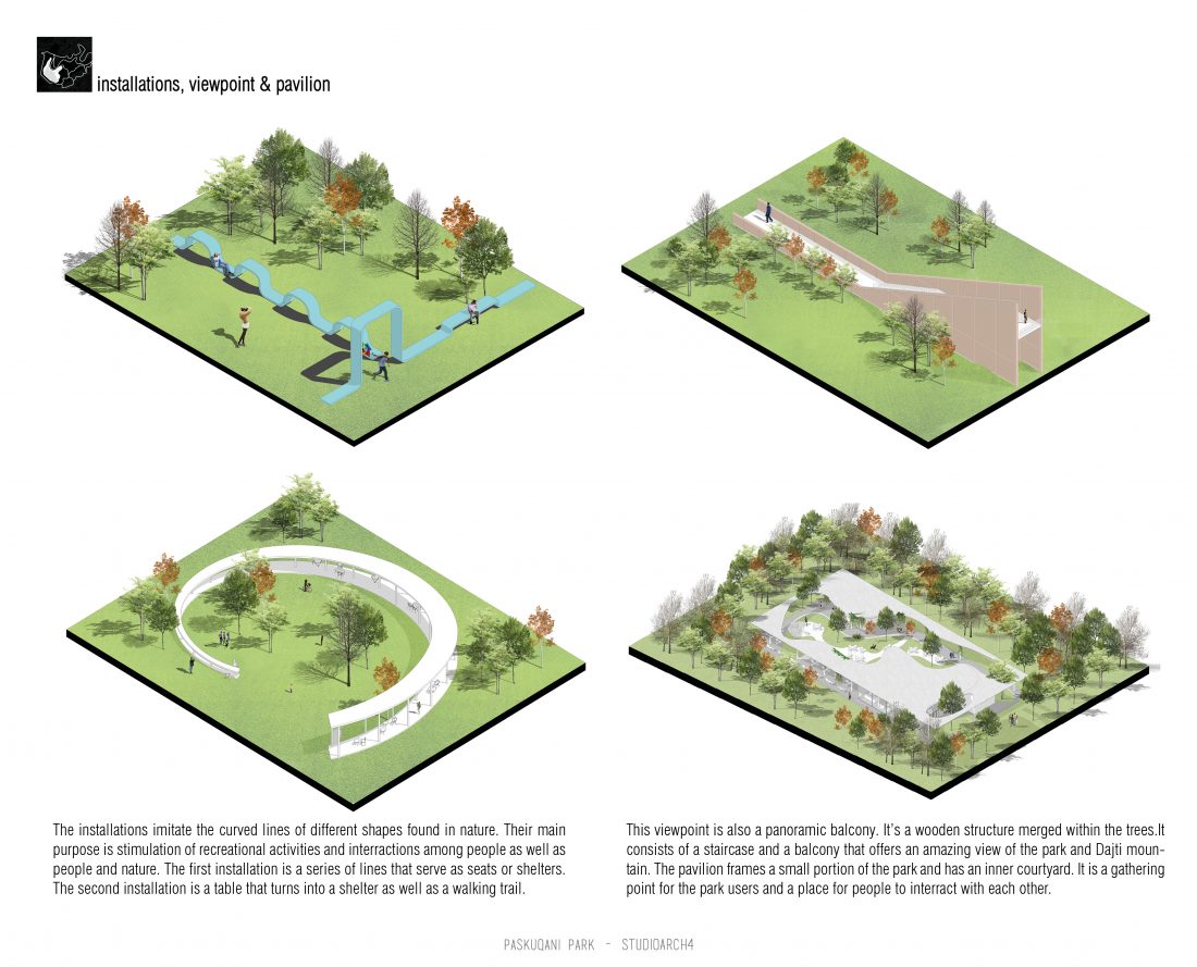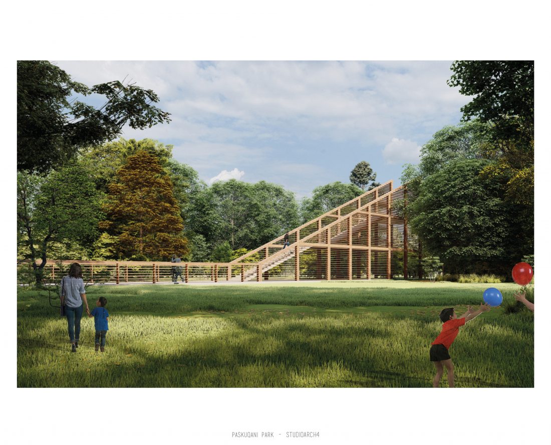 Paskquan Park, located in the Municipality of Kamza, is a project that seeks to transform the life of the surrounding community, but also that of the city of Tirana. The project aims to improve the existing quality of the space, the functionality of which has been affected over the years due to informality. Following the new enlarged trace of the lake, new itineraries have been designed: for pedestrians, running and cycling.They have their starting point in 3 main entrances: 1 from the municipality of Kamza and 2 from the Municipality of Tirana which follow the existing main roads. The perimeter is definied by buffer zones made of greenery and small gardens. Alongside the buffer zone, the designed glades offer various landscapes and atmospheres giving the Park a new and special identity, different from the massivity of the constructions around it. The proposed activities in the park are: