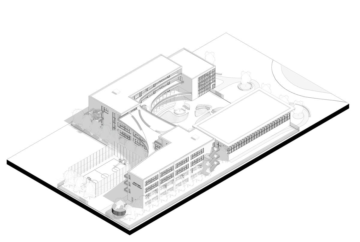Volumi kryesor është i ndarë në 2 objekte më të vogla 4-katëshe të pozicionuara pranë perimetrit të zonës, ku gjenden klasat. Ato janë të lidhura me një volum 3-katësh që përmban hapësira të tilla si laboratorët. Në volumin qëndror gjenden edhe zyrat administrative, duke lehtësuar mbikëqyrjen e studentëve. Në katin përdhe, volumi është i përshkrueshëm falë një kolonade që lidh 2 hyrjet e shkollës.