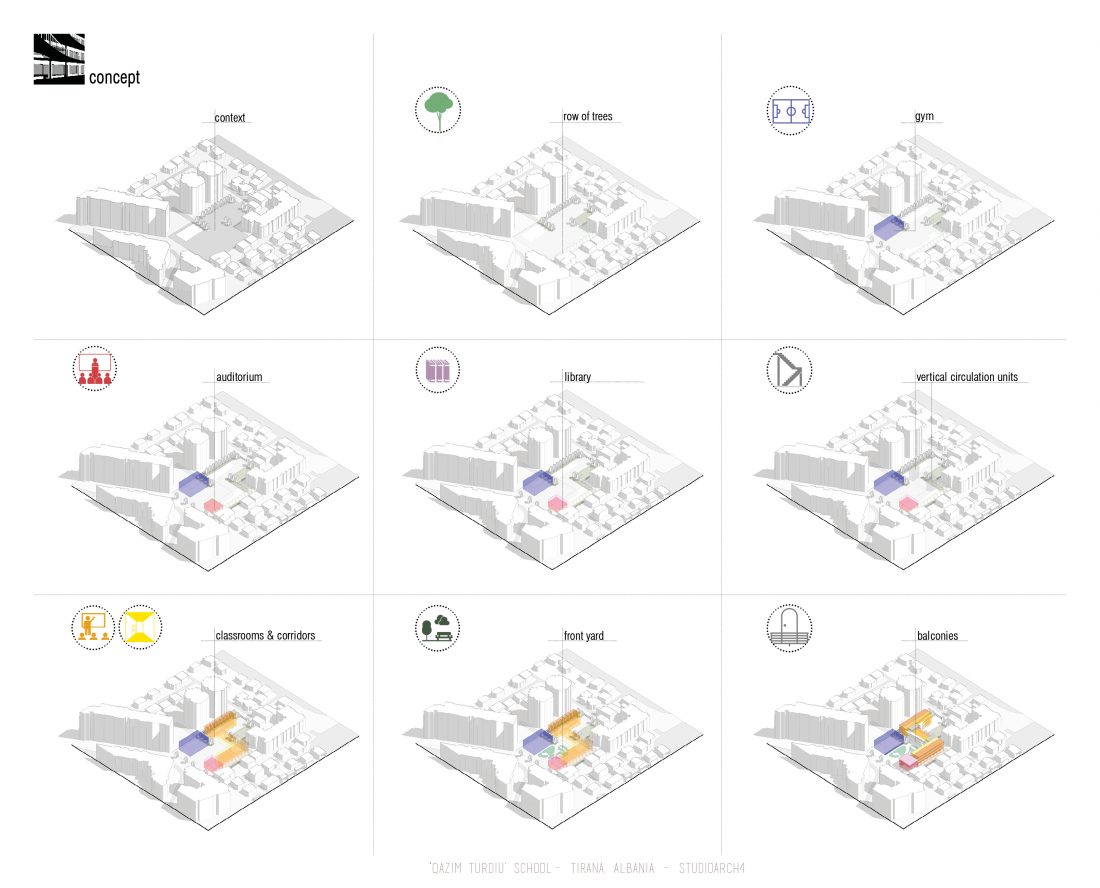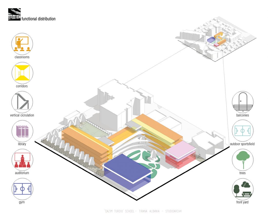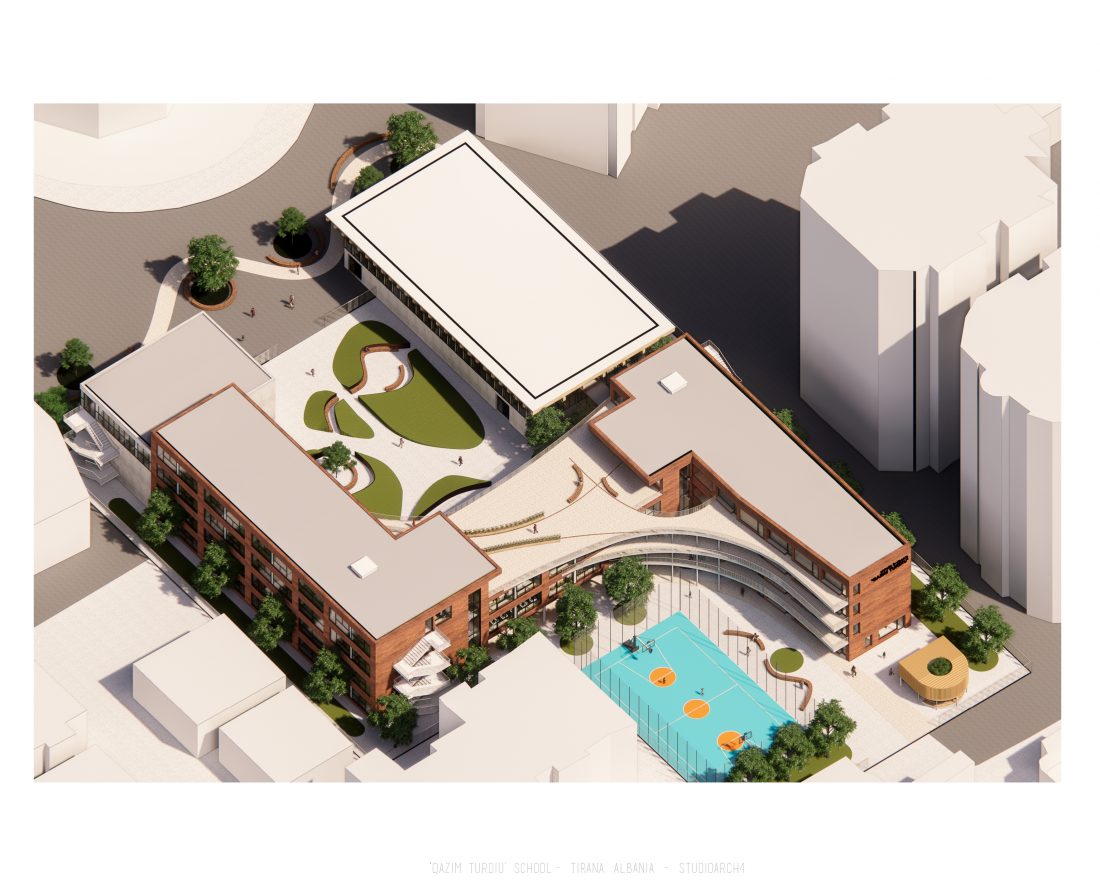 ‘Qazim Turdiu’ është një shkollë 9-vjeçare, ku do të mësojnë rreth 900 nxënës. Shkolla ofron hapësira të veçanta publike dhe komunitare. Marrëdhënia midis hapësirave të brendshme dhe të jashtme është unike falë vendosjes së korridoreve përkrah ballkoneve dhe oborreve të shkollës.