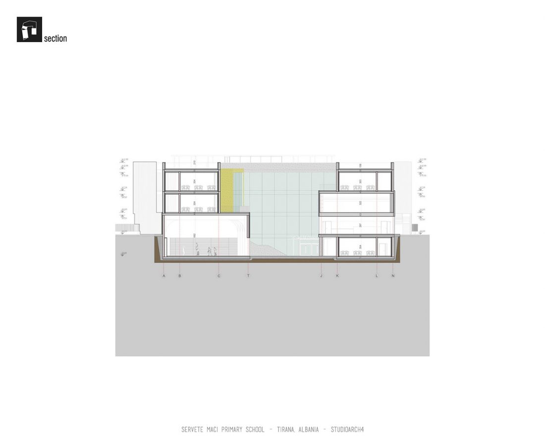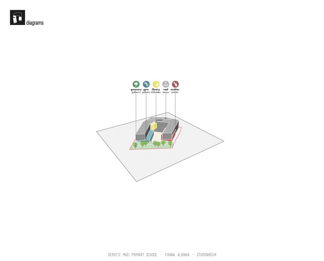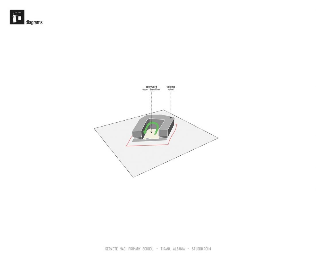 The volumetric concept of the design is based on the internal courtyard as a main feature. The whole shape of the school revolves around this courtyard. As a results, classes are positioned facing the internal courtyard therefore creating a quitter teaching space. Halls are positioned in the outer perimeter of the building.